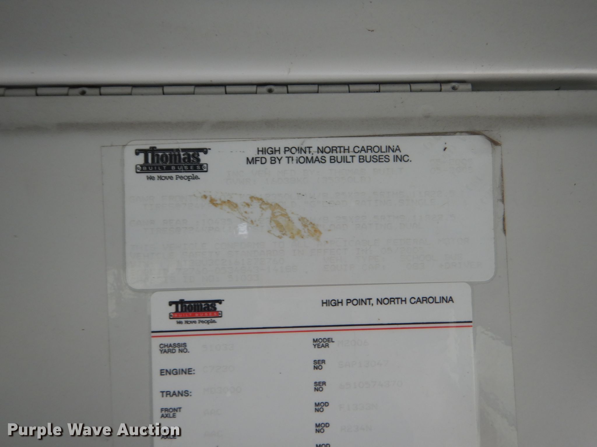 2006 Thomas Built Saf-T-Liner MVP EF school bus. 124,993 miles on odometer, Engine hours: 15,416, Unit #: 525. Engine Caterpillar C7, Displacement: 7.2L, Cylinders: 6, Fuel type: Diesel. Transmission Automatic. Chassis Axles: Single, Suspension: Air, Brakes: Air, GVWR: 35,350 lbs. Interior AC, Heat, Heated mirrors, Electric passenger sliding door, Passengers: 83, Seats Adult seats: 28. Tires Size: 11R22.5. Iowa title. Seller is a government entity who will be assigning and distributing the title. Please contact the seller for distribution questions. 1T88U3C2161272760. Des Moines Public Schools. 1225 2nd Ave. Des Moines, IA 50314