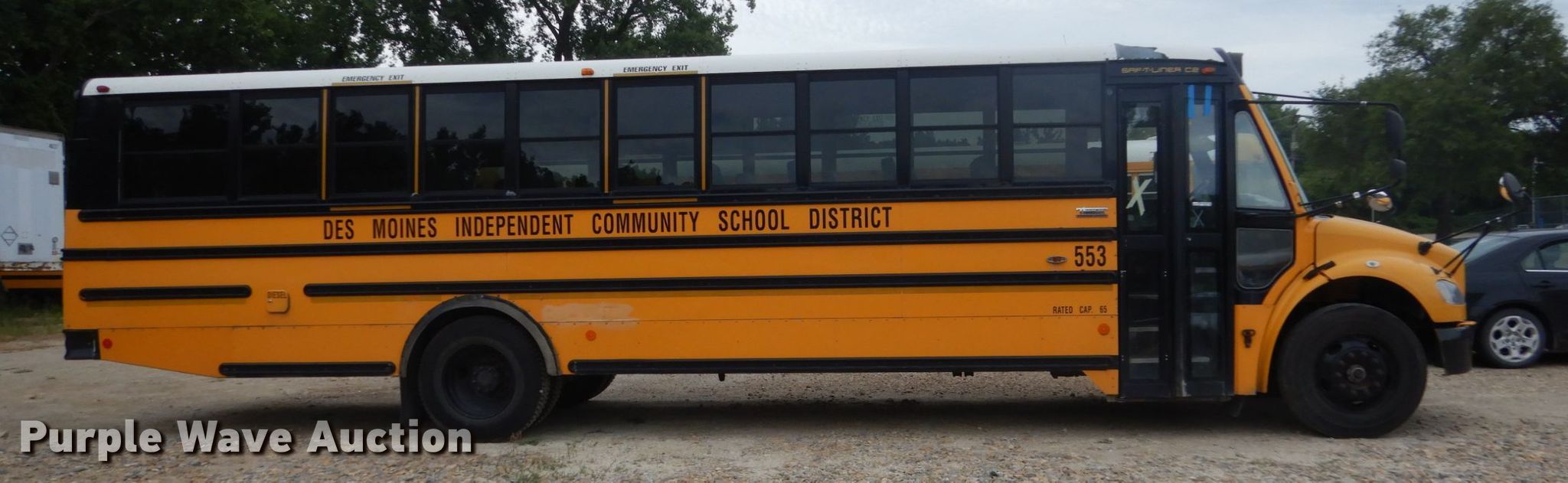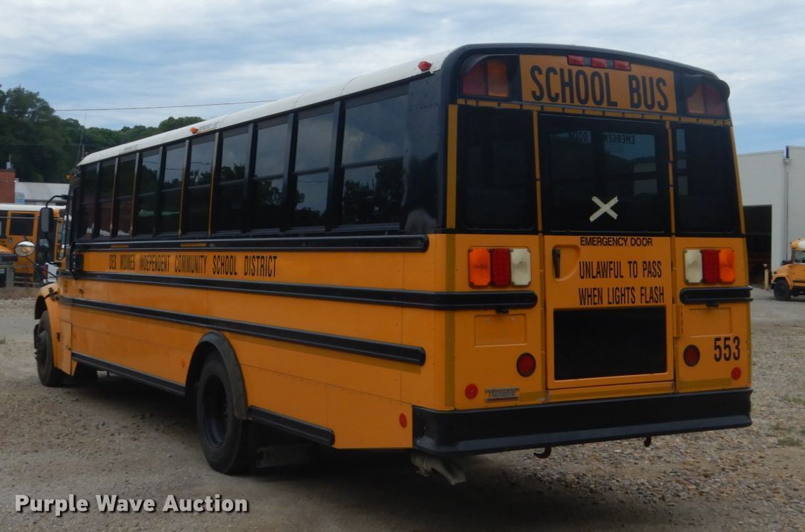 2009 Freightliner Thomas Built school bus. 166,565 miles on odometer, Engine hours: 12,351, Unit #: 553. Engine Cummins ISB-07, Displacement: 6.7L, Cylinders: 6, Fuel type: Diesel. Transmission Automatic. Chassis Axles: Single, Suspension: Air, Brakes: Air, GVWR: 29,000 lbs. Interior AC, Heat, Heated mirrors, Electric passenger sliding door, Passengers: 65, Seats Adult seats: 22. Tires Size: 10R22.5. Iowa title. Seller is a government entity who will be assigning and distributing the title. Please contact the seller for distribution questions. 4UZABRDT59CAE1897. Des Moines Public Schools. 1225 2nd Ave. Des Moines, IA 50314