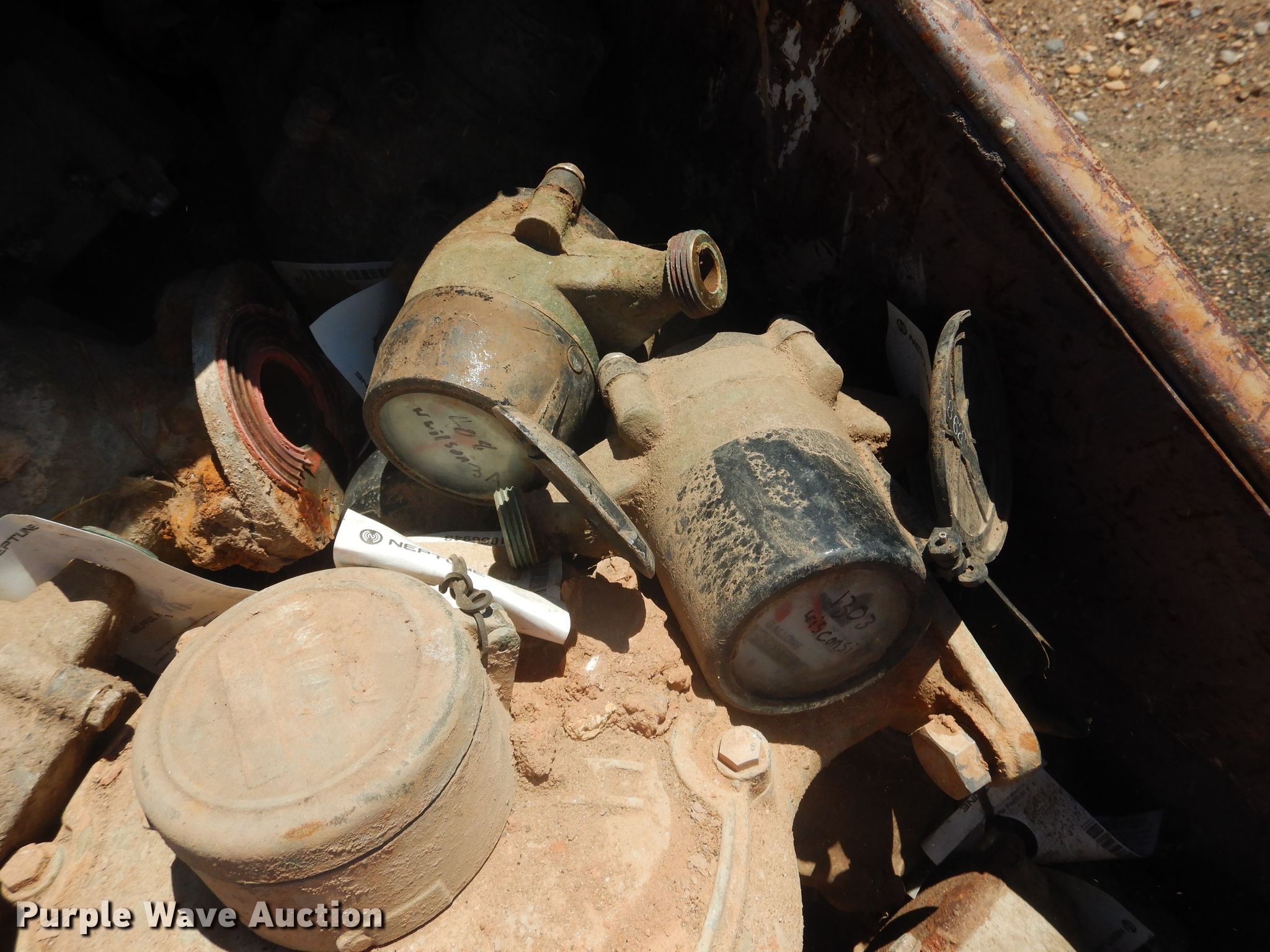 Purple Wave is selling a used Tools in Texas. This item is a Brass water meters with the following: 1/2" to 2", Dumpster not included