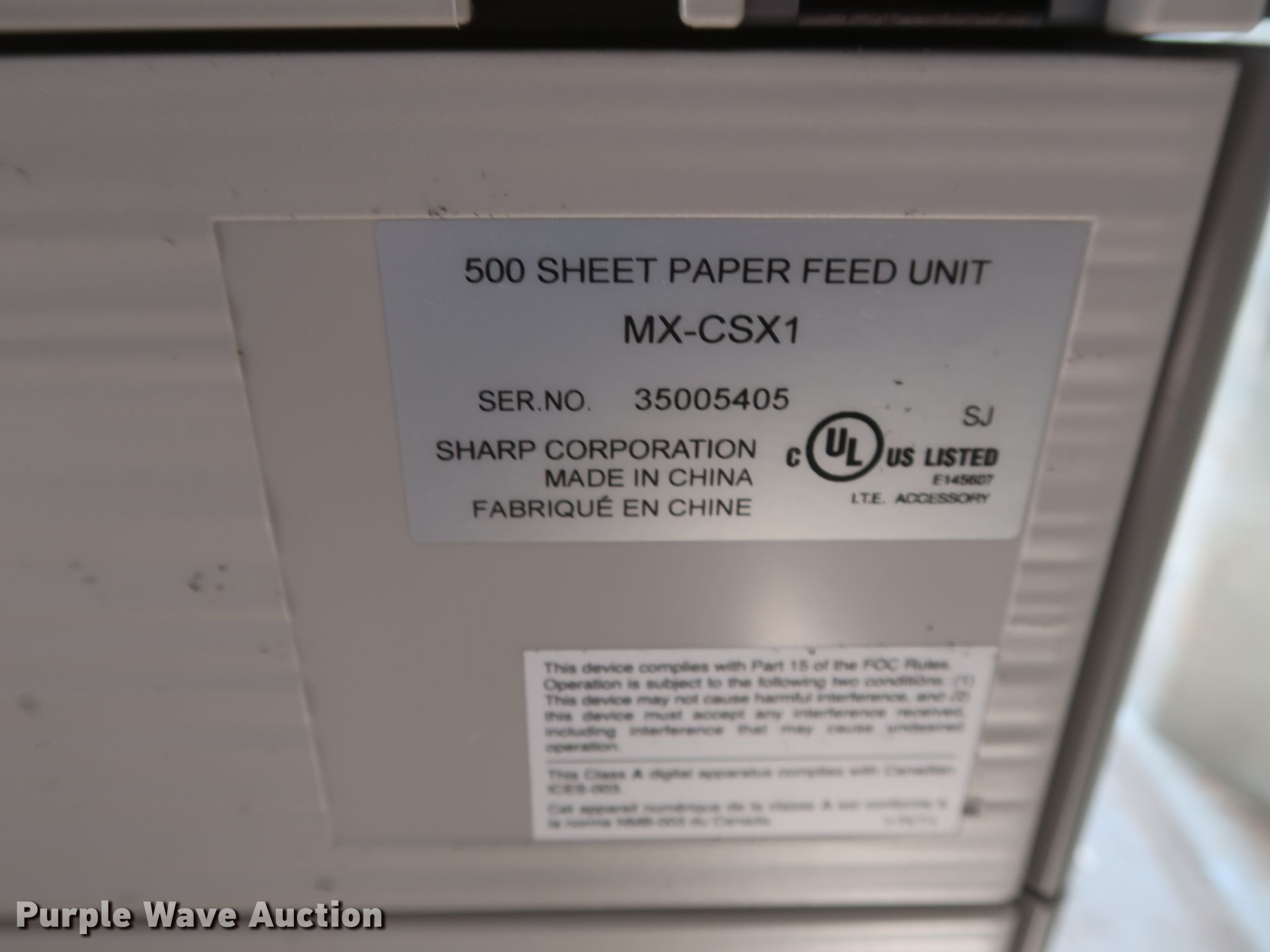 Purple Wave is selling a used Electronics in Oklahoma. This item is a 2013 Sharp MX-B402SC digital multi-fuctional system with the following: MX-FXX3 facsimile expansion kit, MX-CSX1 500 sheet paper feed unit, Serial 35008134
