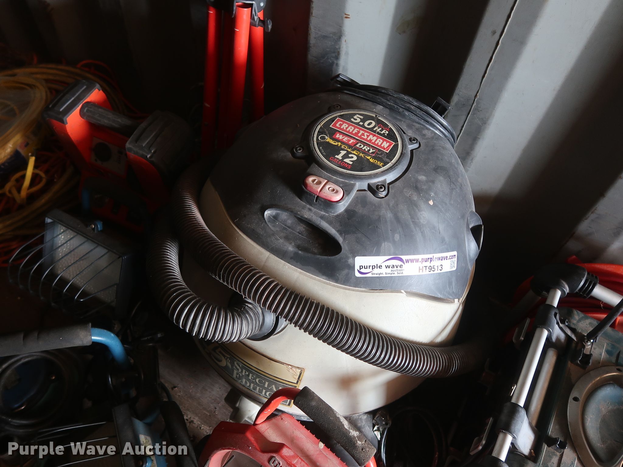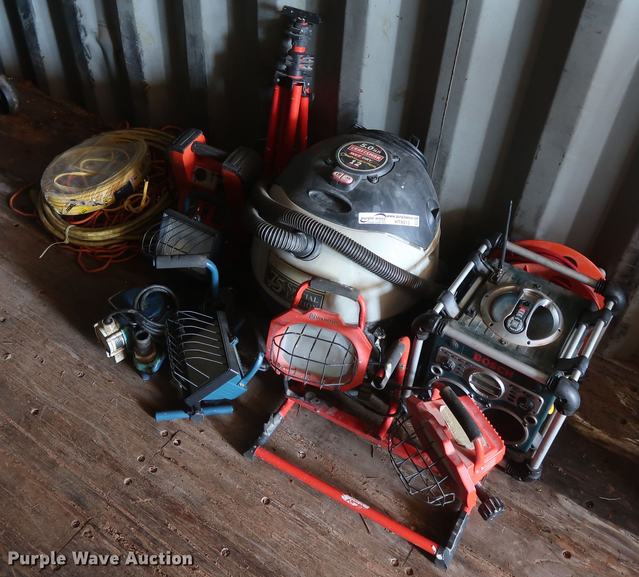 Purple Wave is selling a used Tools in Oklahoma. This item is a Tools with the following: Bosch radio, Craftsman wet/dry vacuum, (2) shop lights, Black & Decker jump pack, Extension cords