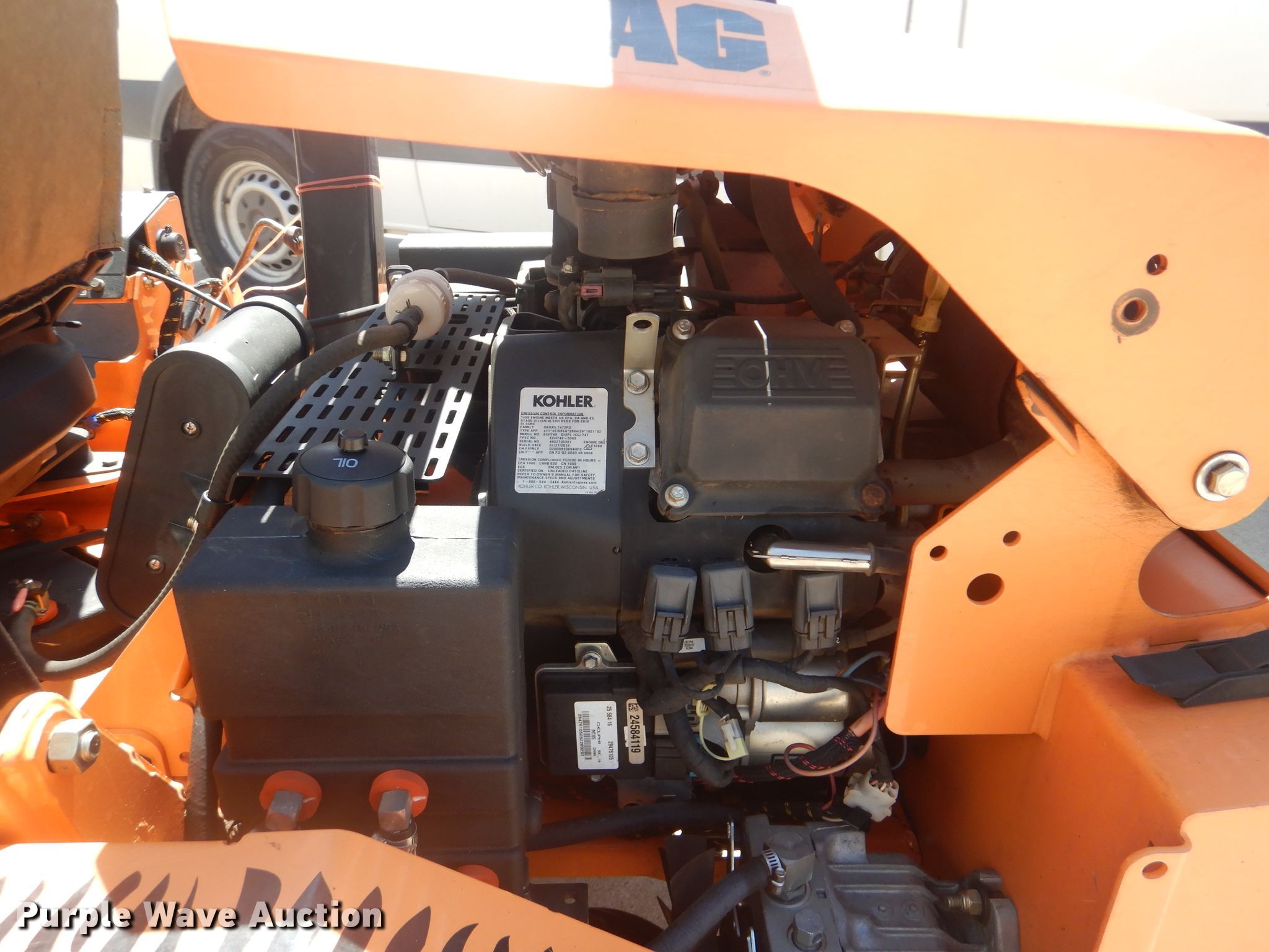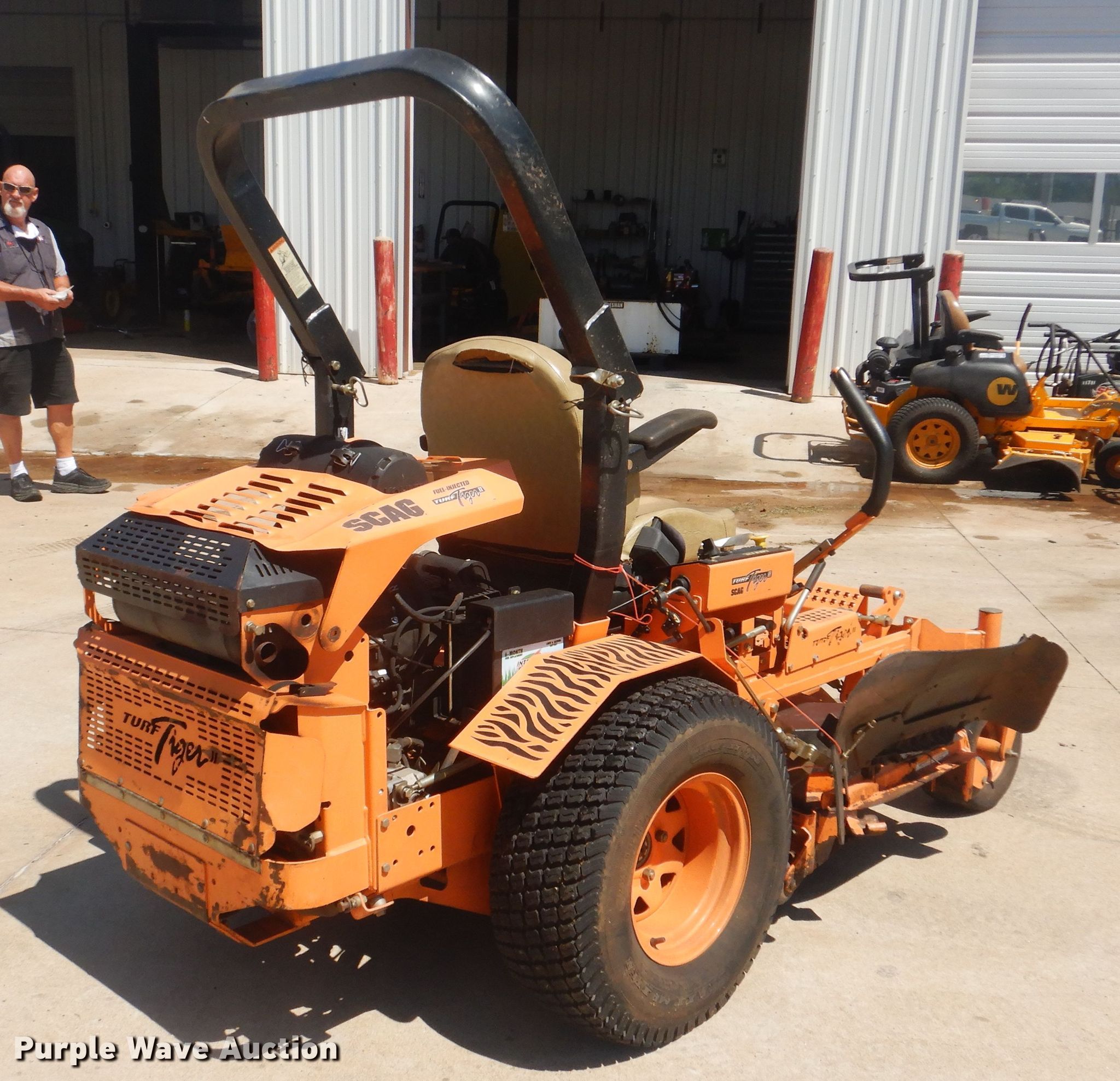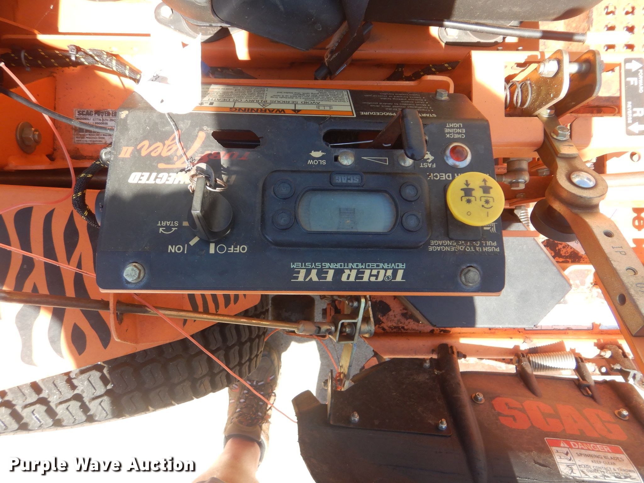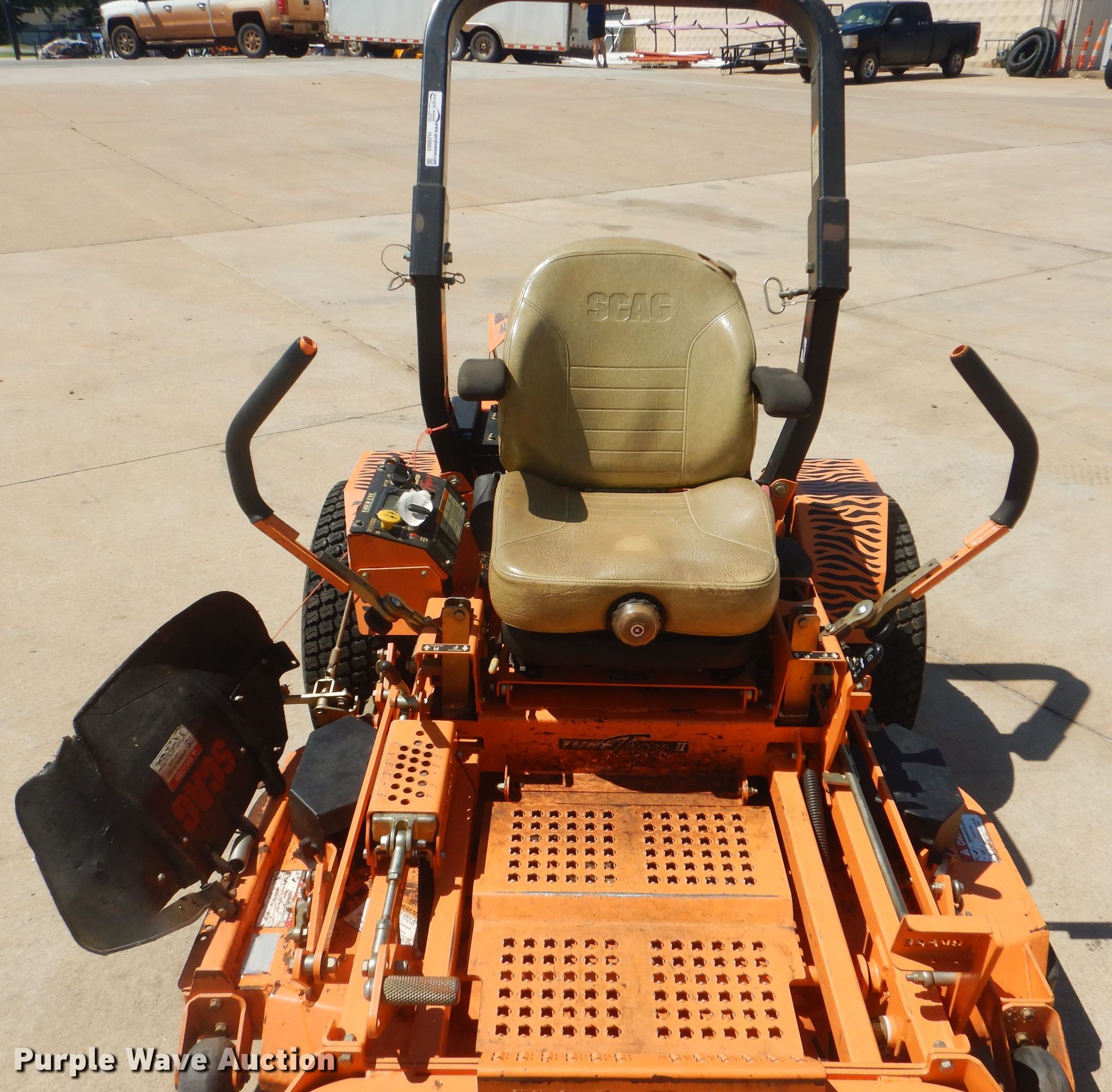 Purple Wave is selling a used Lawn Mower in Oklahoma. This item is a Scag Turf Tiger II ZTR lawn mower with the following: 1,680 hours on meter, 52" cut, Kohler GKHXS.7472PD 747cc two cylinder gas engine, 25 HP, Serial 4602705361, Hydrostatic transmission, OROPS, Scag Velocity Plus mower deck, 13x6.5-6 front tires, 26x9.5x12 rear tires, Serial L99000056
