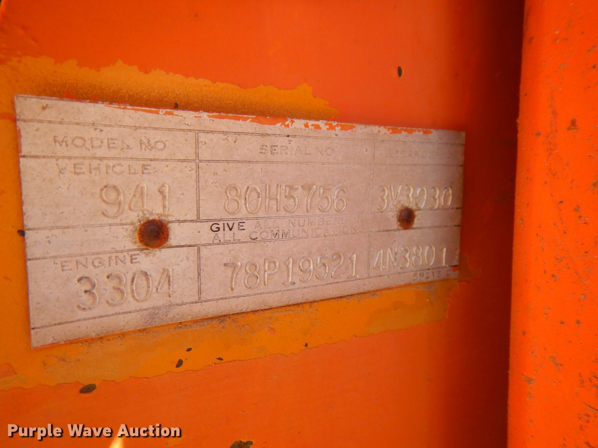 1976 Caterpillar 941B track loader. 246 hours on meter, Hour meter replaced at 2,799 hours, Serial: 80H5756. Engine Caterpillar 3304, Serial: 78P19521, Cylinders: 4, Fuel type: Diesel. Transmission Powershift, 3F - 3R. Operators station EROPS Heat, Bucket controls: Two-lever. Operational Bucket Width: 81", Cutting edge: Weld-on Teeth: 8.. Tracks Width: 13", Grouser pads: Double. Notes Windshield chipped or cracked. 4802 County Rd E. Tekamah, NE 68061