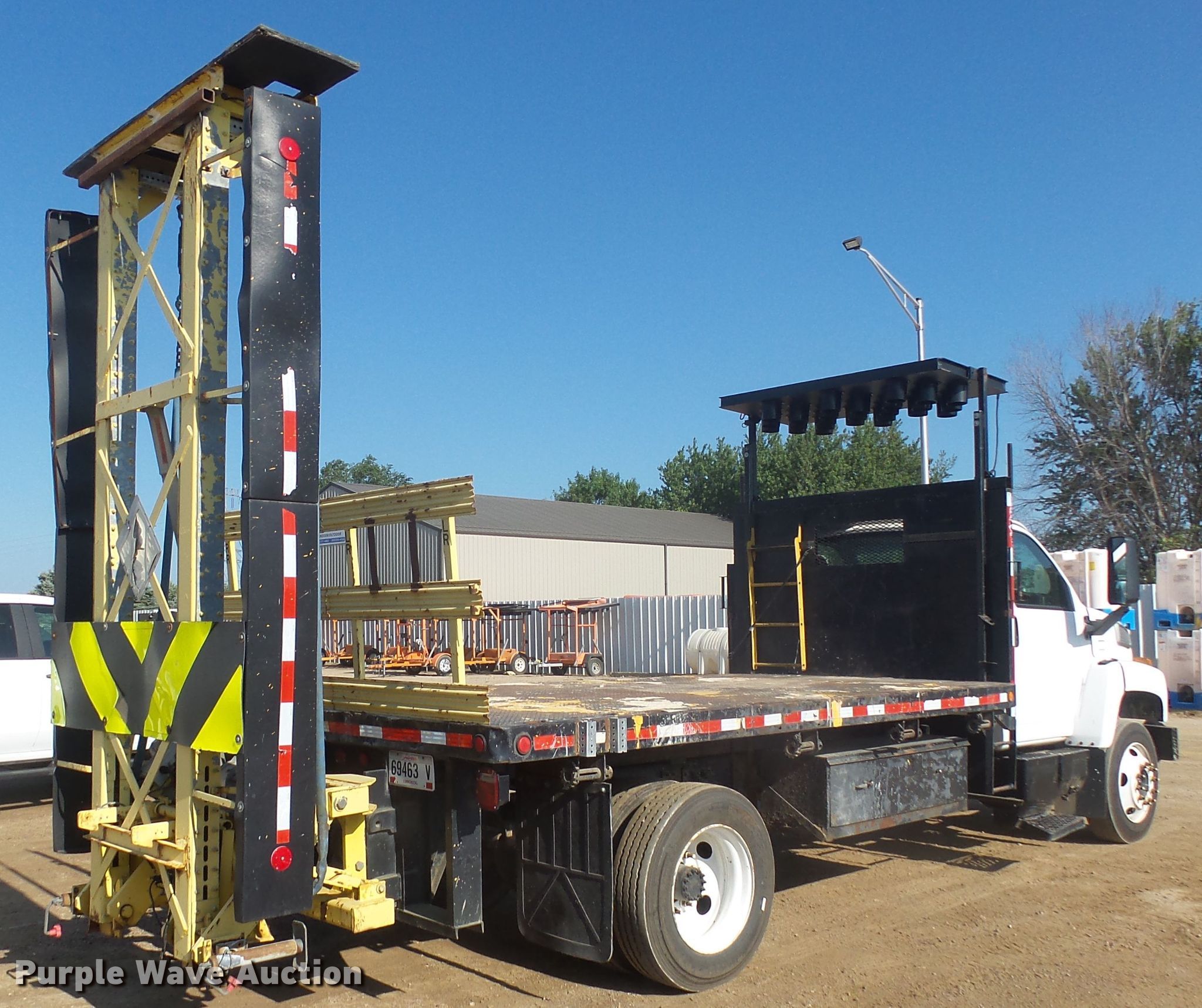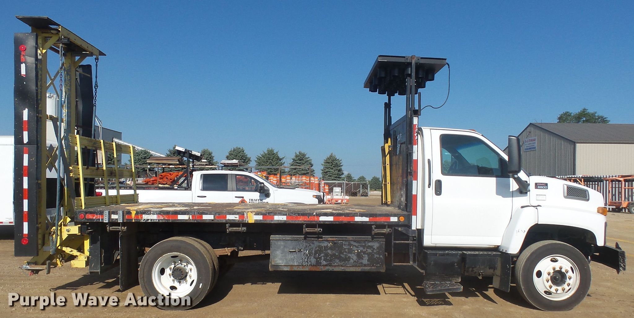 2003 GMC 6500 flatbed truck. 226,116 miles on odometer, Engine hours: 5,361. Engine Displacement: 8.1L, Cylinders: 8, Fuel type: Gas. Transmission Automatic. Chassis Axles: Single, Suspension: Spring, Brakes: Hydraulic, GVWR: 11,630 lbs, Wheelbase: 180". Interior AC, Heat, Power windows, Power locks. Operational Flatbed Length: 14', Width: 96", Crash attenuator, Wanco arrow board. Tires Front: 255/70R22.5, Rear: 275/70R22.5. South Dakota title. Title distribution may be delayed up to 14 days from verification of funds. 1GDJ6J1E73F900233. Traffic Solutions. 27297 Kenworth Pl. Harrisburg, SD 57032