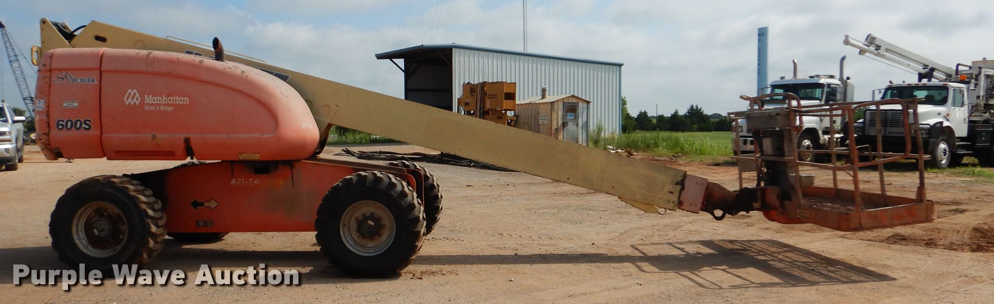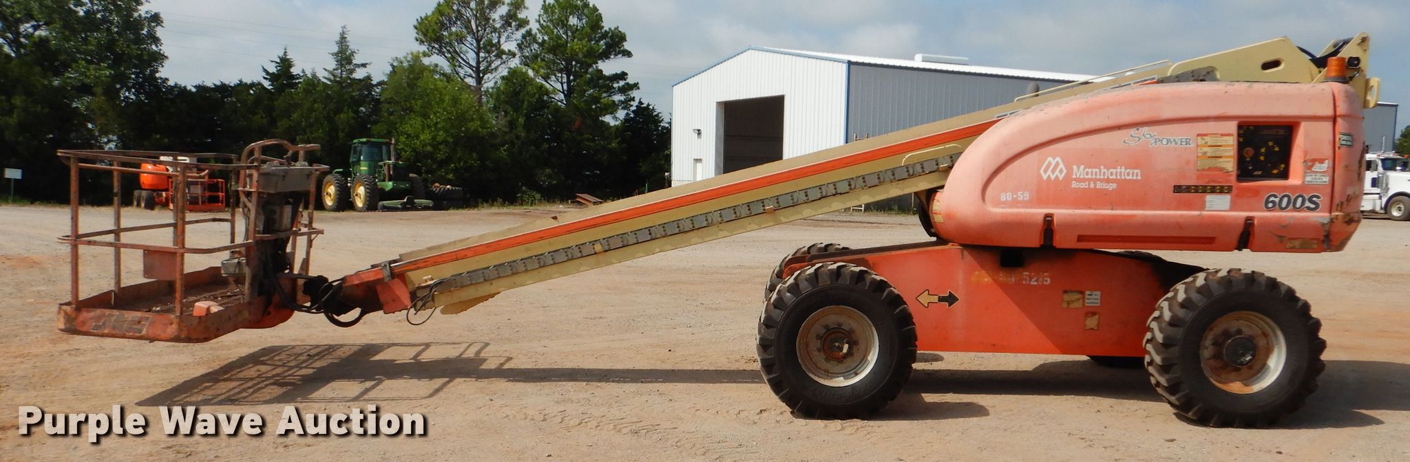 2005 JLG 600S boom lift. 7,798 hours on meter, Serial: 0306086931, Unit #: 80-59. Engine Deutz, Displacement: 2.9L, Cylinders: 4, Fuel type: Diesel, HP: 48.8. Chassis Four wheel drive. Operational Rough terrain, Maximum lift capacity: 1,000 lbs, Maximum reach length: 49' 6", Maximum lift height: 60', Platform: 72" L x 36" W, Controls: Platform, Ground, Travel speed: 3.8 mph, Certification valid through: 04/2021. Tires Tire size: 15-19.5 NHS. Manhattan Road & Bridge. 26775 County Rd 110. Perry, OK 73077
