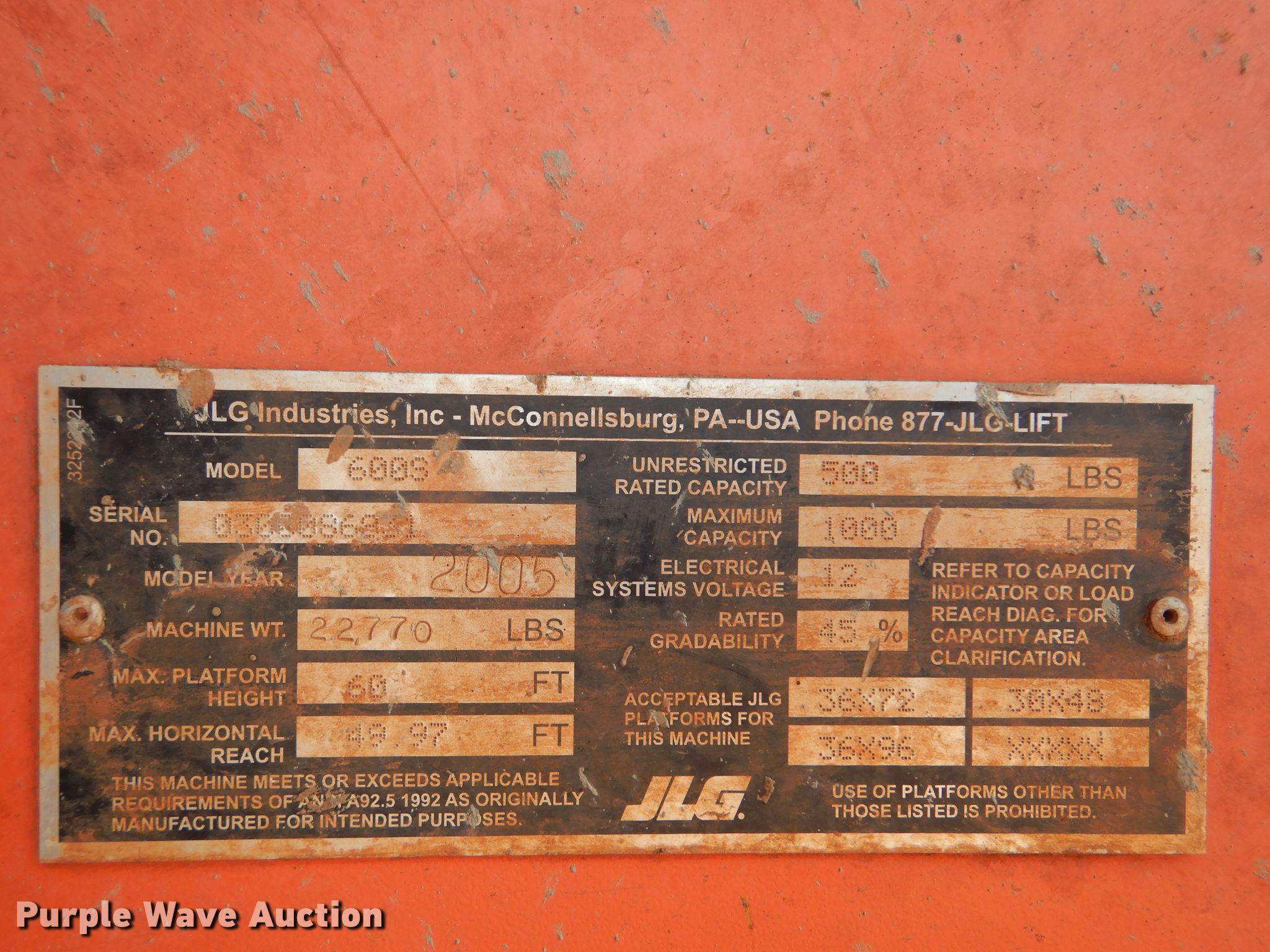 Purple Wave is selling a used Boom Lift in Oklahoma. This item is a 2005 JLG 600S boom lift with the following: 7,798 hours on meter, Serial: 0306086931, Unit #: 80-59