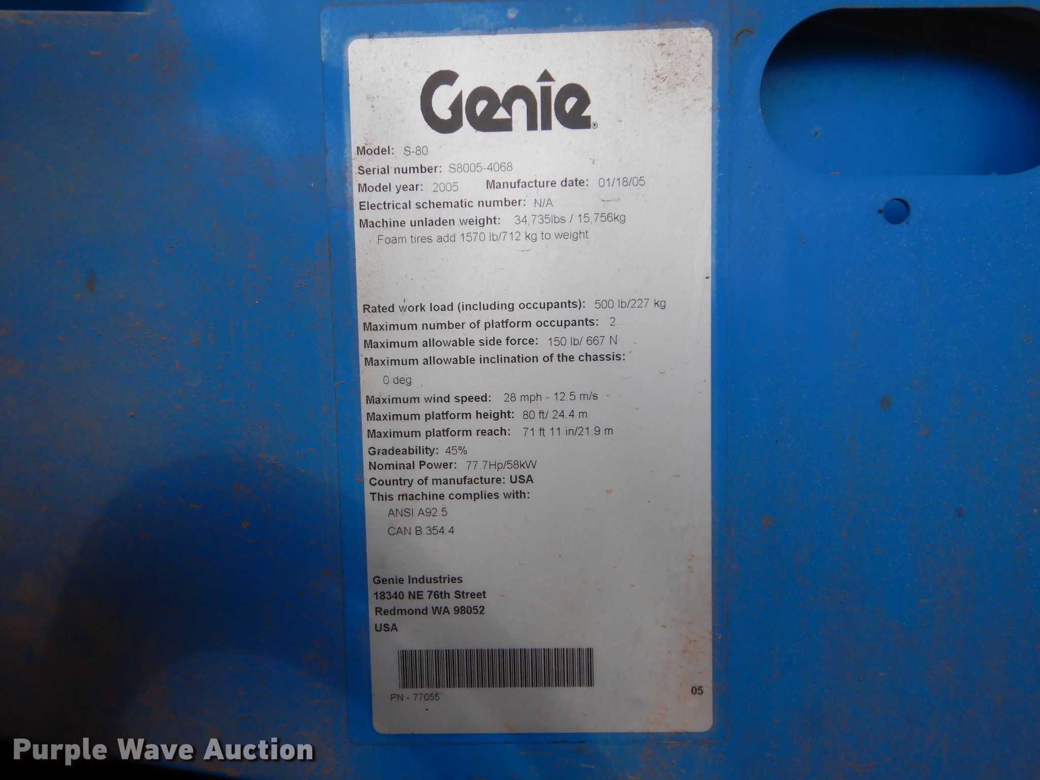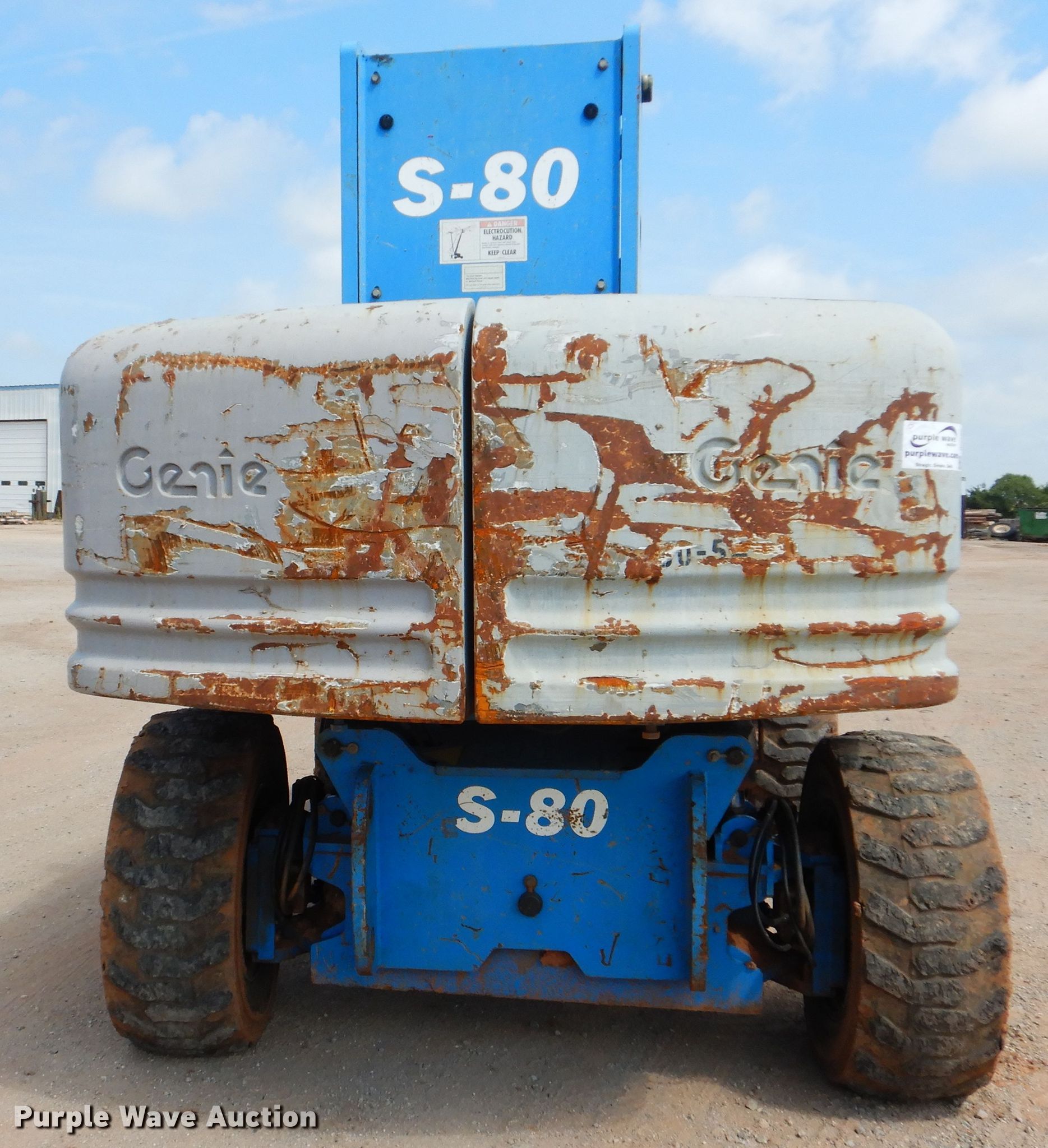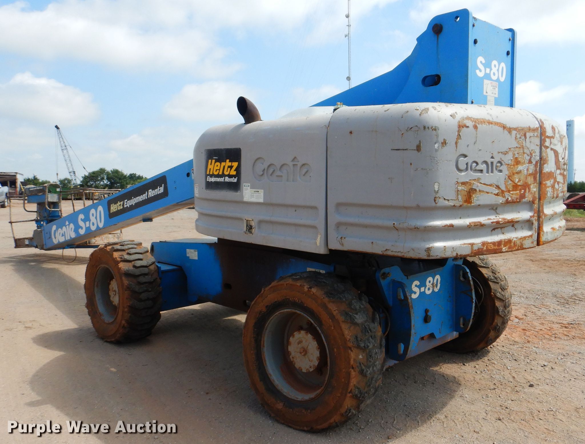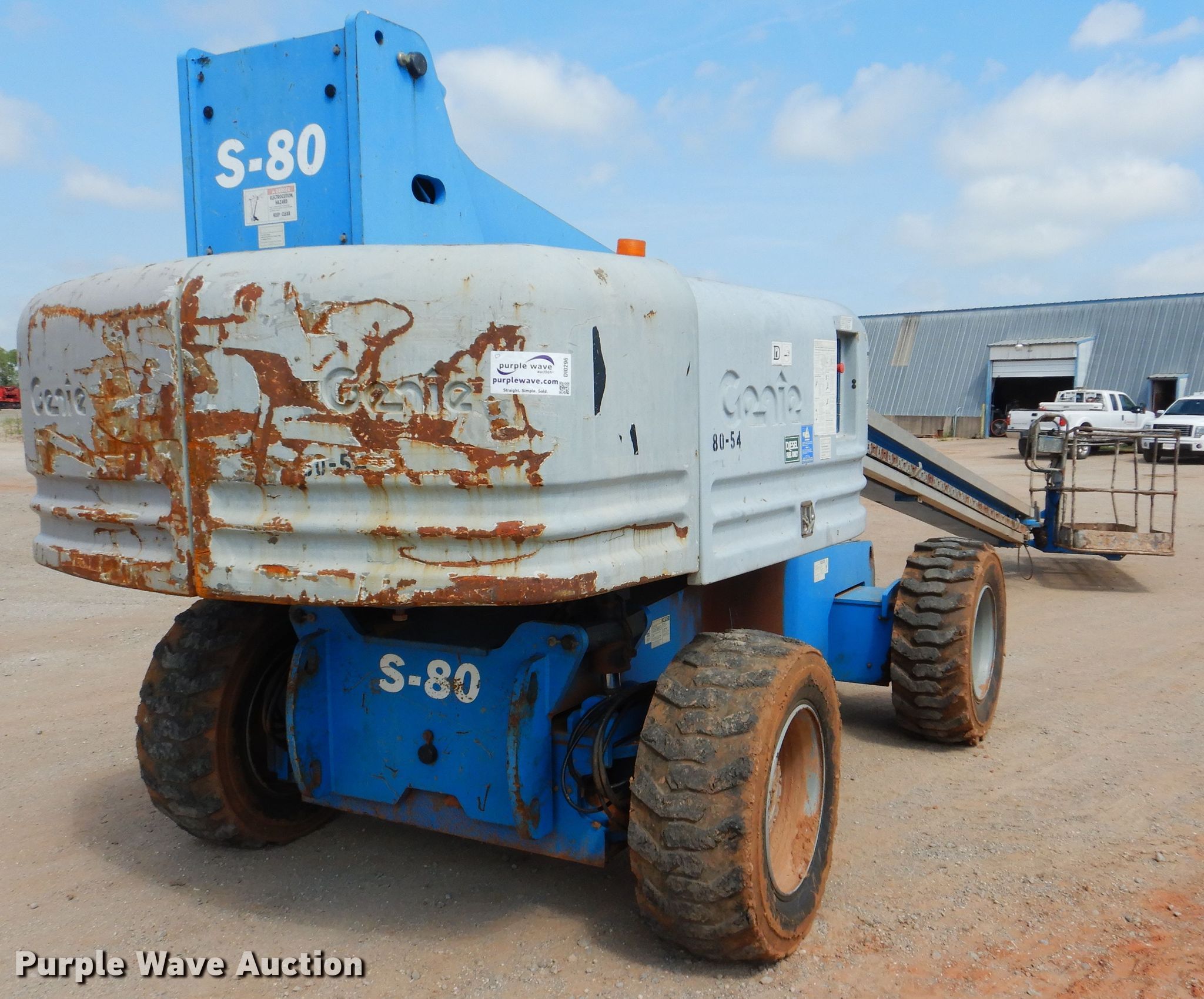 Purple Wave is selling a used Boom Lift in Oklahoma. This item is a 2008 Genie S-80 boom lift with the following: 1,595 hours on meter, Serial: S8005-4068, Unit #: 80-54