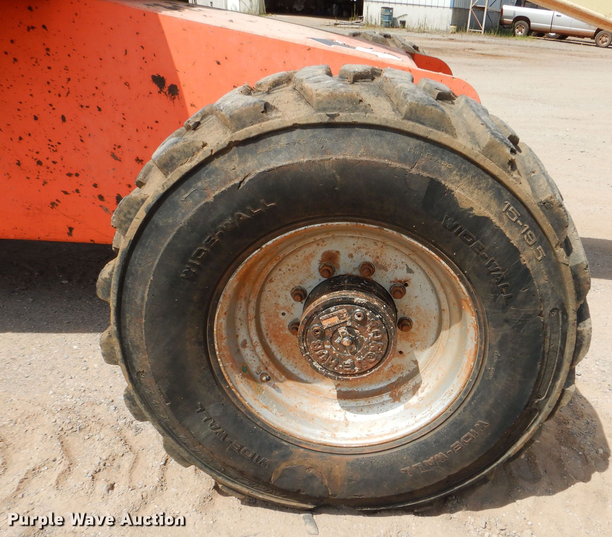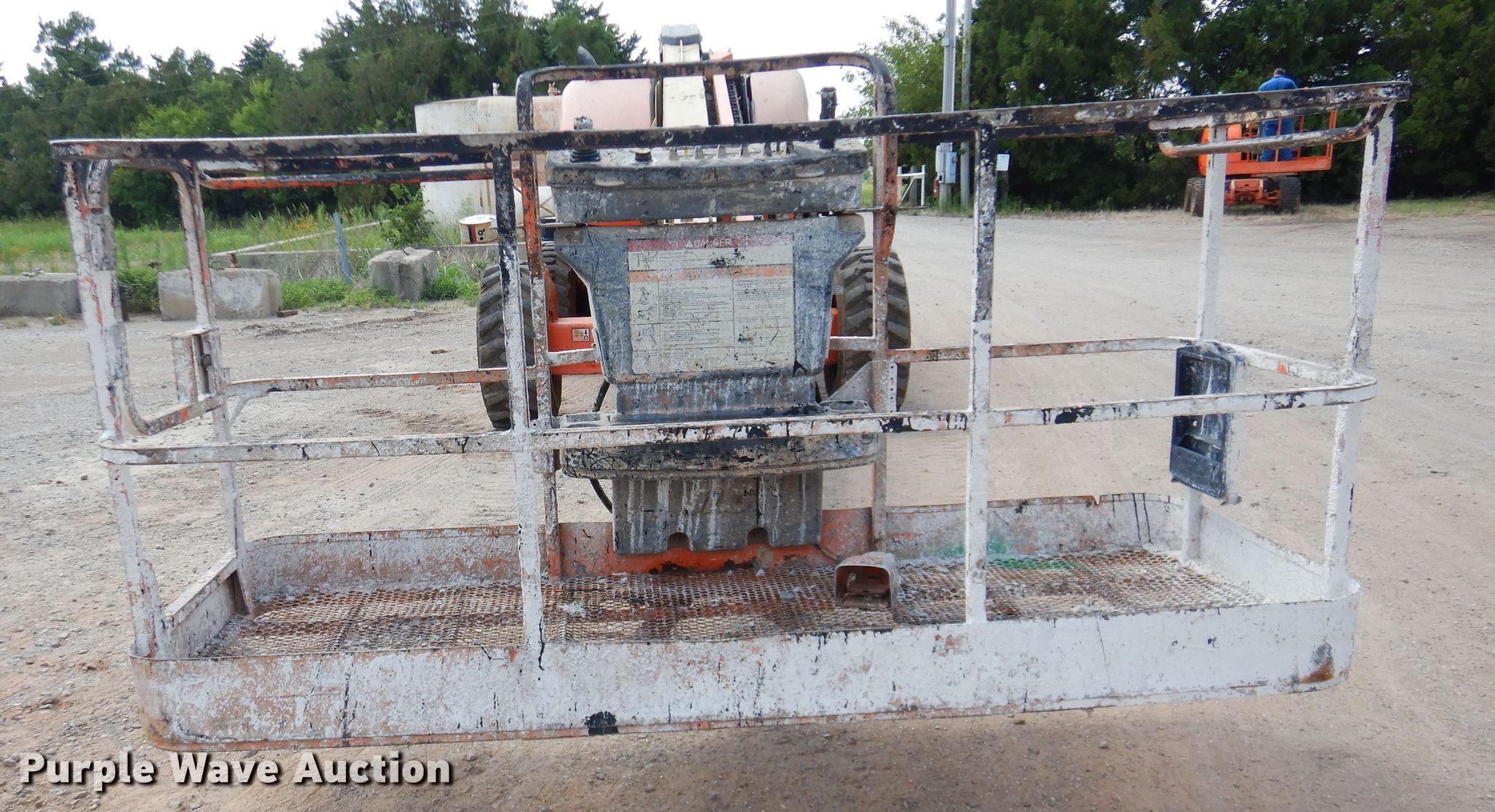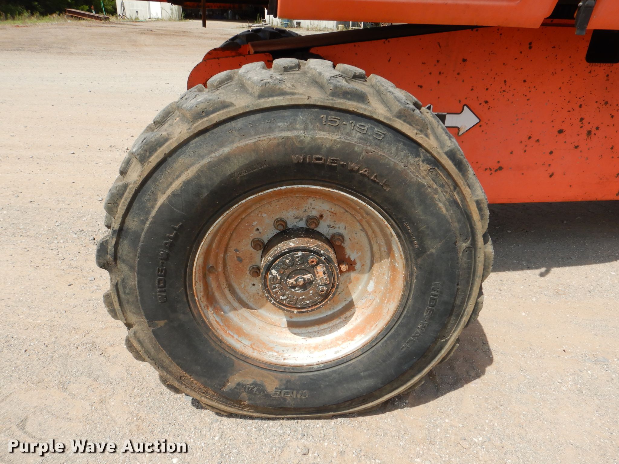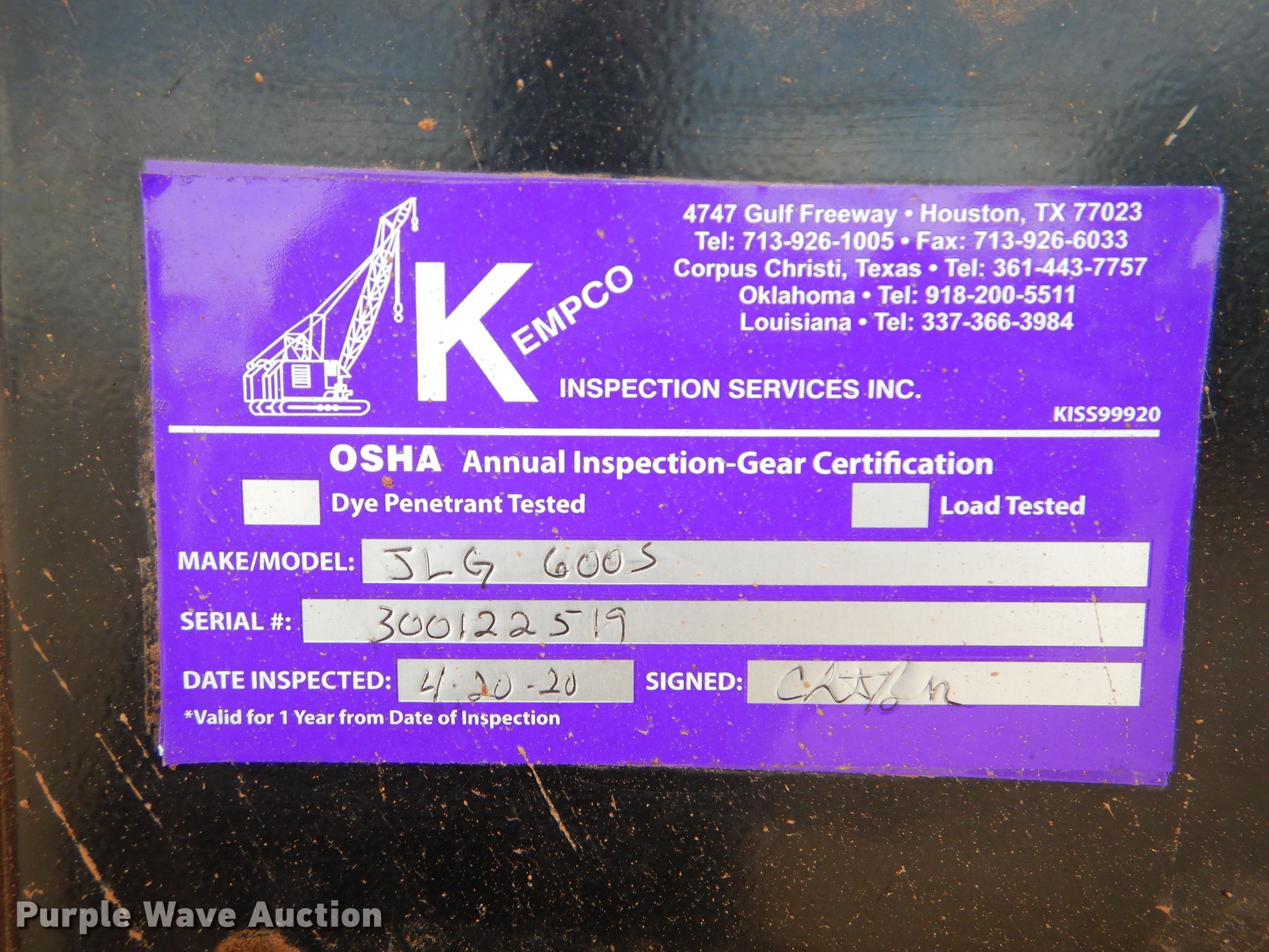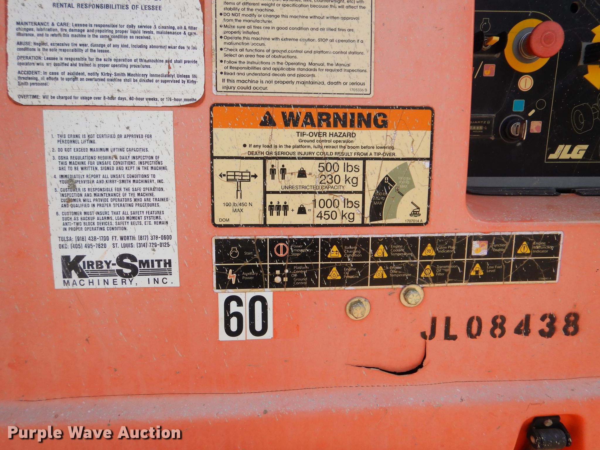 2008 JLG 600S boom lift. 5,209 hours on meter, Serial: 0300122519, Unit #: 80-74. Engine Deutz, Displacement: 2.9L, Cylinders: 4, Fuel type: Diesel, HP: 48.8. Chassis Four wheel drive. Operational Rough terrain, Maximum lift capacity: 1,000 lbs, Maximum reach length: 49' 6", Maximum lift height: 60', Platform: 72" L x 36" W, Controls: Platform, Ground, Travel speed: 3.8 mph, Certification valid through: 04/2021. Tires Tire size: 15-19.5 NHS. Manhattan Road & Bridge. 26775 County Rd 110. Perry, OK 73077