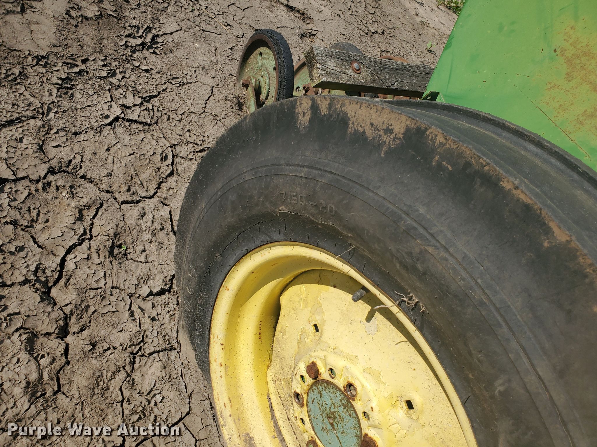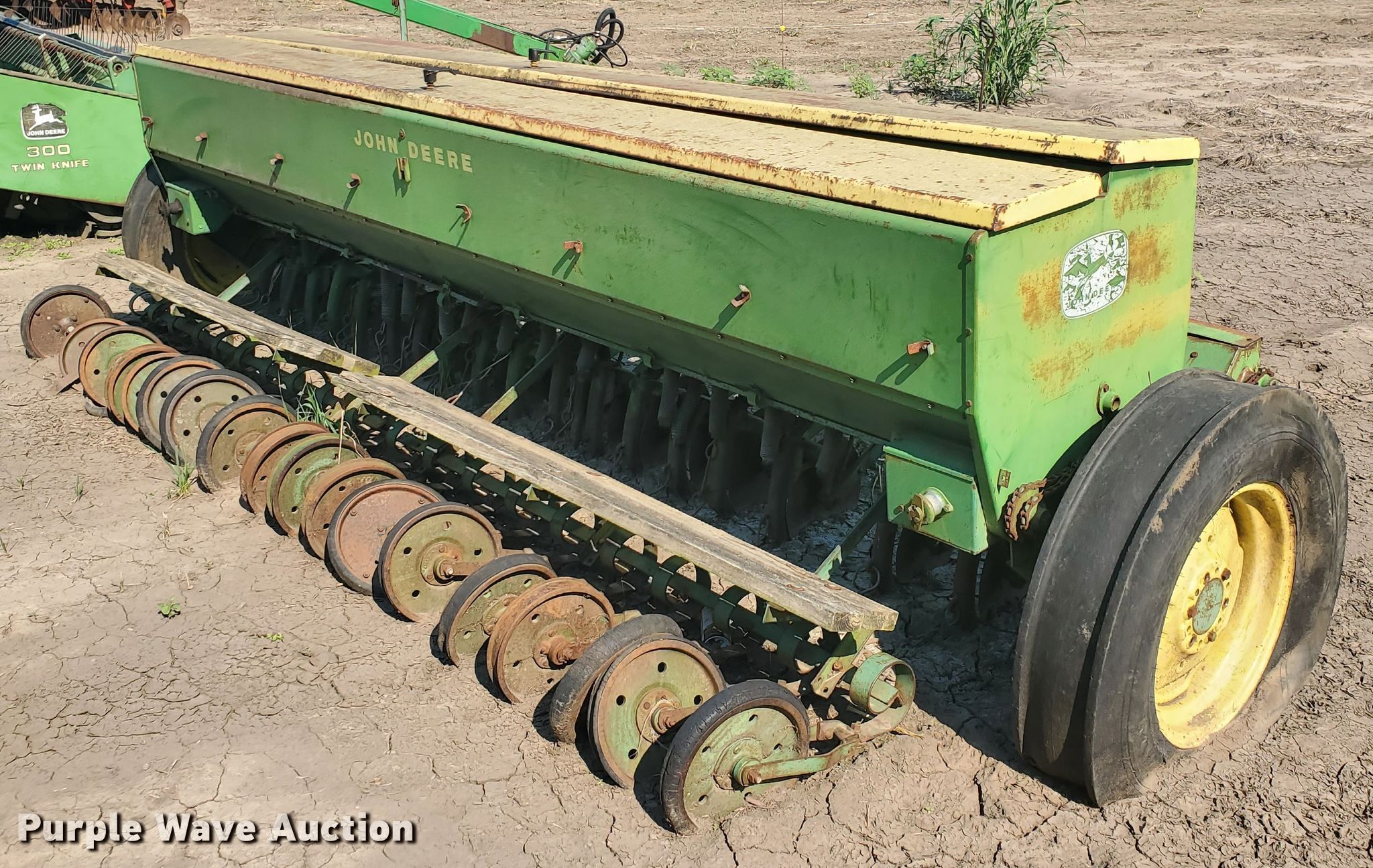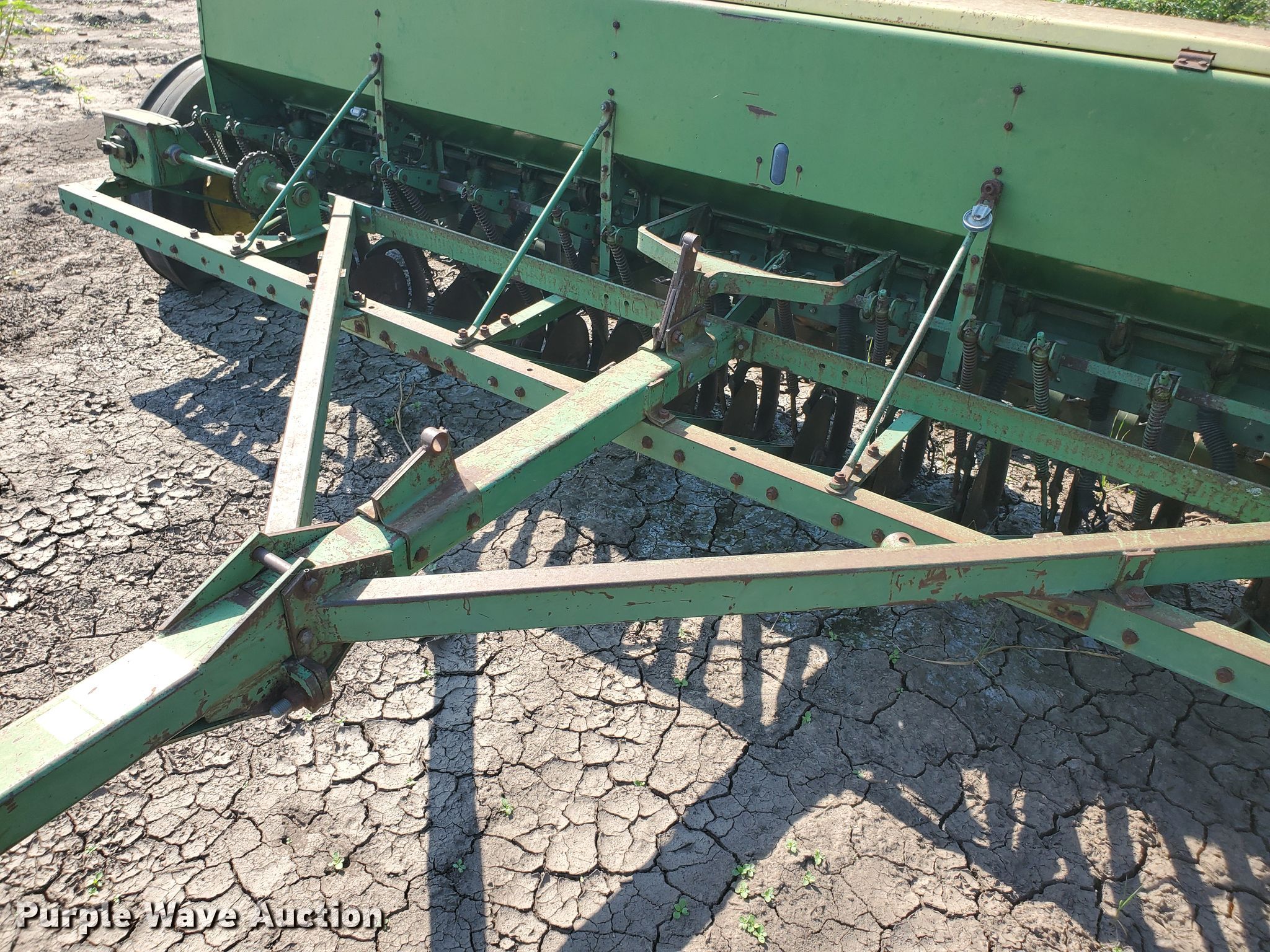 Purple Wave is selling a used Grain Drill or Seeder in Kansas. This item is a John Deere DF2080C grain drill with the following: 12'W, 16 row units, 8" row spacing, Bulk fill system, Ground meter drive, Spring down pressure, Single disk openers, Single rubber closing system, (2) 7.50-20 drive/outside tires, Unknown operating condition, Serial 001296M