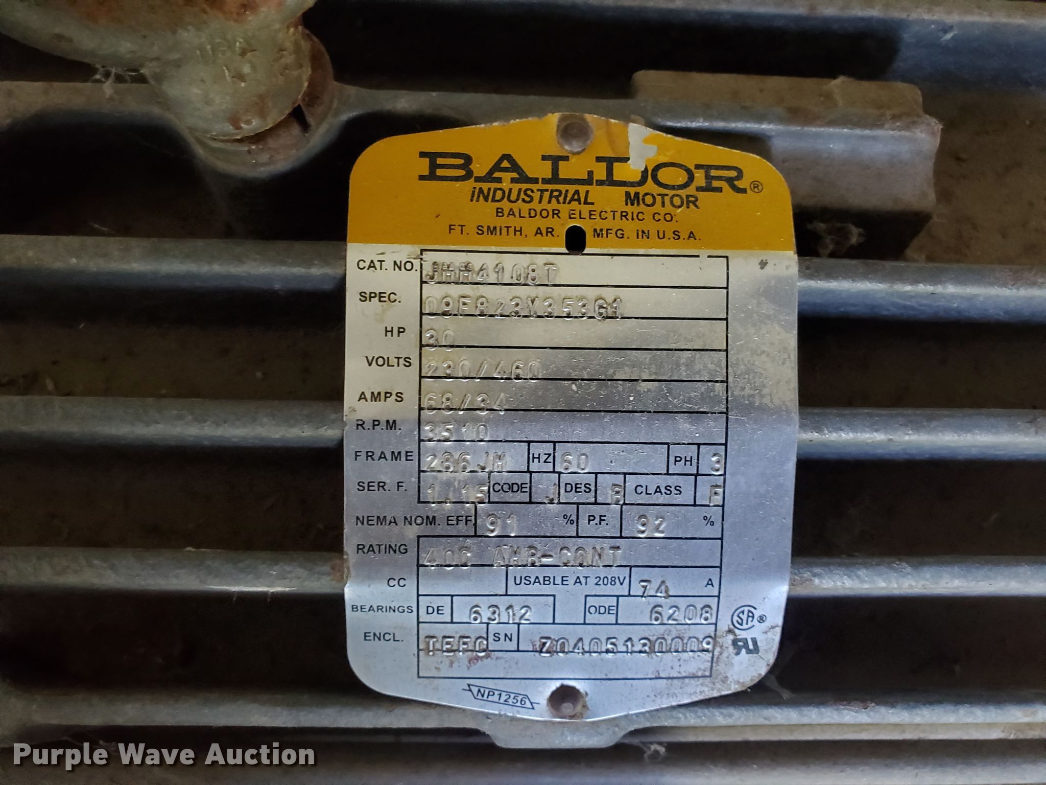 Purple Wave is selling a used Pump in Kansas. This item is a Gould 118F pump with the following: Size: 3x2x10, Baldor electric motor, 30 HP, 230/460V, Three phase