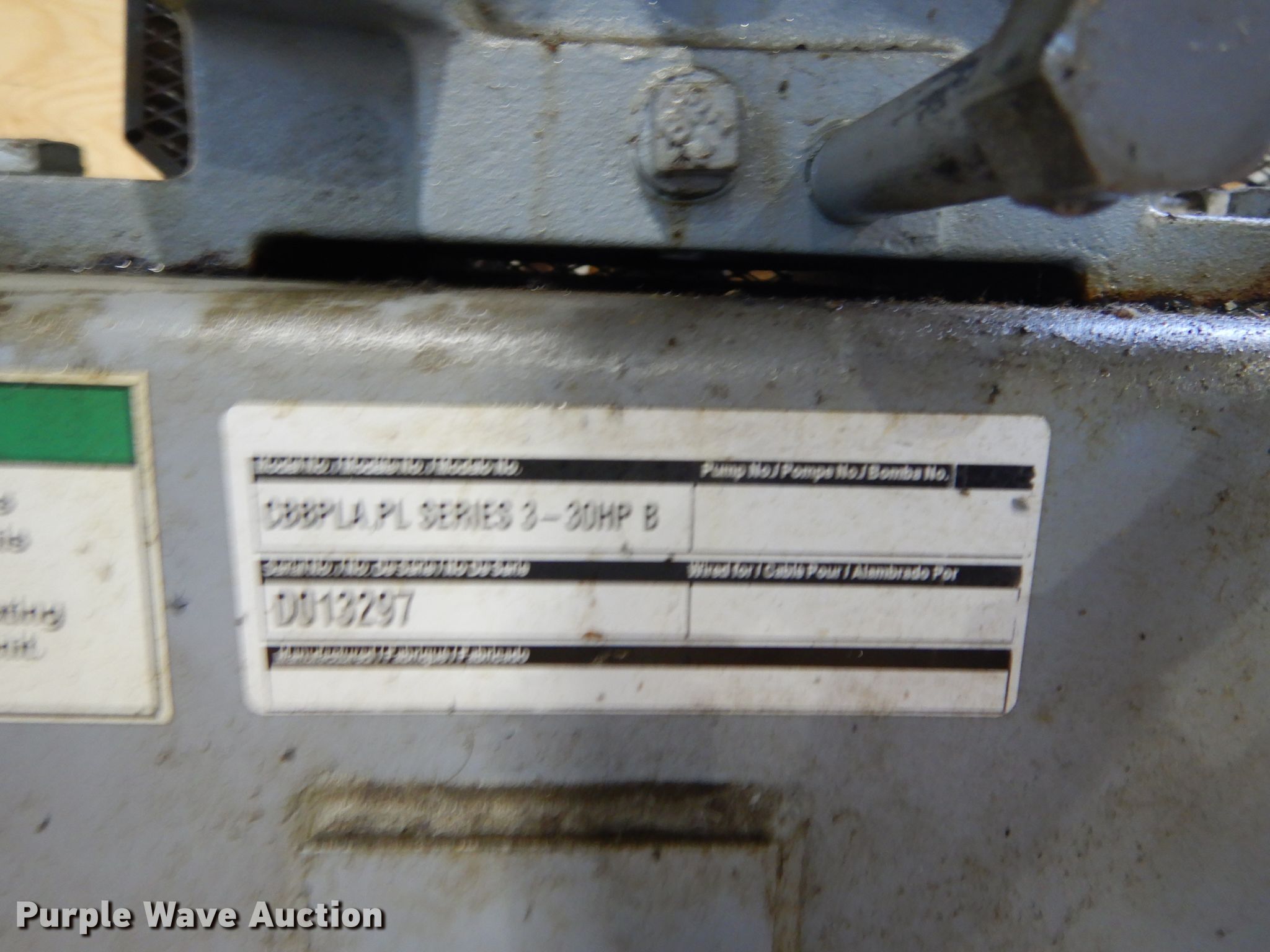 Gardner Denver CBBPLA PL Series 3 air compressor. Serial: D013297. Eelectric motor Baldor, Serial: F0503226449, HP: 15. Operational Phase: Three. City of Belleville. Belleville, KS 66935