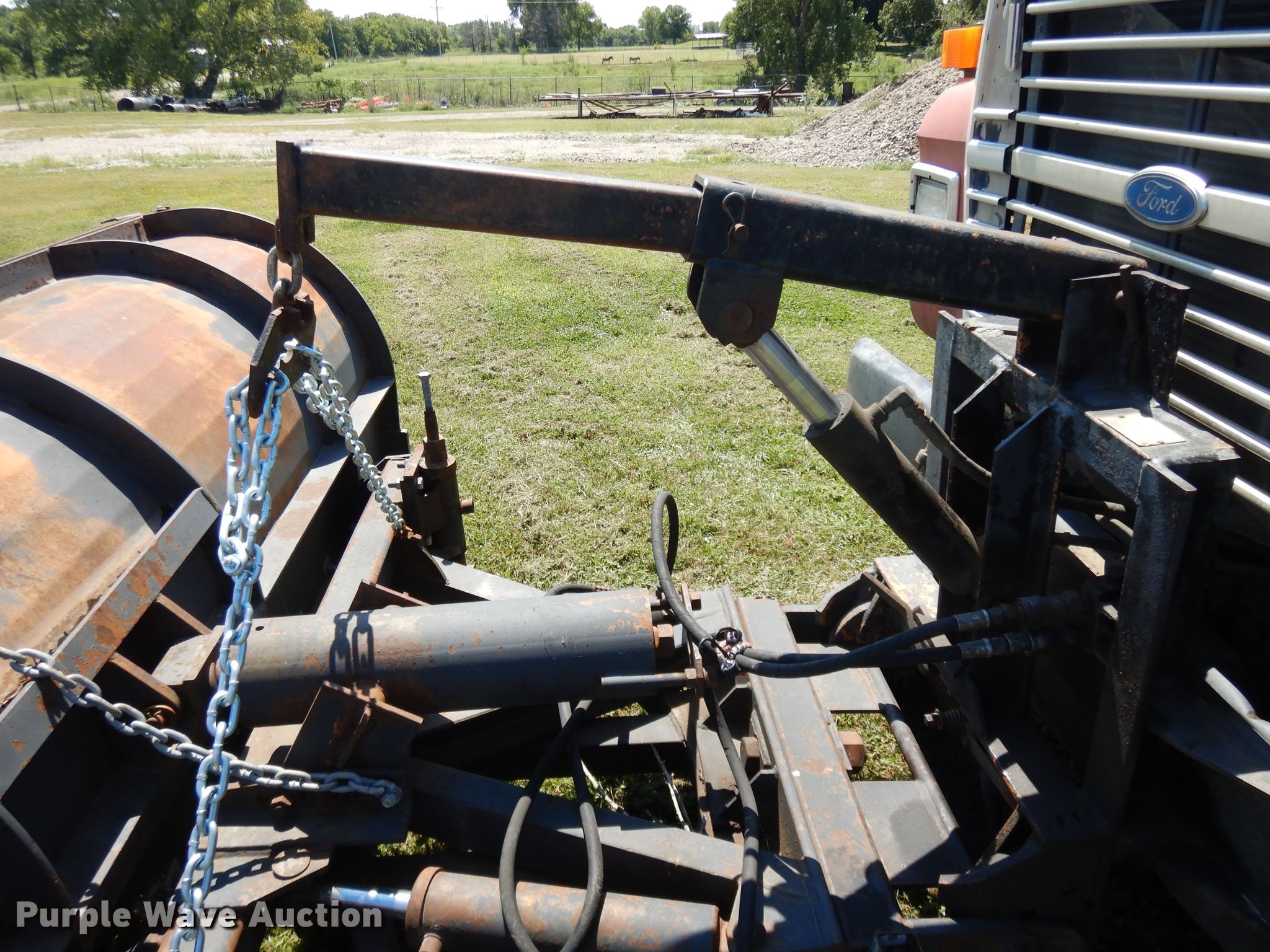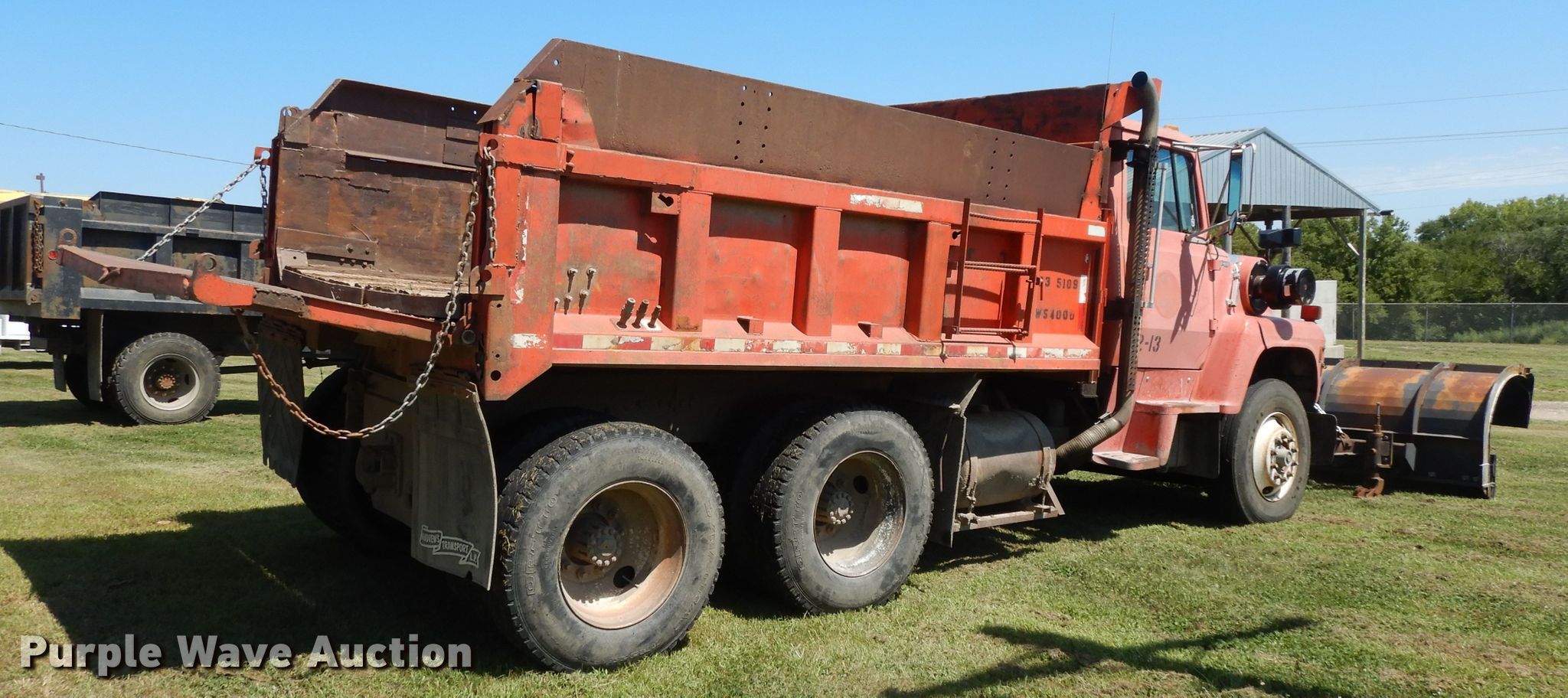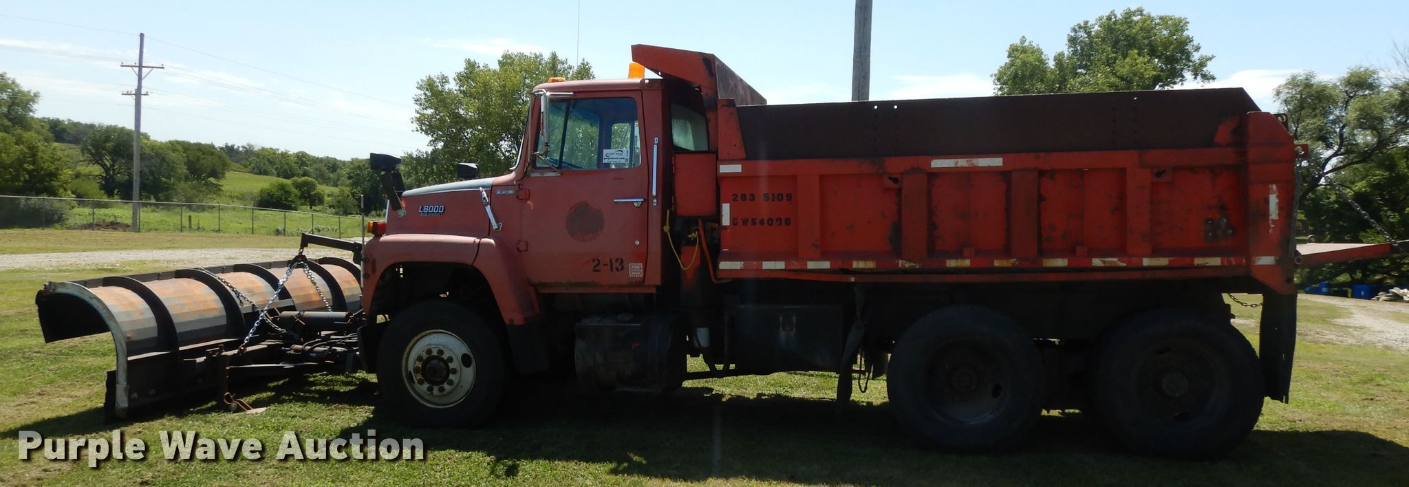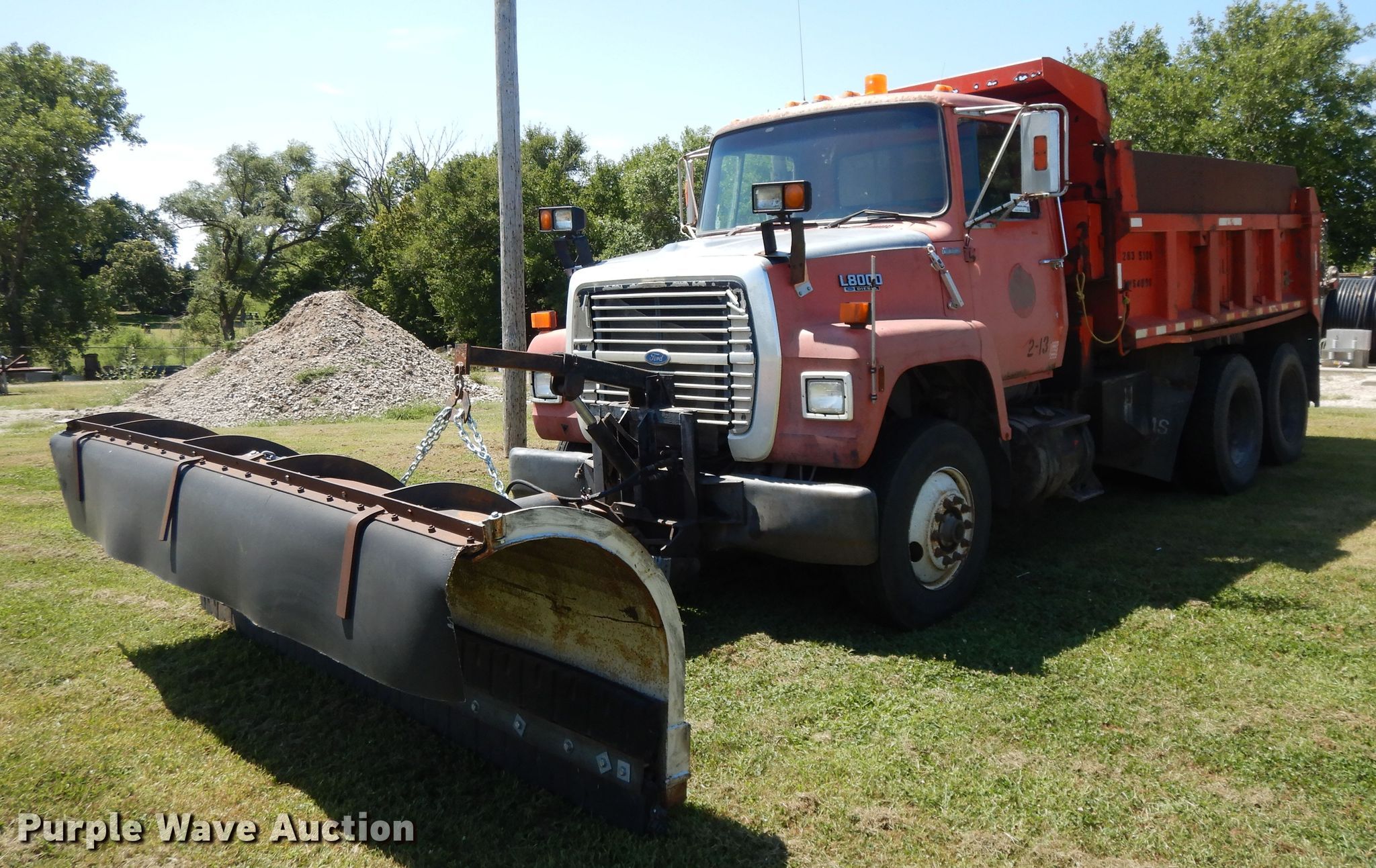 1989 Ford L8000 dump truck. 280,049 miles on odometer, Engine hours: 6,589. Engine Displacement: 7.8L, Cylinders: 6, Fuel type: Diesel. Transmission Automatic. Chassis Axles: Tandem, Differential lock: Inter-axle, Suspension: Walking beam, Brakes: Air, PTO, GVWR: 46,000 lbs, Wheelbase: 174". Interior Heat. Operational Dump bed 12' L x 99" W, Side height: 28", Side board height: 15", Ram: Single , End gate: Manual, Plow Width: 11'. Tires Size: 11R22.5. Notes Windshield chipped or cracked, Walking beam bushing issues, Possible brake issues, Water in oil. Kansas title. 1FDYW82A4KVA23854. City of Belleville. Belleville, KS 66935
