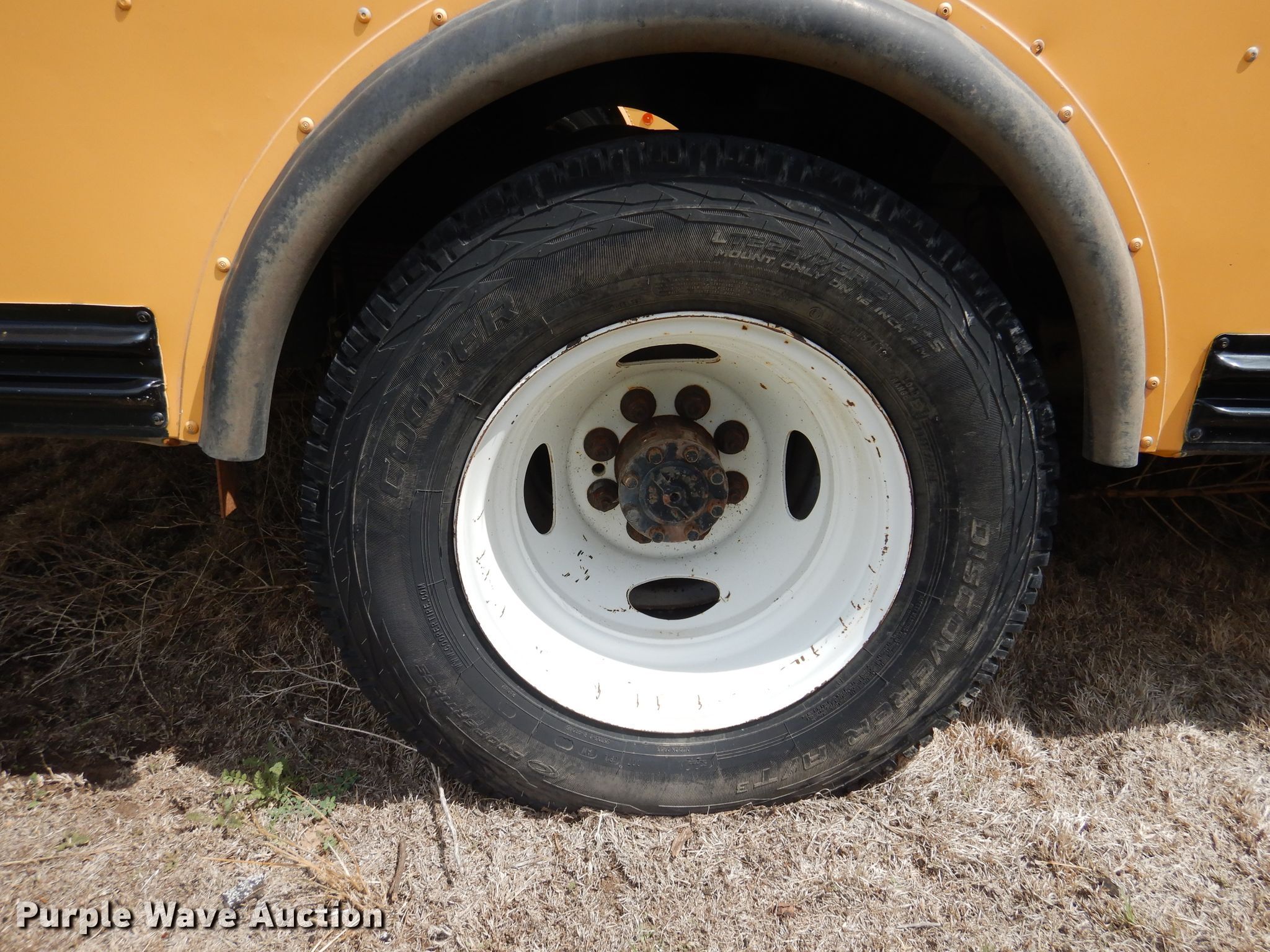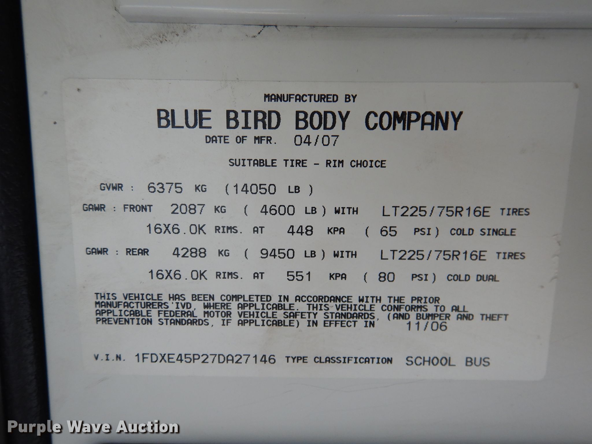2008 Ford E450 Blue Bird B2V school bus. 117,946 miles on odometer. Engine Displacement: 6.0L OHV 32V, Cylinders: 8, Fuel type: Diesel. Transmission Automatic. Chassis Axles: Single, Suspension: Spring, Brakes: Hydraulic, GVWR: 14,050 lbs. Interior AC, Heat, Passengers: 29, Seats Adult seats: 29. Tires Size: 225/75R16. Notes Non-operational unit. Oklahoma title. Title distribution may be delayed up to 30 days from verification of funds. 1FDXE45P27DA27146. Boise City Public Schools. 700 SE 1st Street. Boise City, OK 73933