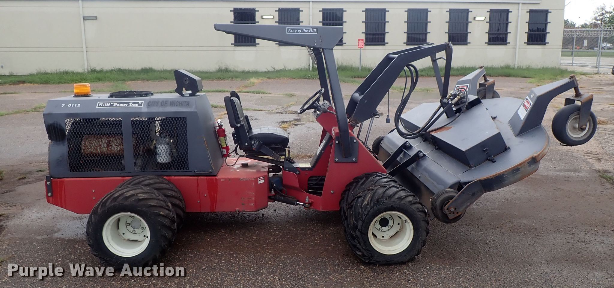 Purple Wave is selling a used Commercial Turf Mower in Kansas. This item is a 1999 Power Trac PT-1850 slope mower with the following: 657 hours on meter, 84" cut, Deutz four cylinder diesel engine, Hydrostatic transmission, Hydraulic front deck lift, 26x12.00-12 tires, Serial 12047, Unit# 70112