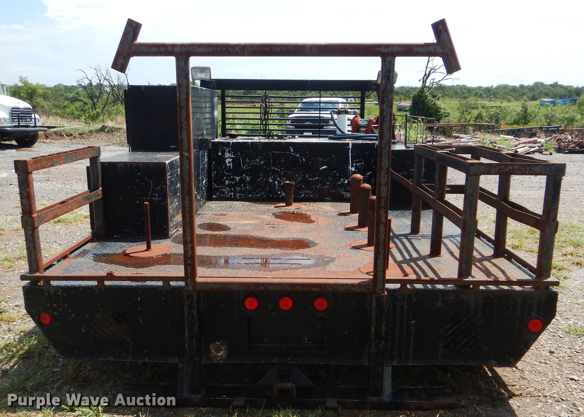 Flatbed. 9'9"L x 94"W, Auxiliary fuel tank Capacity: 50 gallons, Fill Rite pump, Bottle holders. Flint Equipment LLC. 8108 E Eseco Rd. Cushing, OK 74023