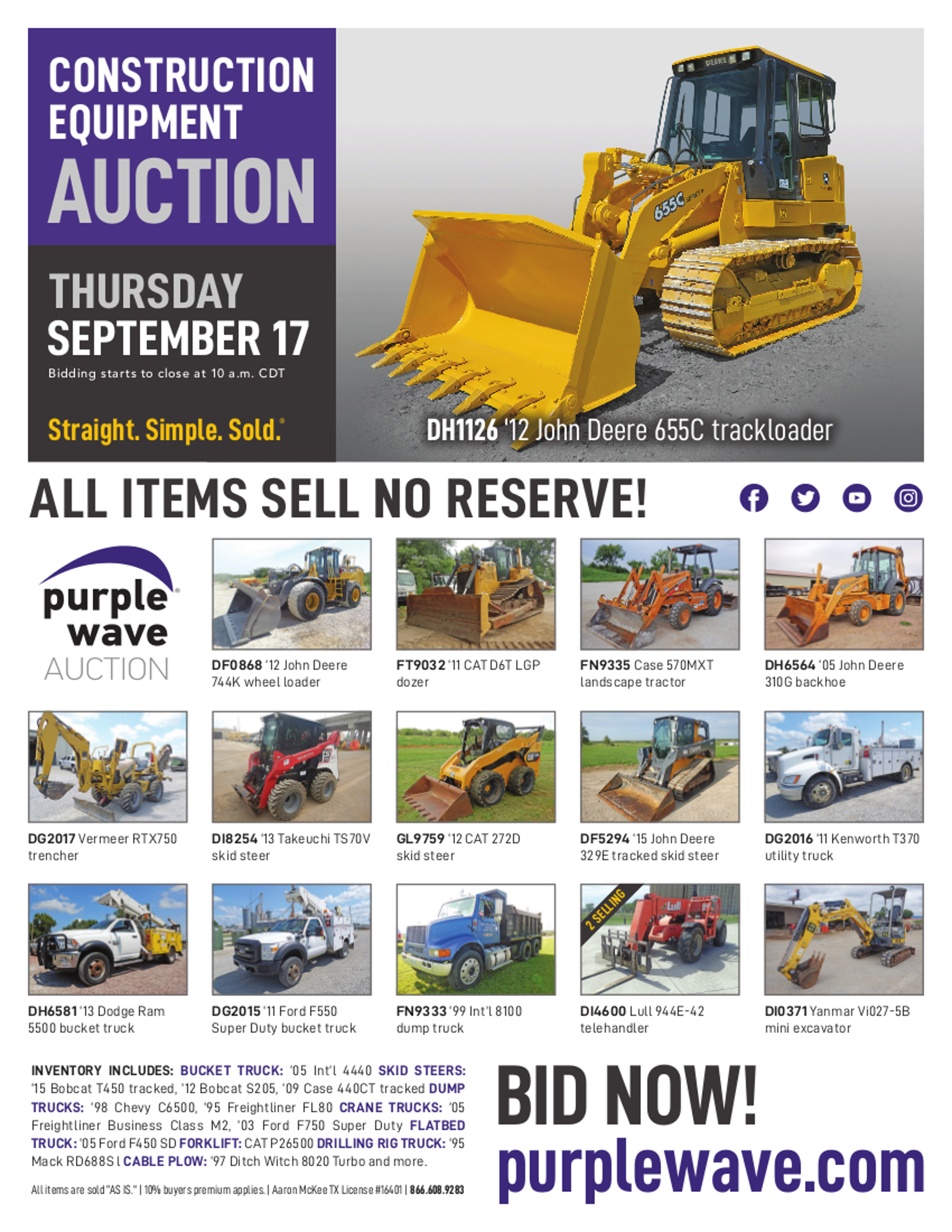 This auction is conducted by Purple Wave, Inc., whose home office is 825 Levee Drive, Manhattan, Kansas. Aaron McKee, Texas auctioneer license # 16401, operates Purple Wave, Inc. Complaints against us may be directed to the Texas Department of Licensing and Regulation, P.O. Box 12157, Austin, Texas 78711, (512) 463-6599. For additional required information, see the attached document.