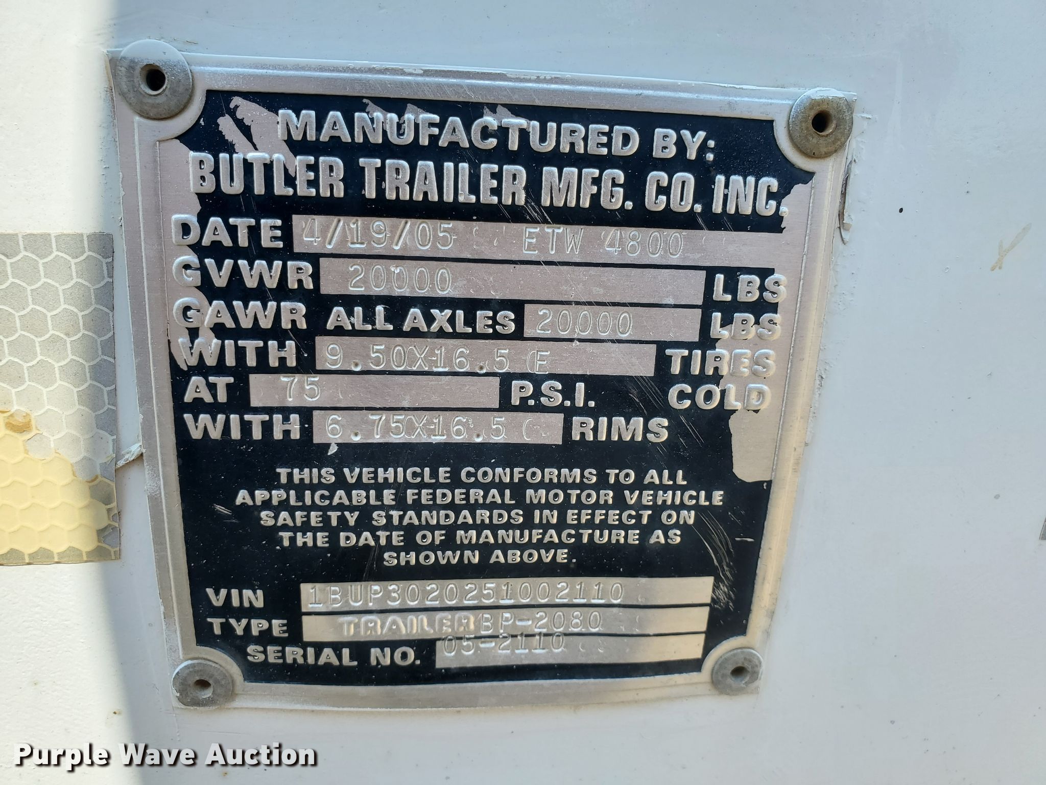 Take a look at this used 2005 Butler BP2080 pole trailer being sold on September 17th, 2020 in the SOLD! September 17 Construction Equipment Auction made by Butler. Take a look at all of the item information below or take a look at similar auctions for Trailers.