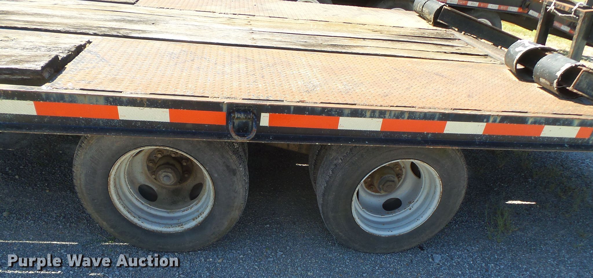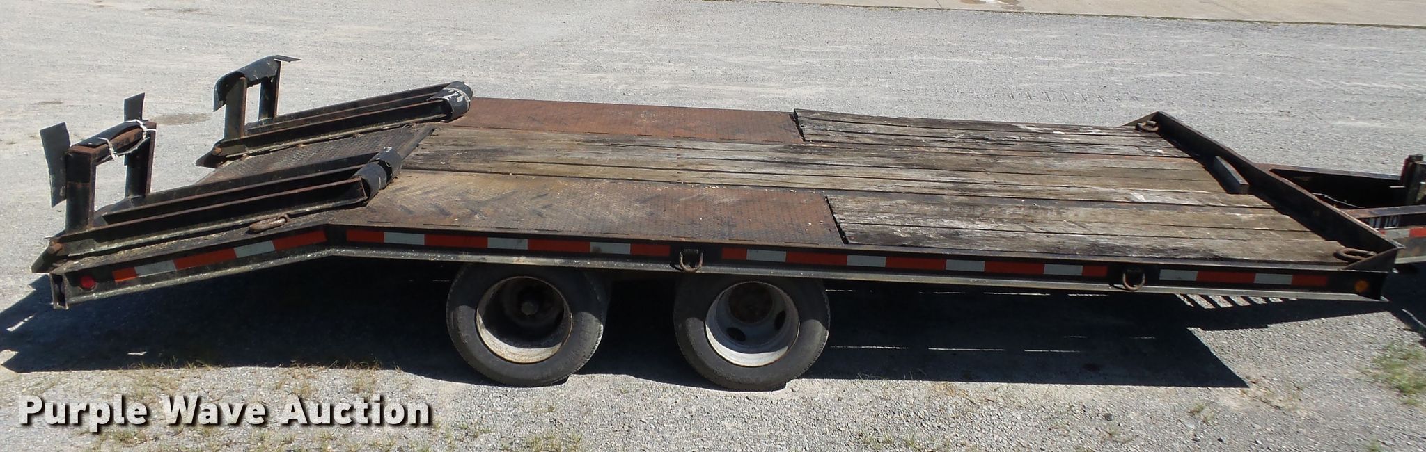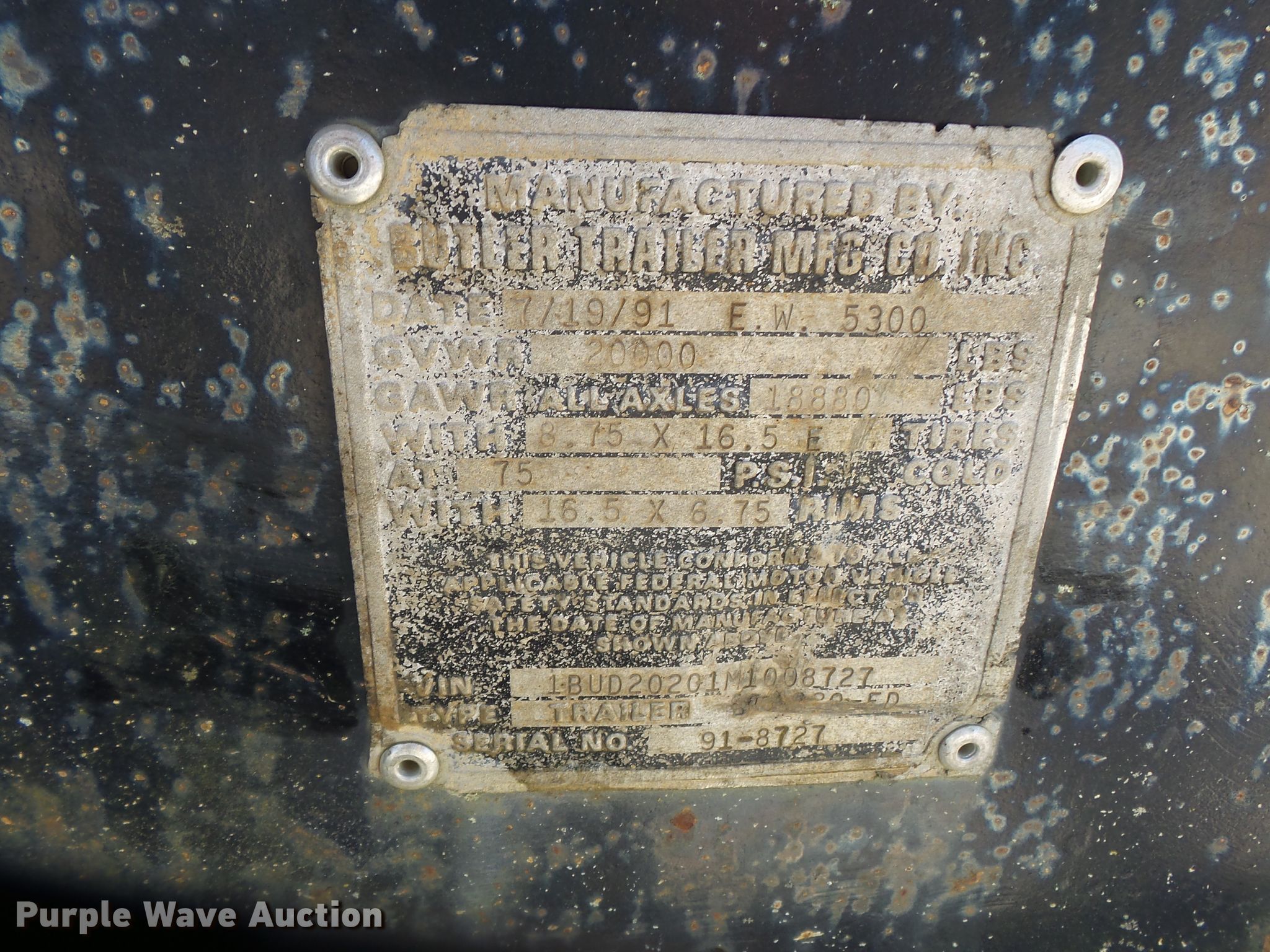Purple Wave is selling a used Equip. Trailer in Missouri. This item is a 1991 Butler equipment trailer with the following: 26'L x 96"W overall, 16'L x 93"W wood deck, 32" floor height, 5' tail length, 5'L ramps, Single leg landing gear, Spring suspension, Electric brakes, Tandem axle, Steel wheels, 8.75R16.5 tires, GVWR 20,000 lbs, GAWR 18,880 lbs