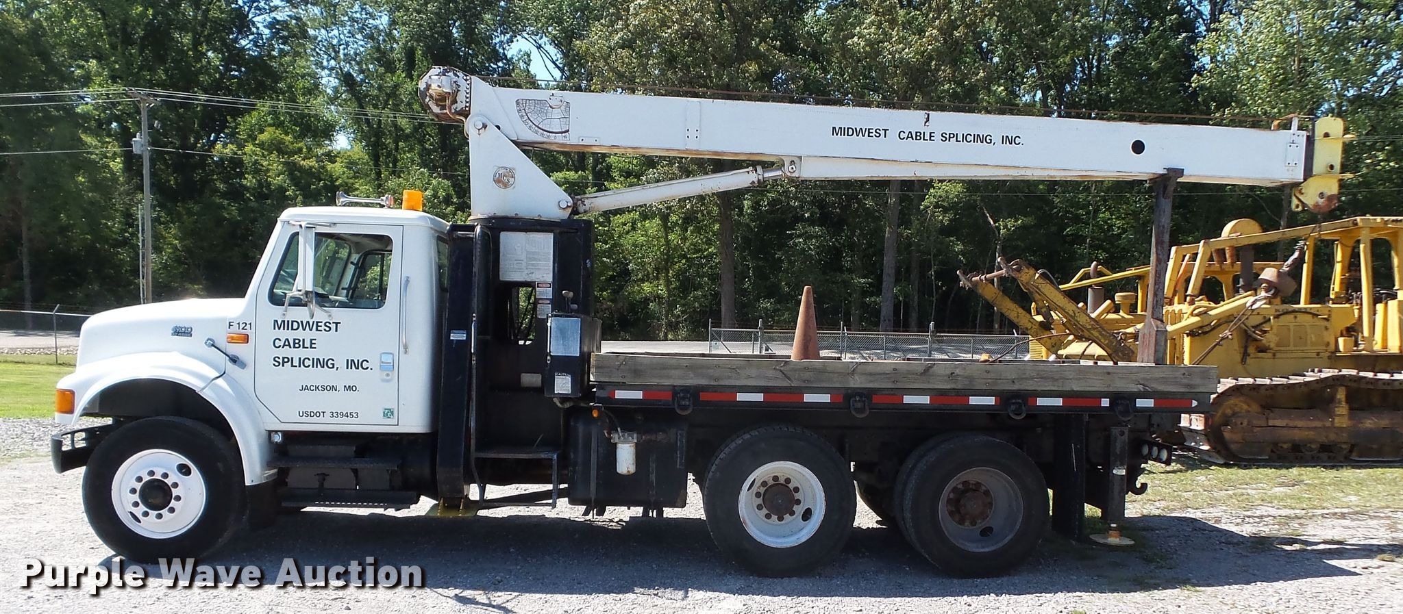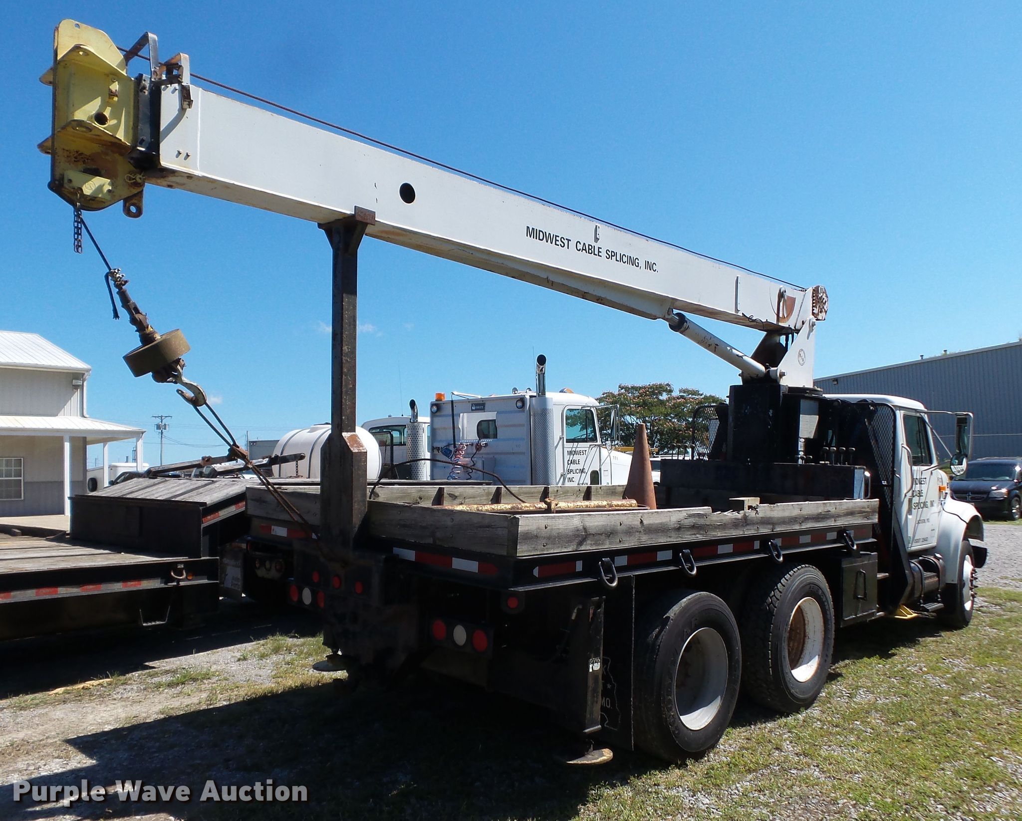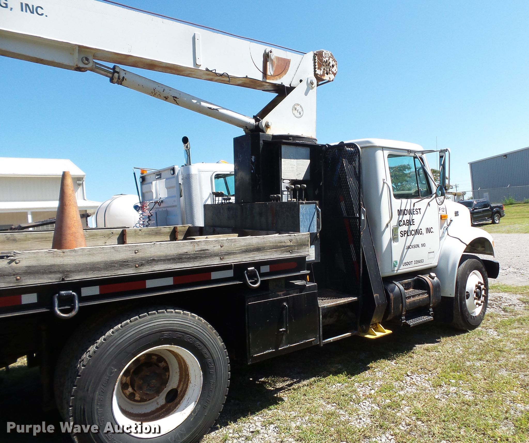 1999 International 4900 crane truck. 219,027 miles on odometer, Unit #: F121. Engine International DT466E, Displacement: 7.6L, Cylinders: 6, Fuel type: Diesel. Transmission Manual, Speed: 7. Chassis Axles: Tandem, Suspension: Air, Brakes: Air. Operational Flatbed Length: 14', Crane Manitex 956 Serial: 9063, Boom Telescopic, Sections: 3, Maximum lift capacity: 18,000 lbs, Boom controls Ground, Crane ball & hook, Lift chart. Tires Front: 295/75R22.5, Rear: 11R22.5. Missouri title. Title distribution may be delayed up to 30 days from verification of funds. 1HTSHAAR9XH604519. Midwest Cable Splicing. 1828 Co Rd 330. Jackson, MO 63755