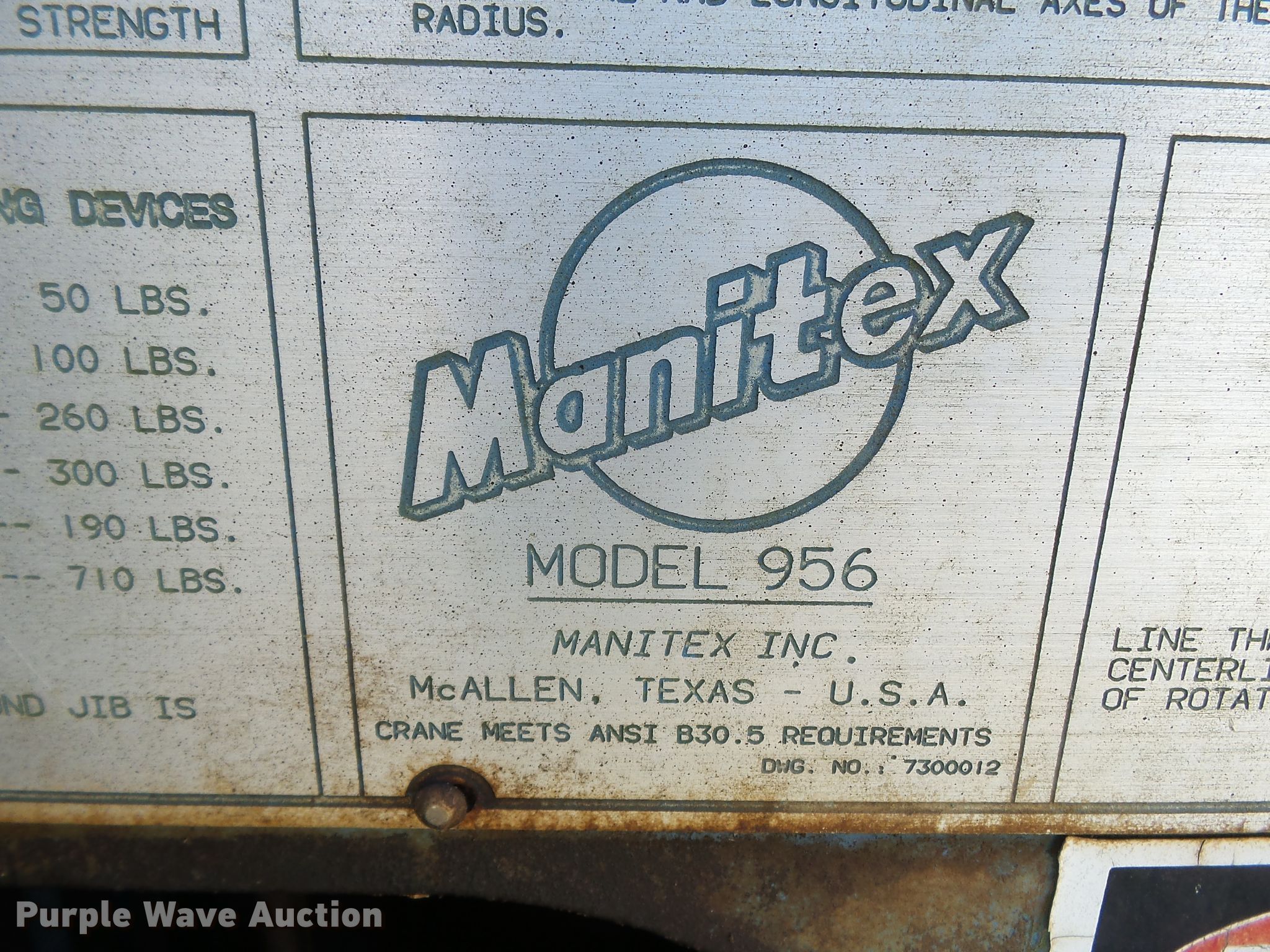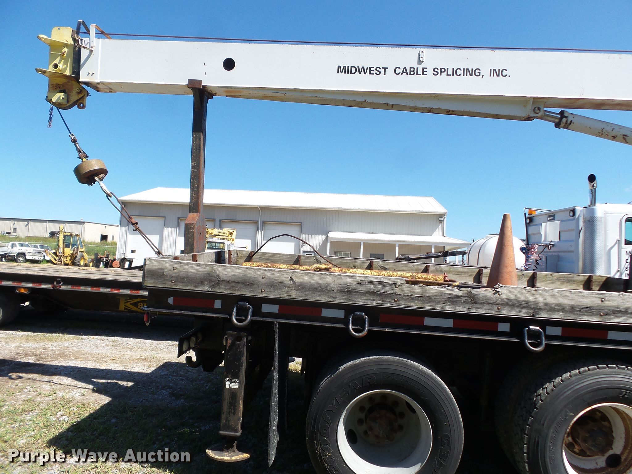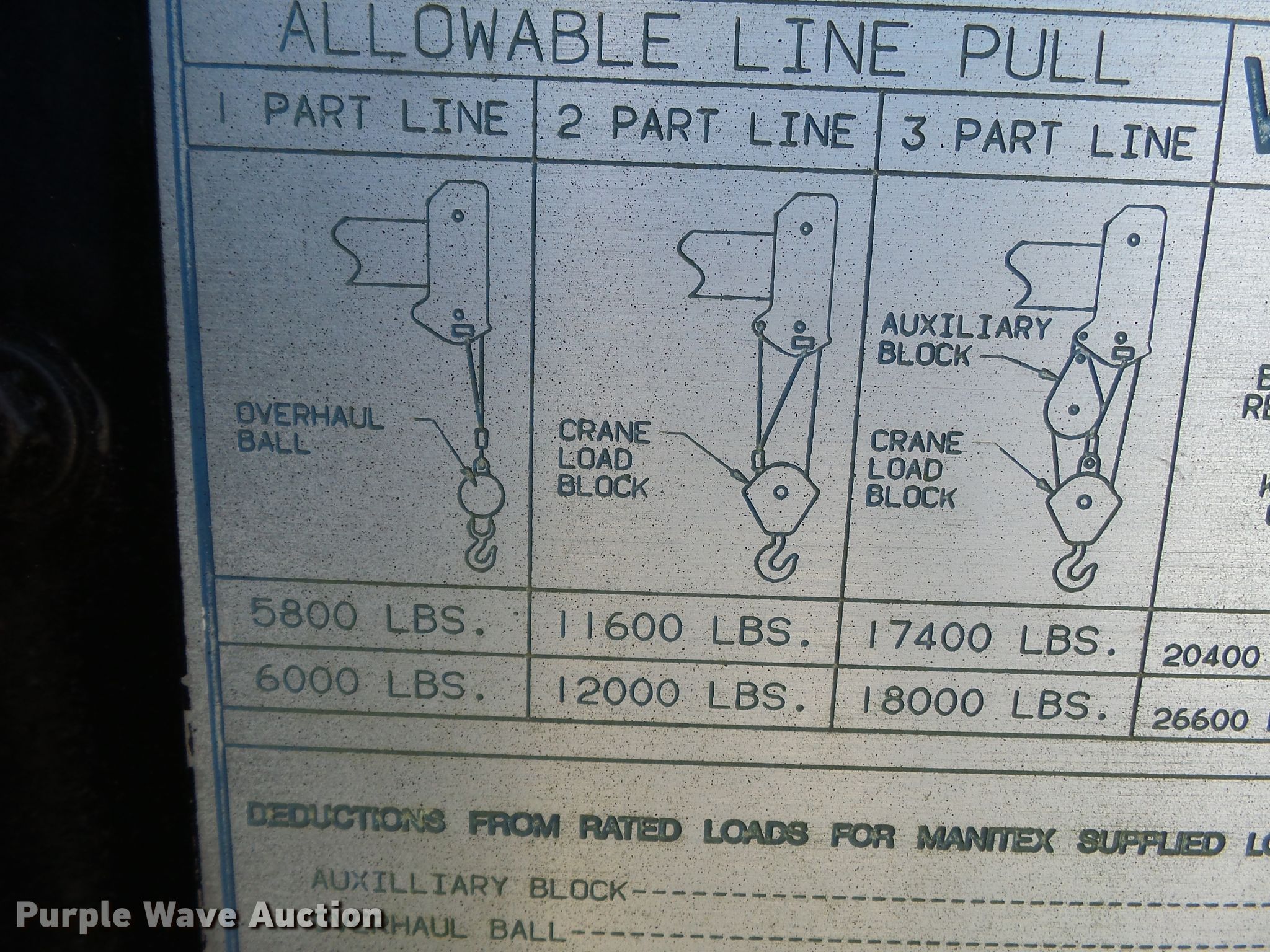 1999 International 4900 crane truck. 219,027 miles on odometer, Unit #: F121. Engine International DT466E, Displacement: 7.6L, Cylinders: 6, Fuel type: Diesel. Transmission Manual, Speed: 7. Chassis Axles: Tandem, Suspension: Air, Brakes: Air. Operational Flatbed Length: 14', Crane Manitex 956 Serial: 9063, Boom Telescopic, Sections: 3, Maximum lift capacity: 18,000 lbs, Boom controls Ground, Crane ball & hook, Lift chart. Tires Front: 295/75R22.5, Rear: 11R22.5. Missouri title. Title distribution may be delayed up to 30 days from verification of funds. 1HTSHAAR9XH604519. Midwest Cable Splicing. 1828 Co Rd 330. Jackson, MO 63755