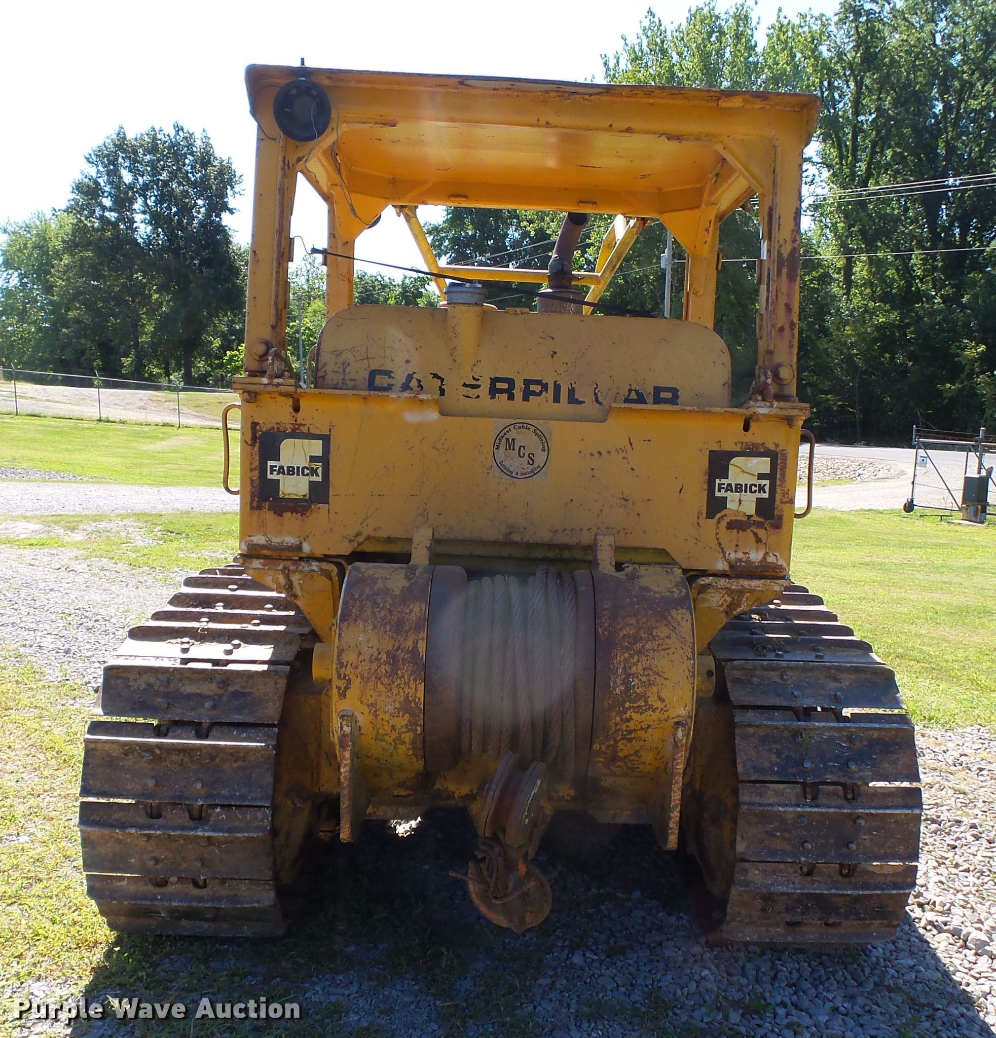 1975 Caterpillar D6C dozer. Serial: 10K11078. Engine Caterpillar 3306, Serial: 3N29946, Displacement: 641 C.I.D., Cylinders: 6, Fuel type: Diesel, HP: 120. Transmission Powershift, 3F - 3R. Operators station Canopy, Steering: Clutch brake. Operational Sweeps, Rear drawbar, Dozer blade: Straight Width: 8', Attachments Winch Hyster , Cable: 1".. Tracks Width: 22", Grouser pads: Single, Bottom rollers: 6. Midwest Cable Splicing. 1828 Co Rd 330. Jackson, MO 63755