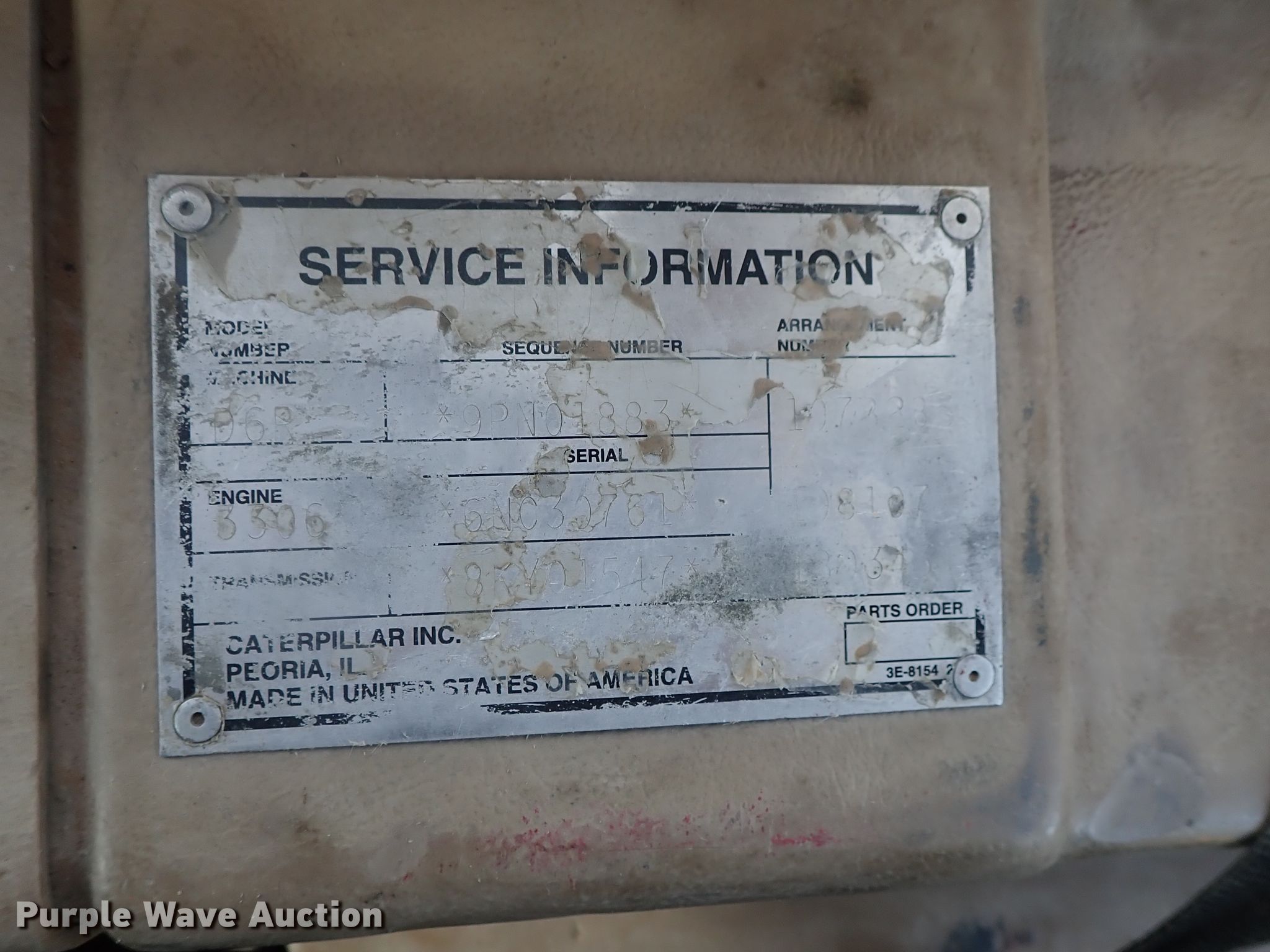 2005 Caterpillar D6R LGP dozer. 14,859 hours on meter, Serial: 9PN01883, Unit #: 36.16L. Engine Caterpillar 3306, Serial: 6NC30761, Cylinders: 6, Fuel type: Diesel. Transmission Powershift, 3F - 3R. Operators station EROPS AC, Heat, Steering: Differential. Operational Dozer blade: Straight Width: 154". Tracks Width: 36", Grouser pads: Single, Bottom rollers: 8. Sherwood Construction Company. 3219 W May St. Wichita, KS 67213