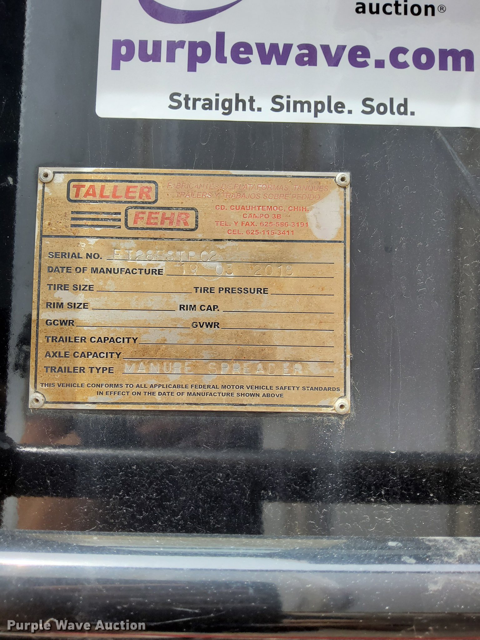 Purple Wave is selling a used Manure Spreader in Texas. This item is a 2018 Fehr manure spreader / silage wagon with the following: 28.5'L x 103"W, 91" side height, Floor liner, Chain driven floor, (2) rear vertical beaters, 1000 PTO, Rear PTO, Tandem axle, 710/45R22.5IMP tires, Serial FT28FSTPC2