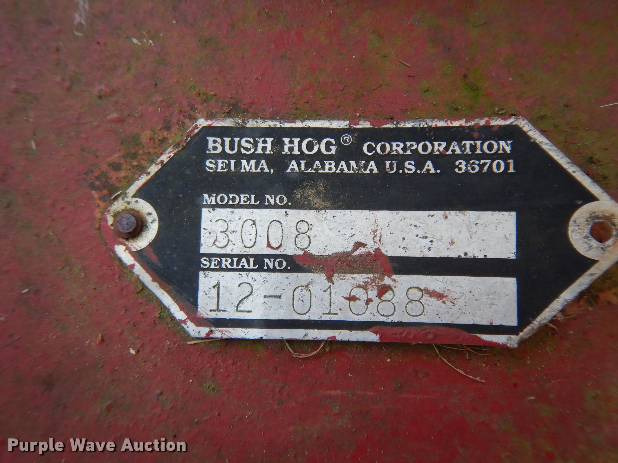 Purple Wave is selling a used Mower, Cutter, Shredder in Texas. This item is a Bush Hog 3008 rotary mower with the following: 8'W, Hydraulic lift, 540 PTO, Three point hitch, Serial 12-01088