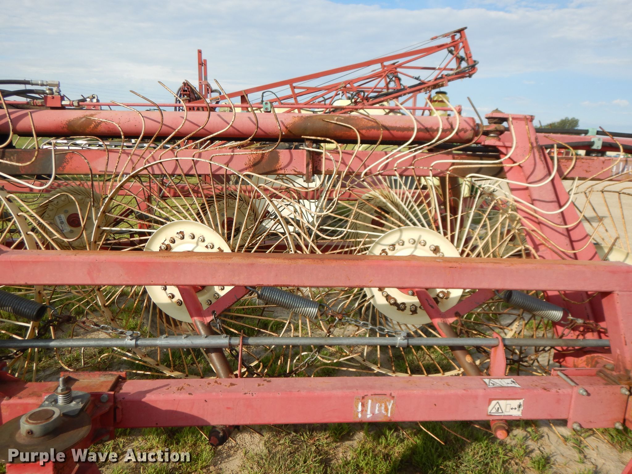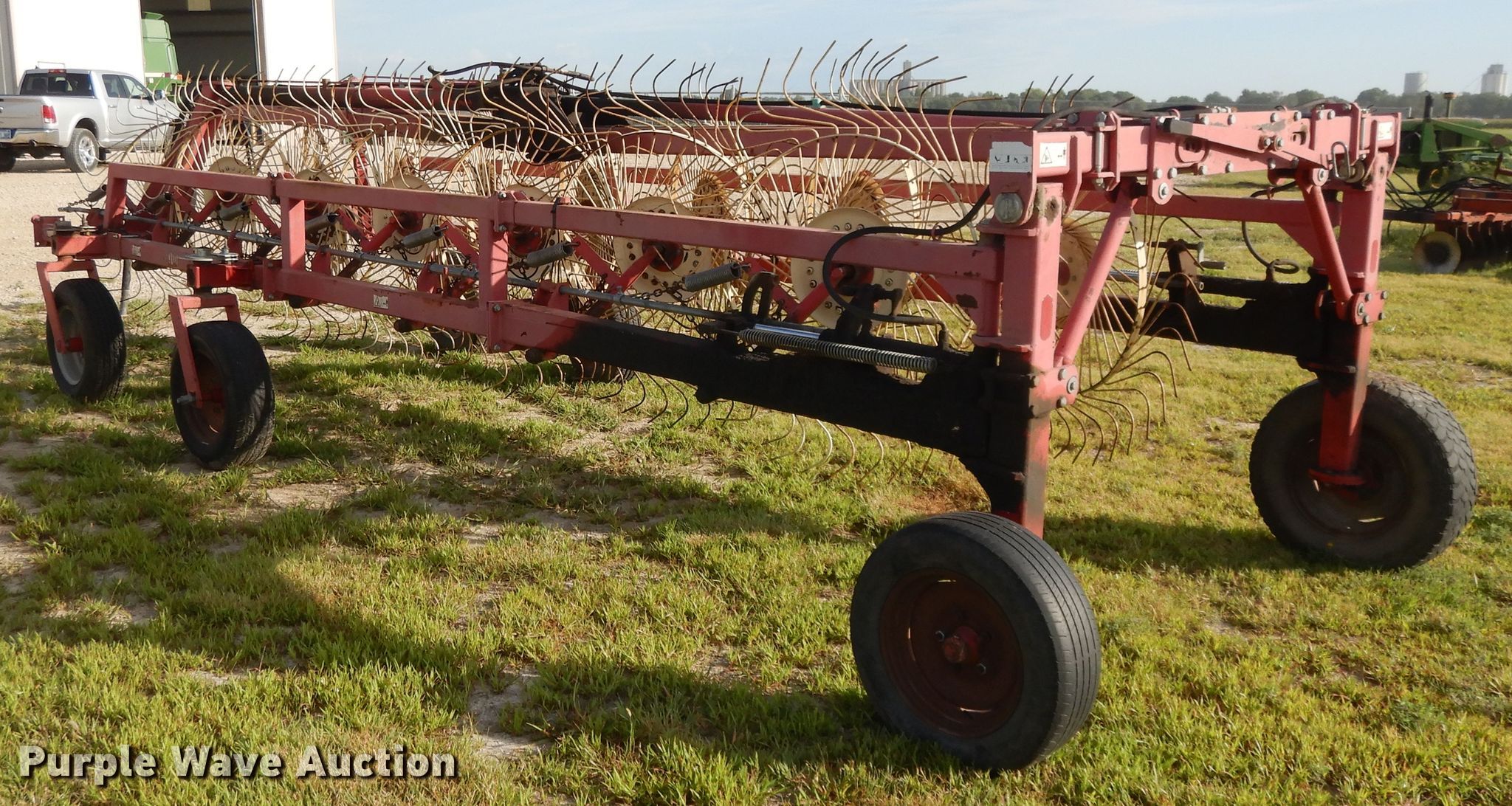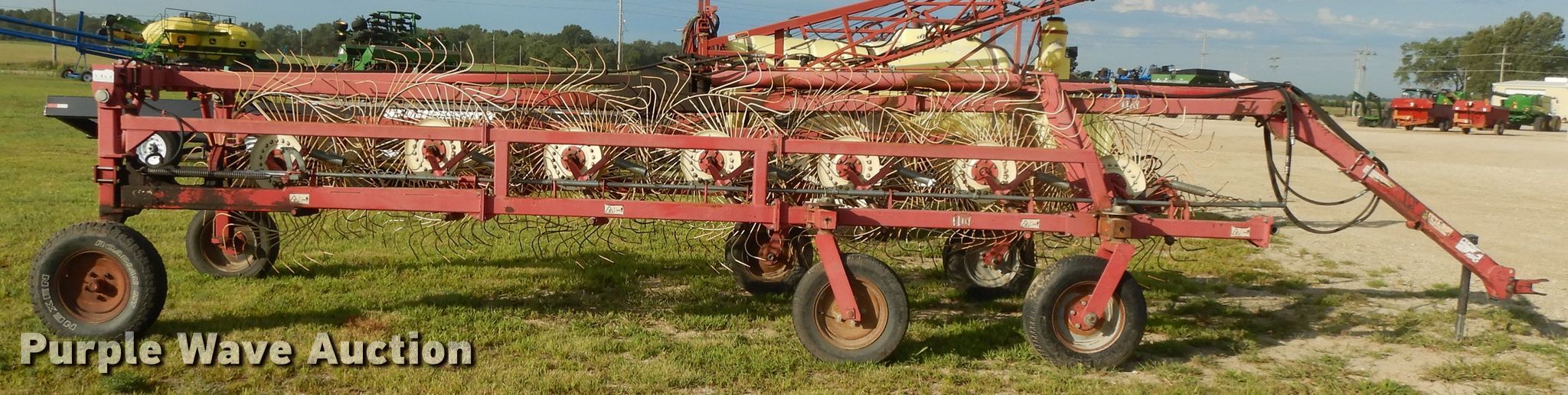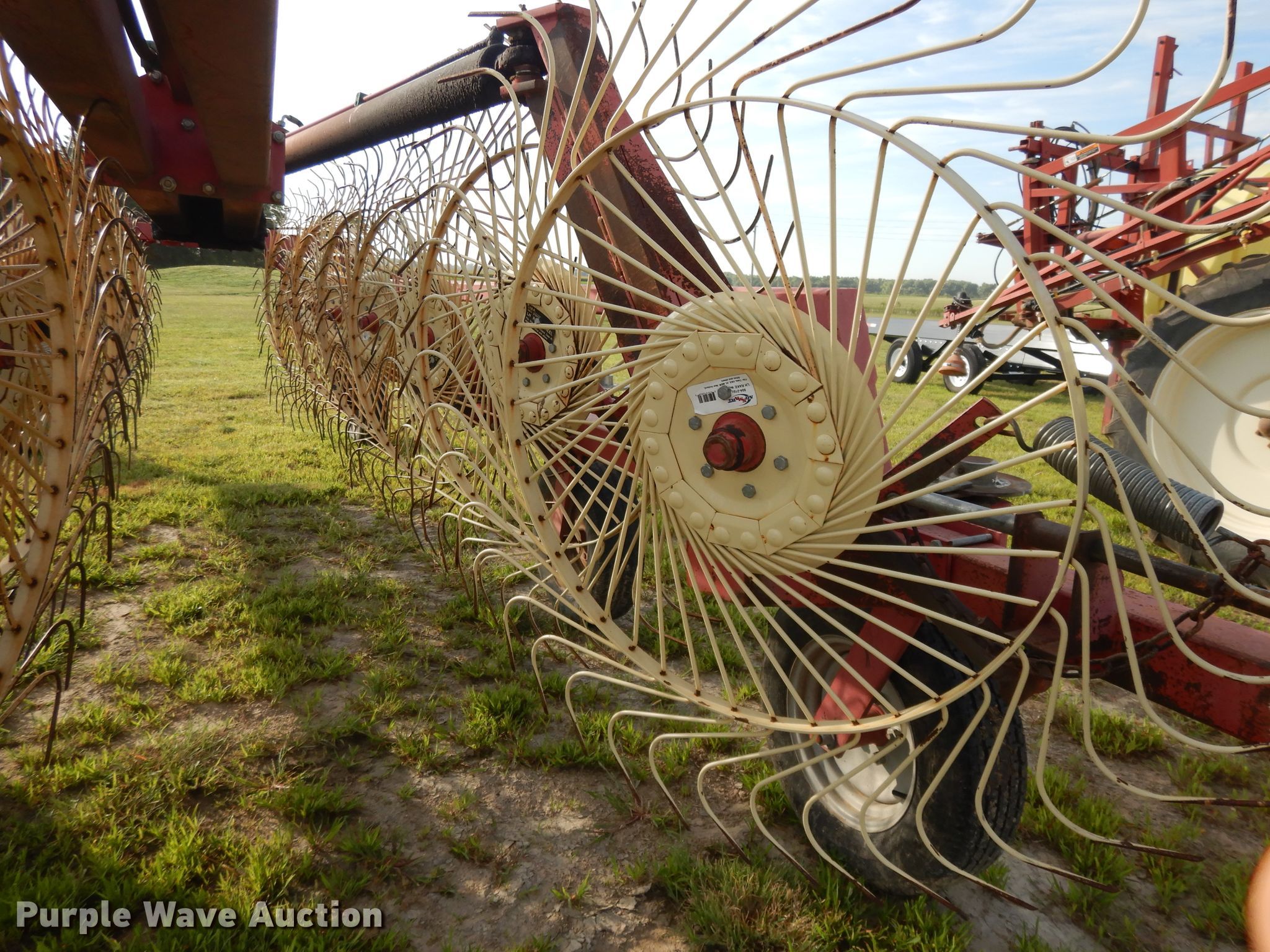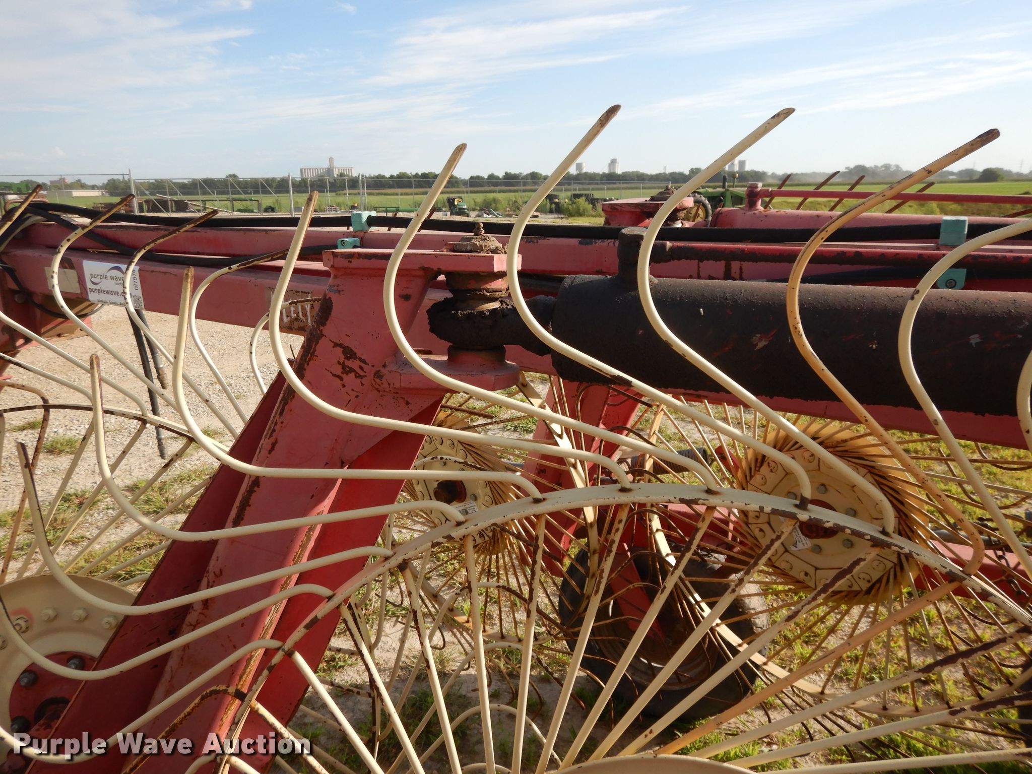 Purple Wave is selling a used Hay Rake in Kansas. This item is a Lely hay rake with the following: (14) 32" diameter wheels, Hydraulic lift and fold, 205/75R15 tires, Serial 101471, Unit# 167887