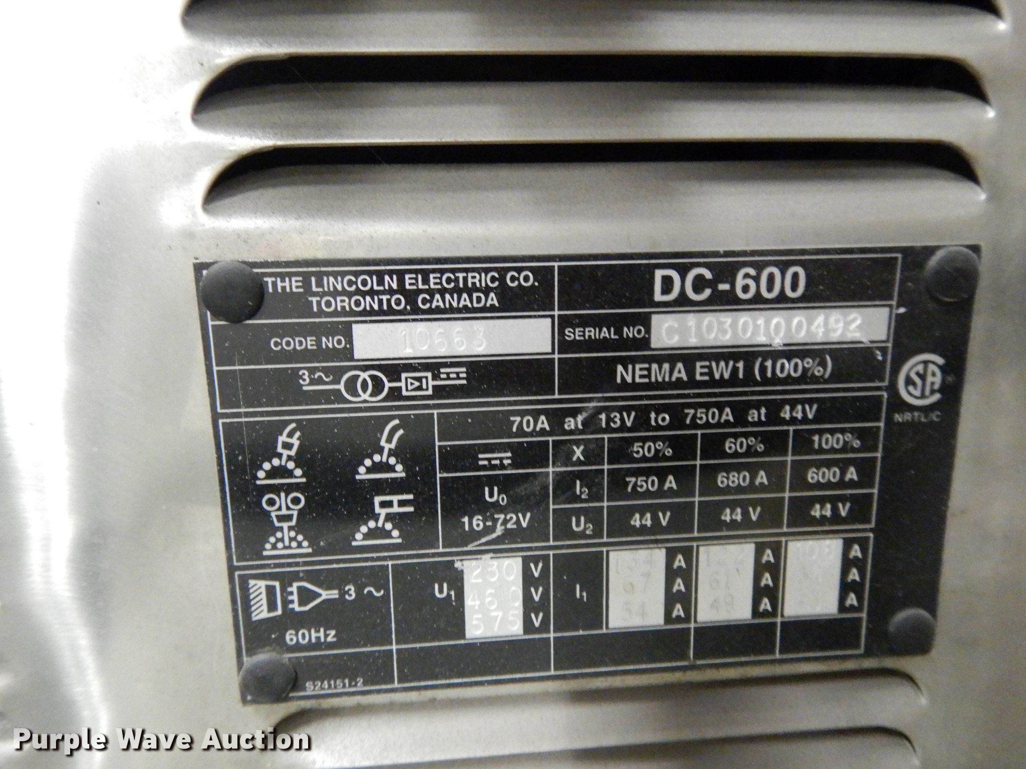 Purple Wave is selling a used Welder (Manual) in Kansas. This item is a Red-d-arc DC600 welder with the following: 42/115V auxiliary power, Serial C1030100492