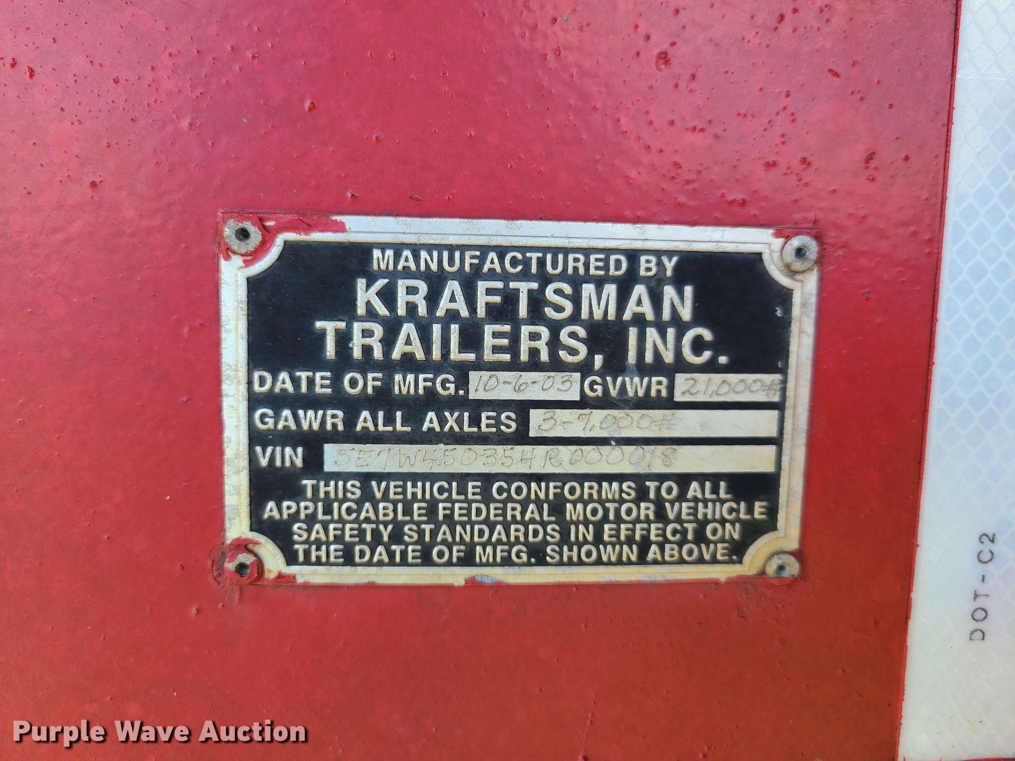 Purple Wave is selling a used Car Carrier in Missouri. This item is a 2004 Kraftsman car carrier with the following: 51'L x 102"W overall, Ramps, Four car capacity, Dual leg landing gear, Spring suspension, Electric brakes, Triple axle, 235/85R16 tires