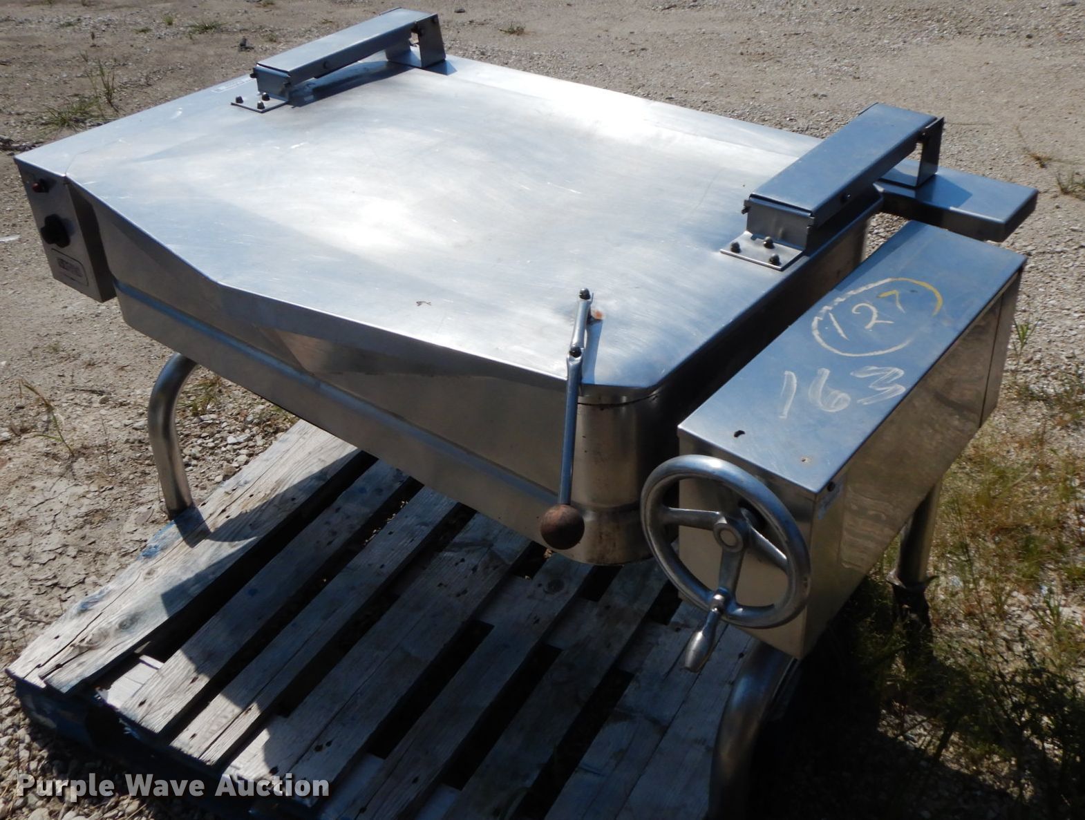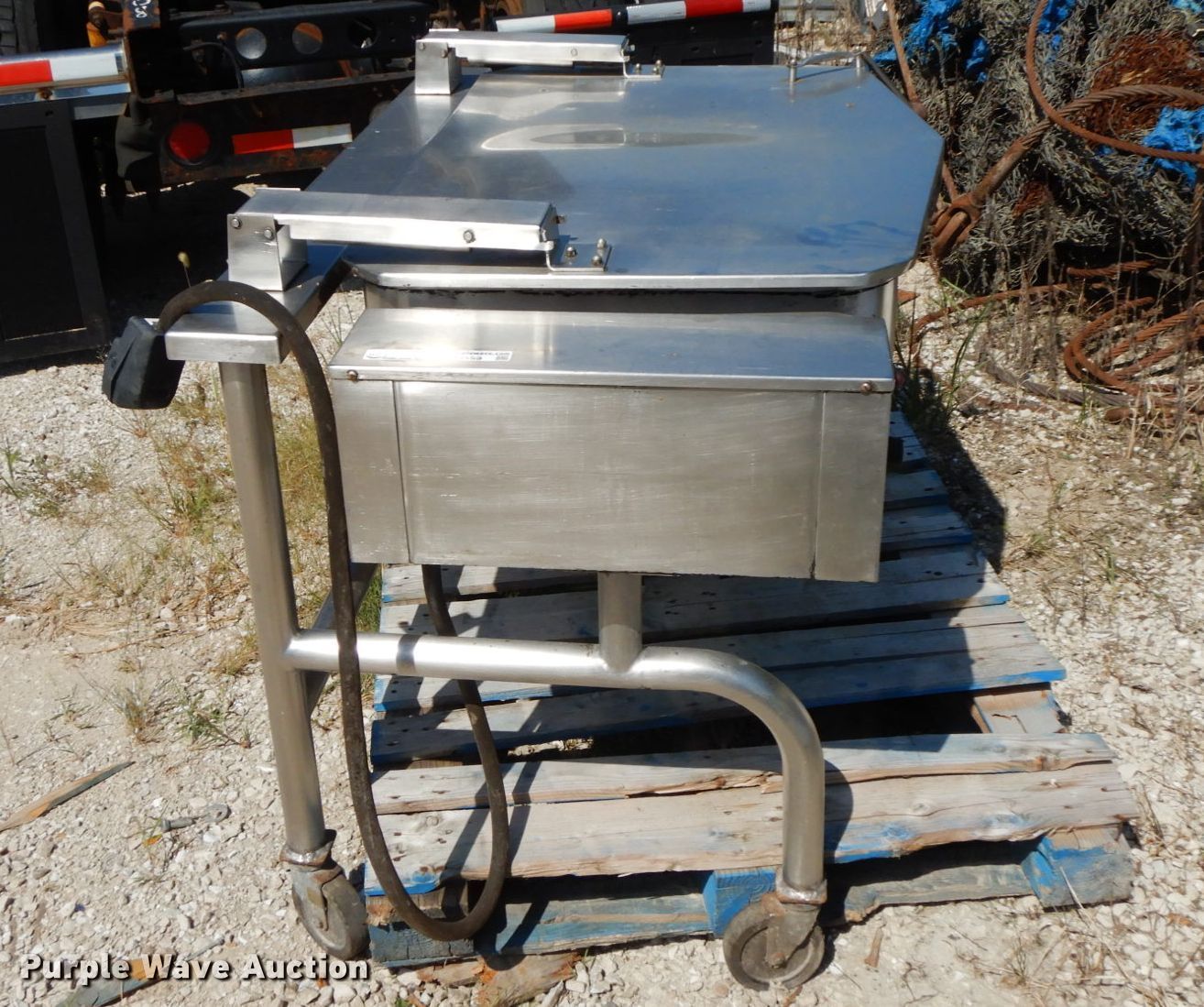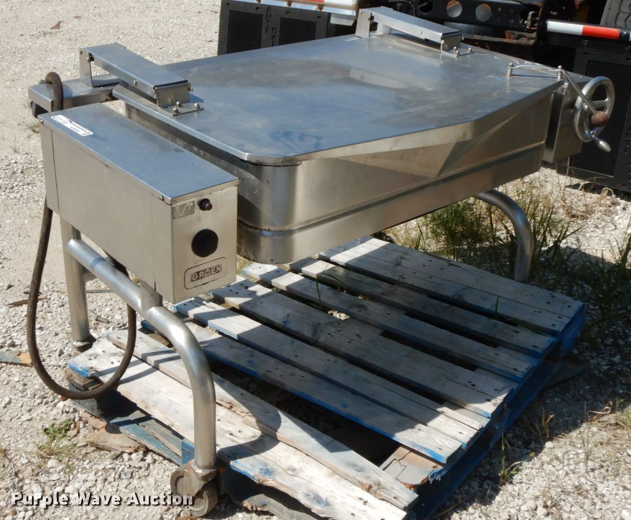 Purple Wave is selling a used Sporting Goods in Illinois. This item is a Groen fish fryer with the following: 5' x 3', Electric operation, Manual tub dump, Casters