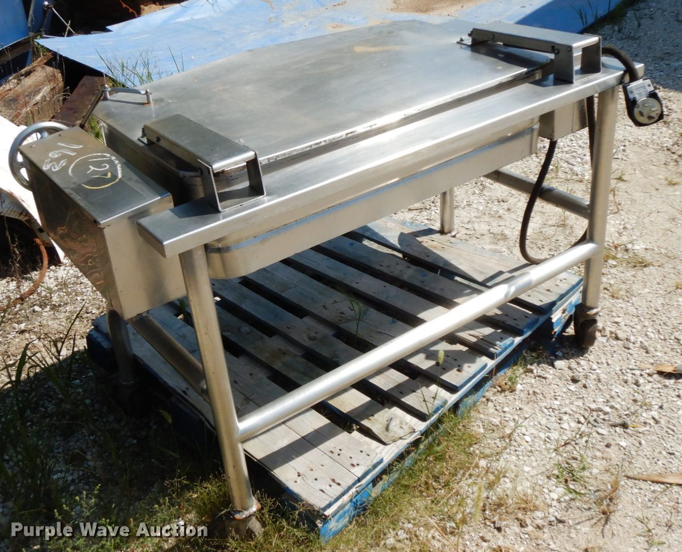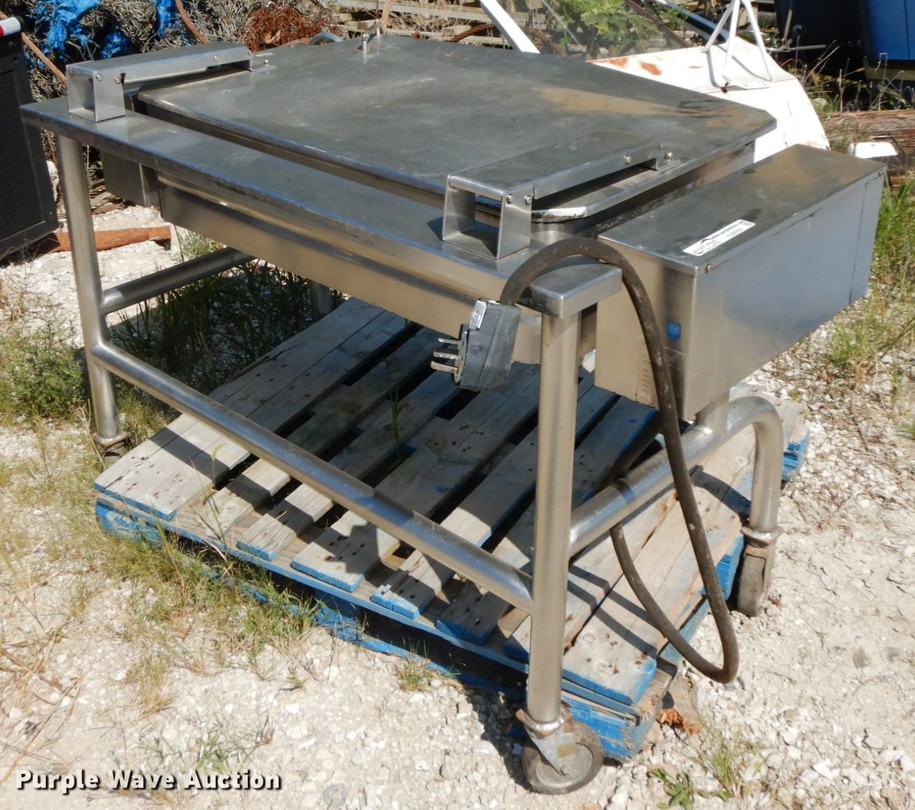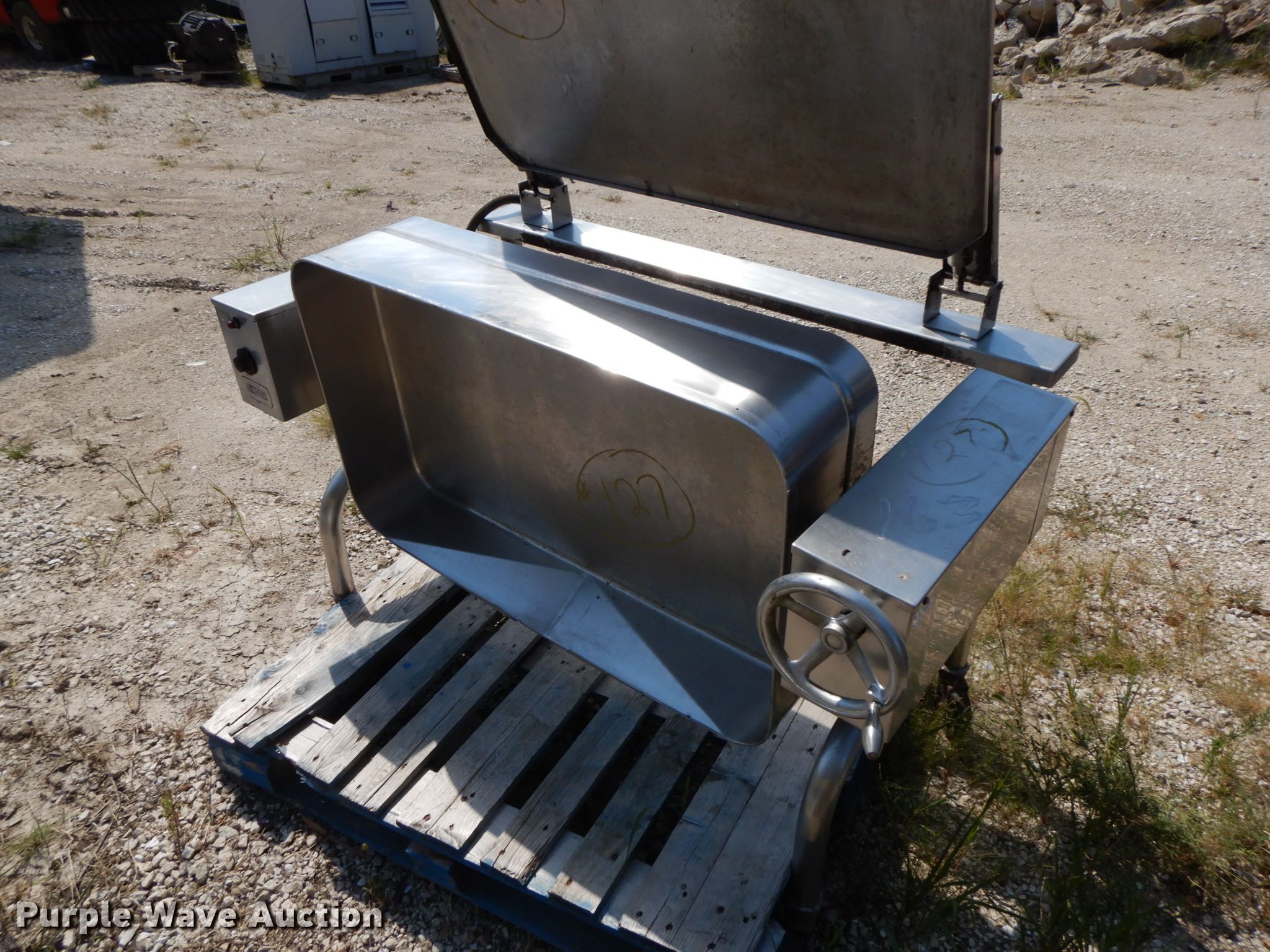 Purple Wave is selling a used Sporting Goods in Illinois. This item is a Groen fish fryer with the following: 5' x 3', Electric operation, Manual tub dump, Casters
