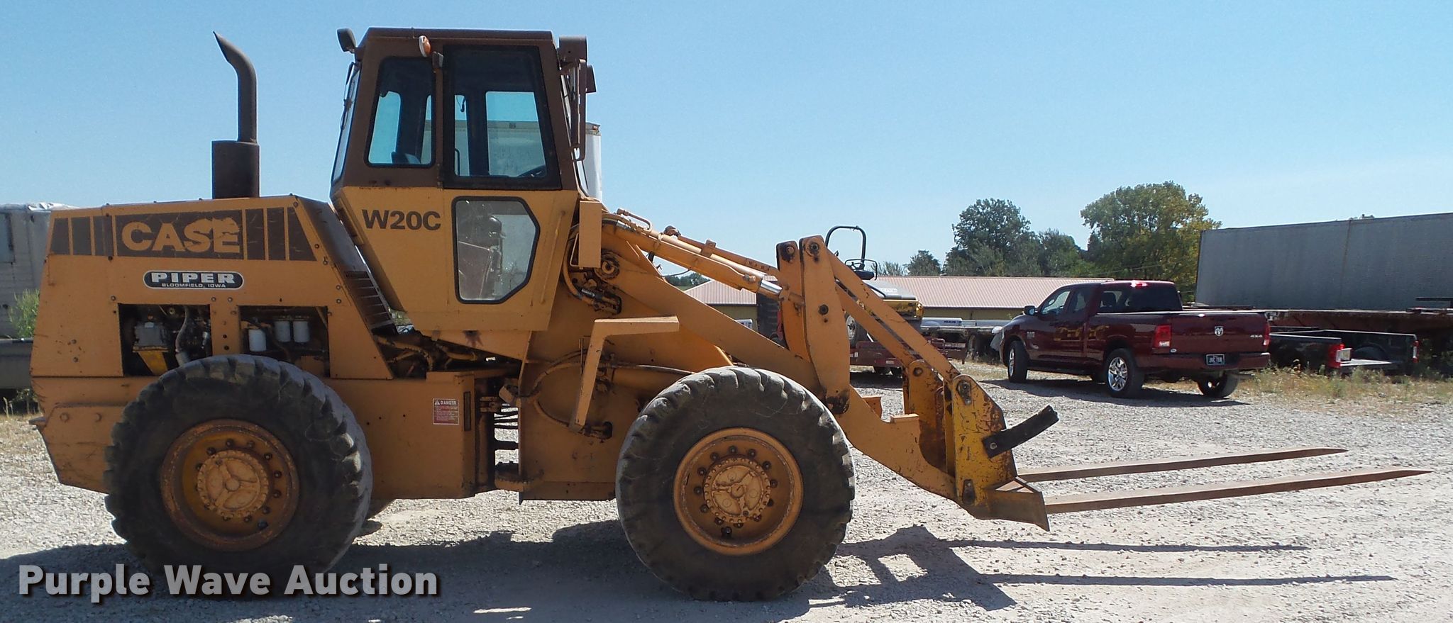 1987 Case W20C wheel loader. Serial: 9164990. Engine Case A504BD, Displacement: 504 C.I.D., Cylinders: 6, Fuel type: Diesel, HP: 110. Transmission Powershift, 4F - 2R. Chassis Differential lock: Rear. Operators station EROPS Heat, Bucket controls: Two-lever. Operational Forks Length: 102", Counter weights. Tires Size: 17.5-25 L-5, Foam filled. Notes Windshield chipped or cracked. Piper Motor Company. 607 S East St. Bloomfield, IA 52537