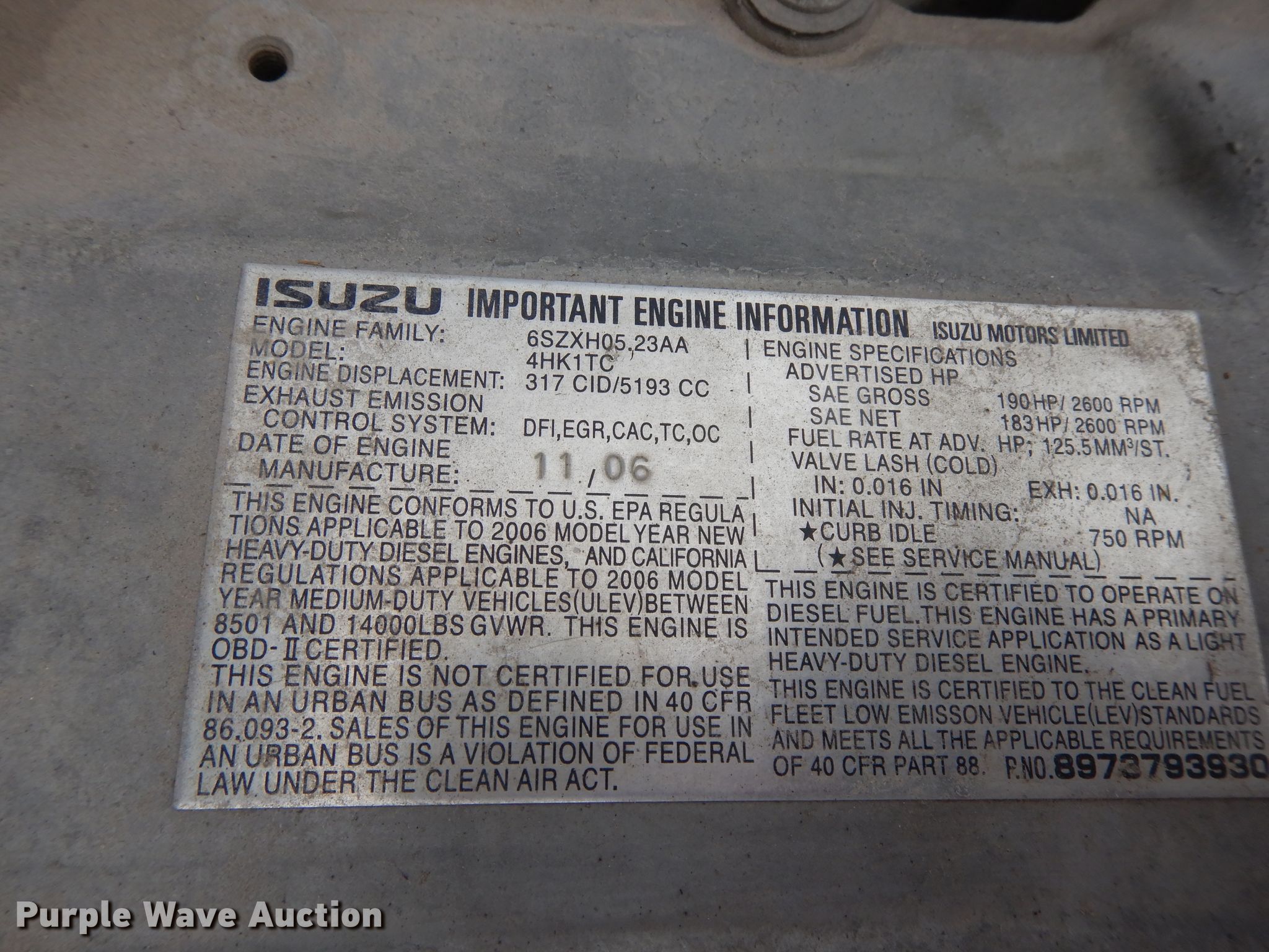 2006 Isuzu sewer jetter truck. 91,079 miles on odometer. Engine Displacement: 5.2L, Cylinders: 4, Fuel type: Diesel. Transmission Automatic. Chassis Axles: Single, Suspension: Spring, Brakes: Hydraulic. Interior AC, Heat. Operational Bed/ tank Capacity: 500 gallons, Top hatches: 1, Engine Hatz, Cylinders: 3, Fuel: Diesel, Water pump Harben, Serial: 17733, PSI: 4,000, Rear hose reel Diameter: 22". Tires Size: 215/85R16. Notes Unknown operating condition of jetter engine, AC blows warm. Kansas title. JALB4B16367024612. Reddi Services. 4011 Bonner Industrial Dr. Shawnee Mission, KS 66226