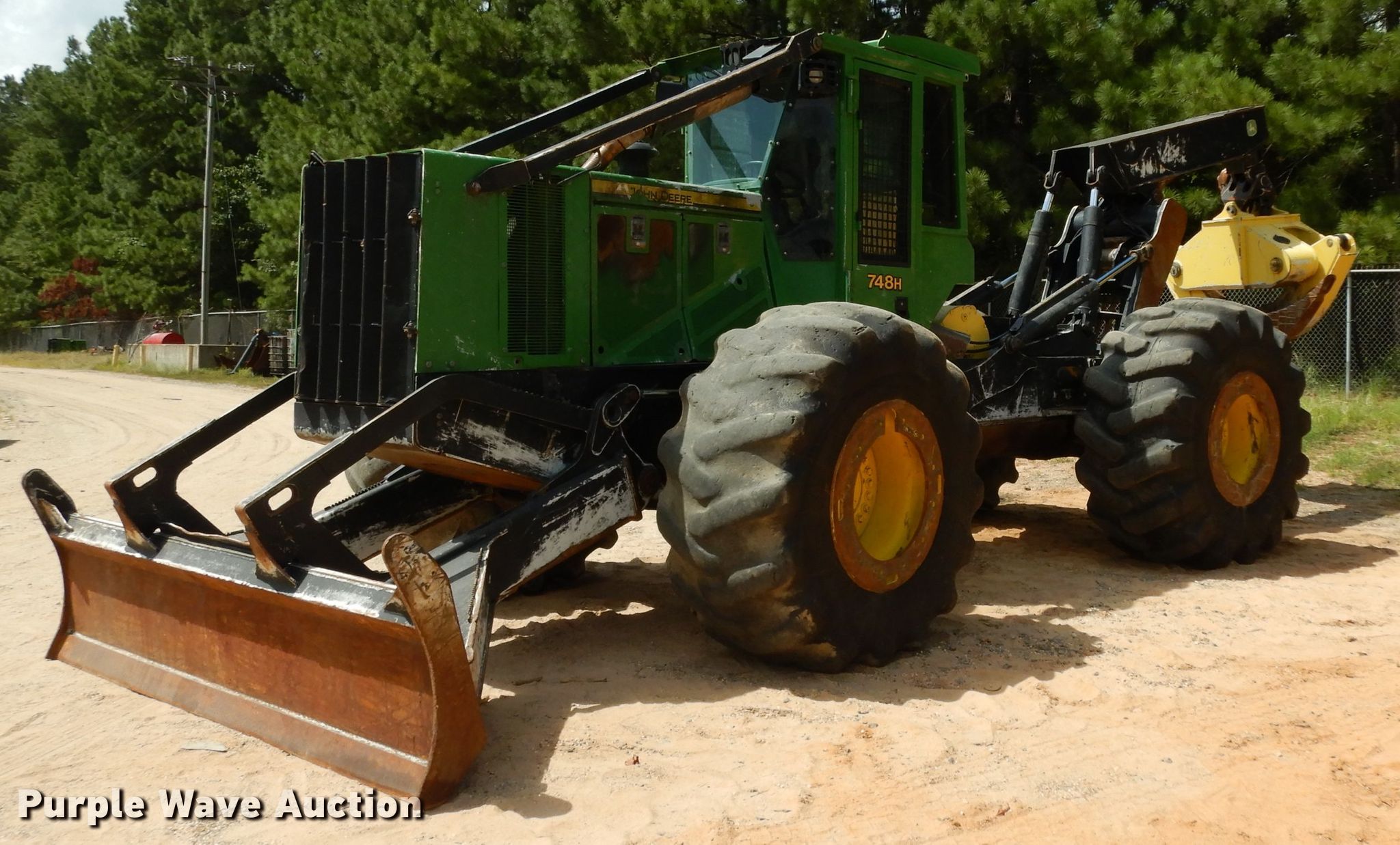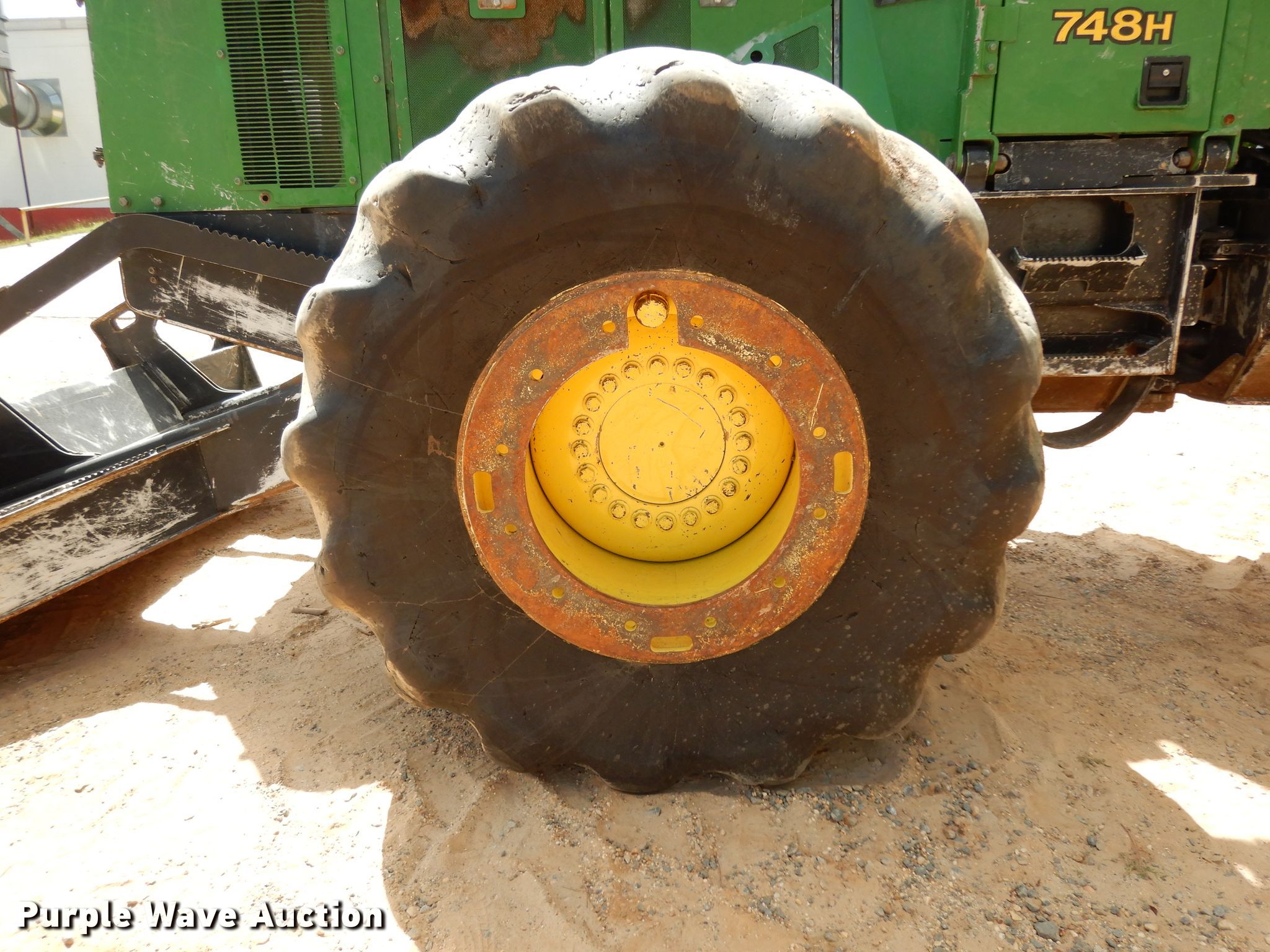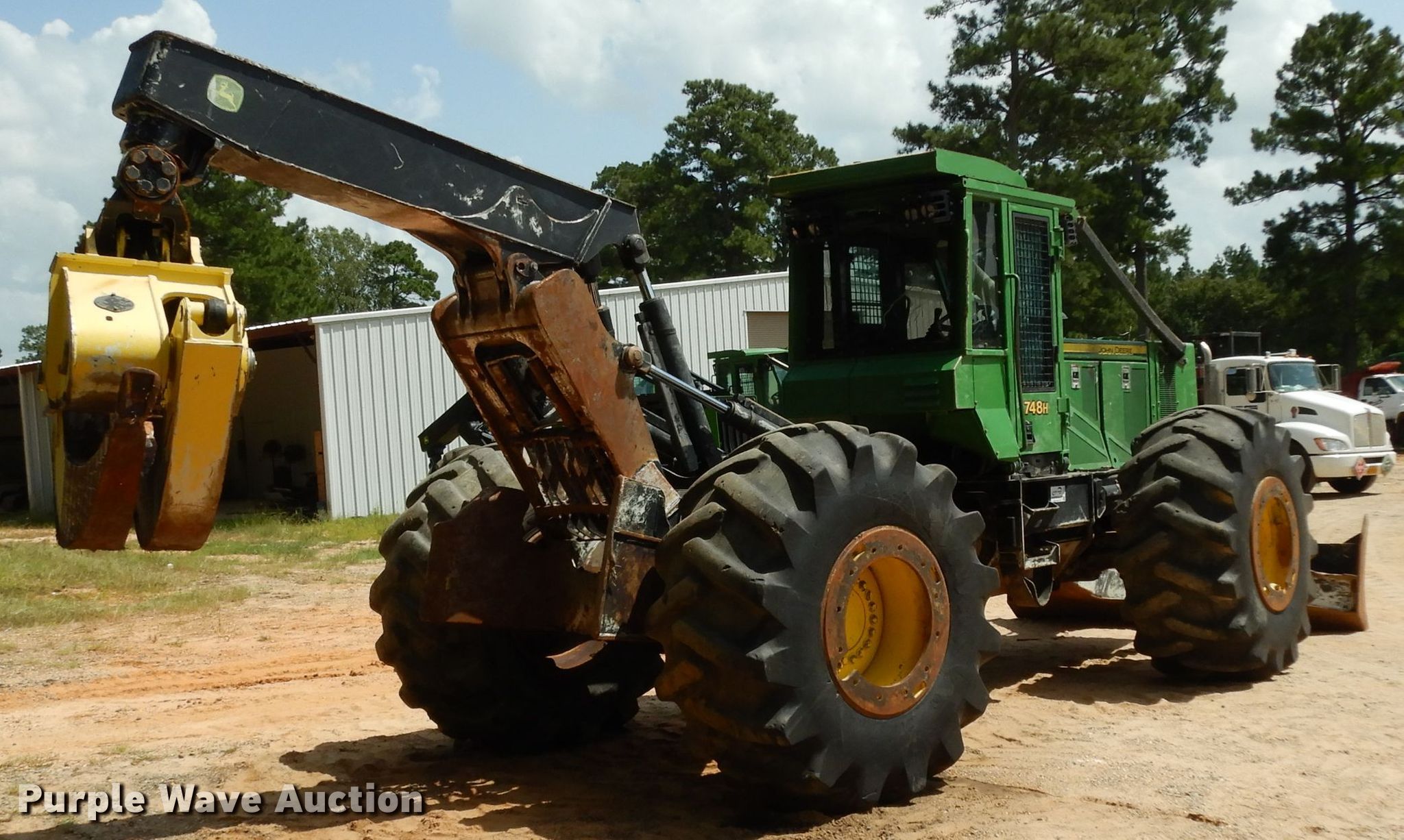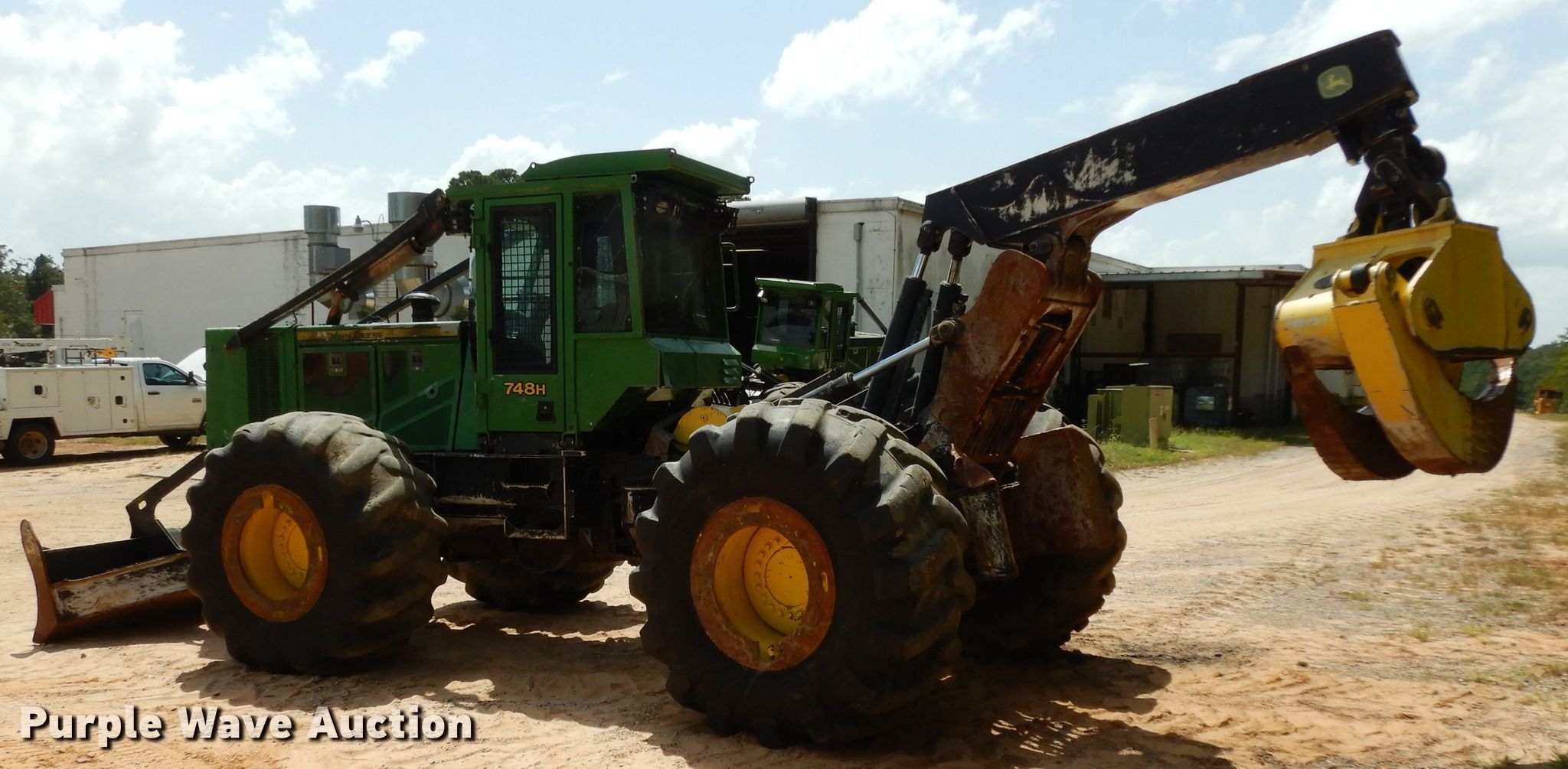 Purple Wave is selling a used Skidder in Arkansas. This item is a 2014 John Deere 748H skidder with the following: 13,310 hours on meter, John Deere 6068HD71 6.8L six cylinder diesel engine, Serial PE6068L254425, Powershift transmission, 8F-7R gears, Enclosed cab, AC and heat, Joystick controls, 116"W backfill blade, 10'6" grapple opening, 30.5-32 tires, Serial 1DW748HXJED659465