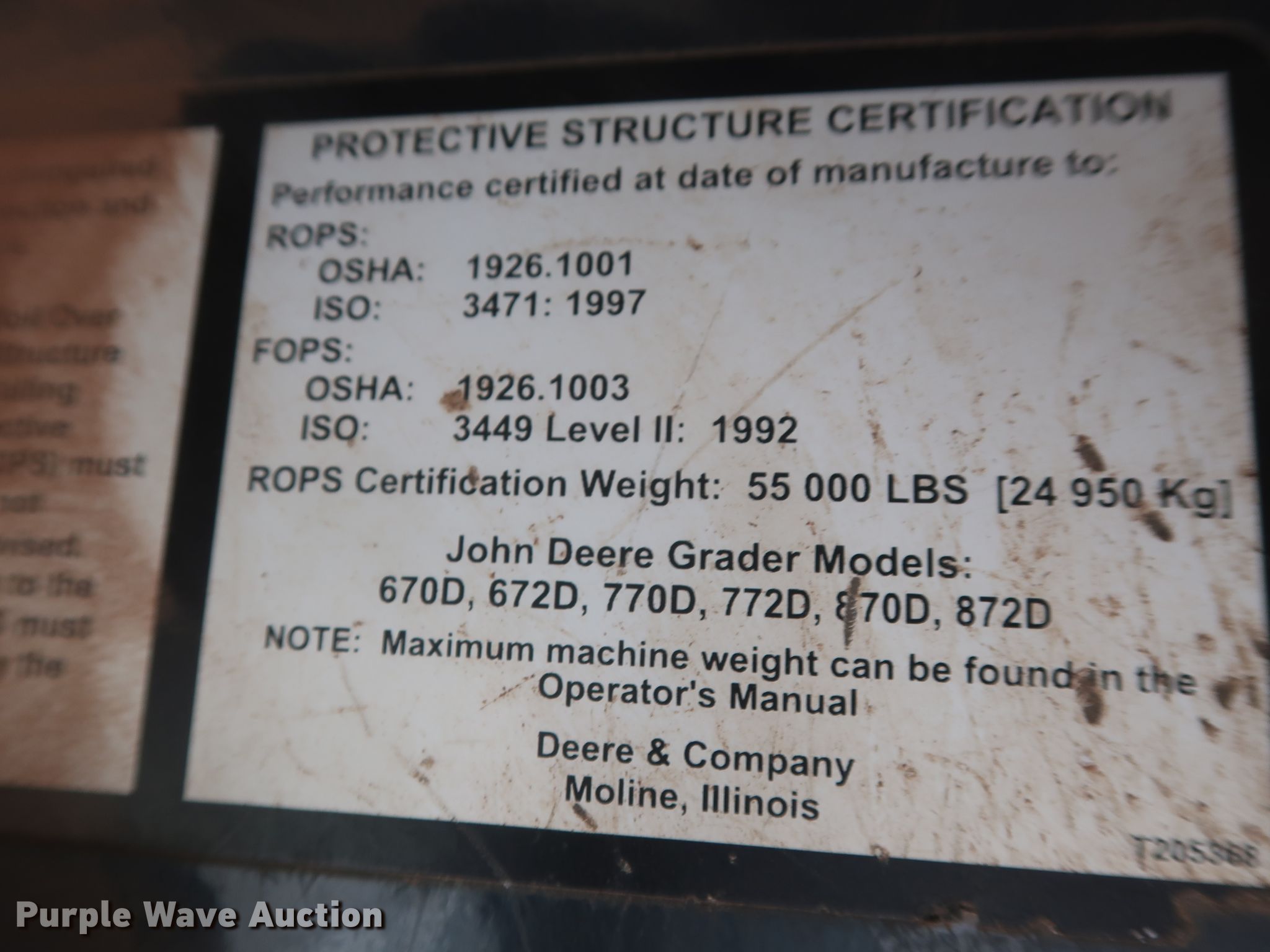 Purple Wave is selling a used Motor Grader in Oklahoma. This item is a 2005 John Deere 672D motor grader with the following: 16,872 hours on meter, Serial: DW672DX598116, Unit #: 24-115