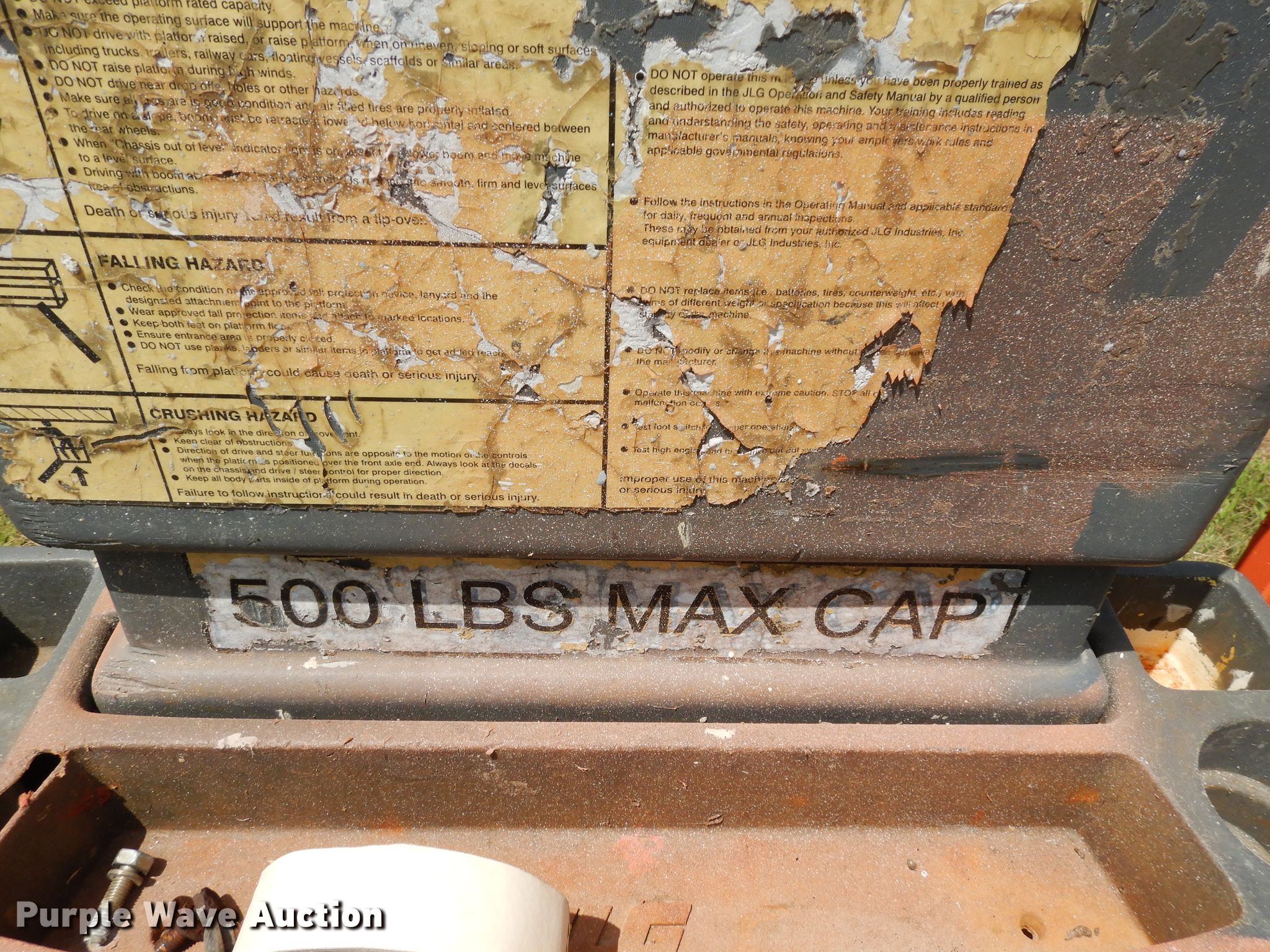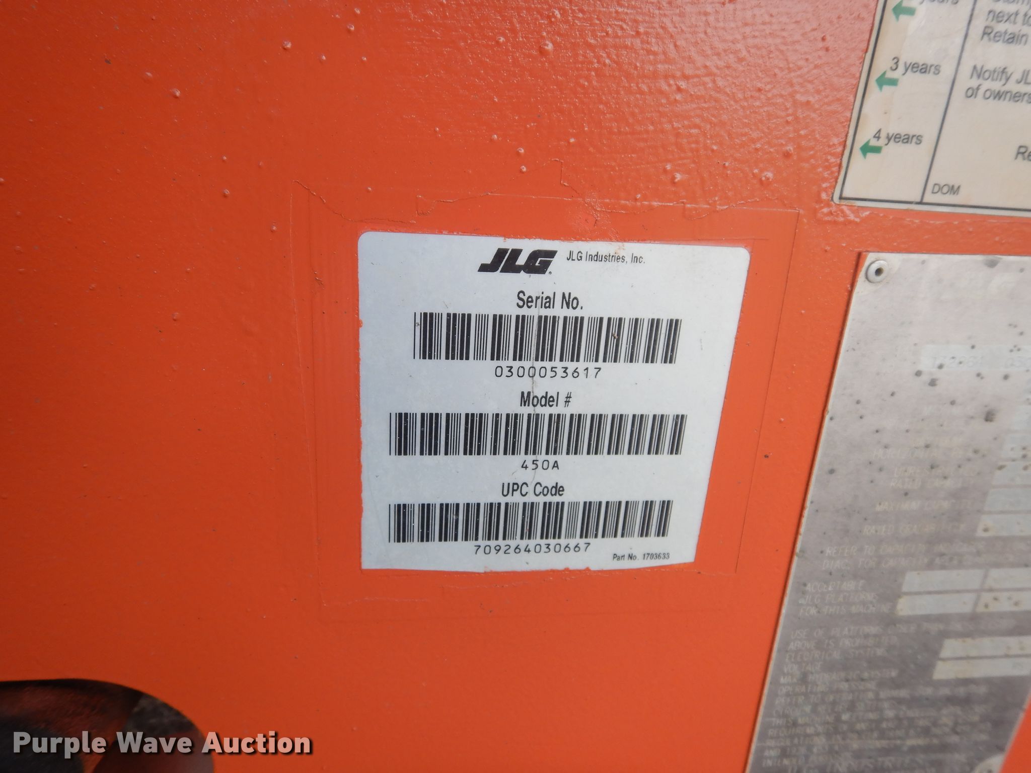2000 JLG 450AJ boom lift. 7,770 hours on meter, Serial: 0300053617. Operational Rough terrain, Maximum lift capacity: 500 lbs, Maximum reach length: 24', Maximum lift height: 45', Platform: 72" L x 29" W, AC power outlet, Controls: Platform, Ground, Platform rotation: Hydraulic, Safety alarm. Tires Tire size: 33x15.5-16.5. Notes Flywheel needs replaced , Non-operational unit. IMI Worldwide. 200 N Mill St. Pryor, OK 74361