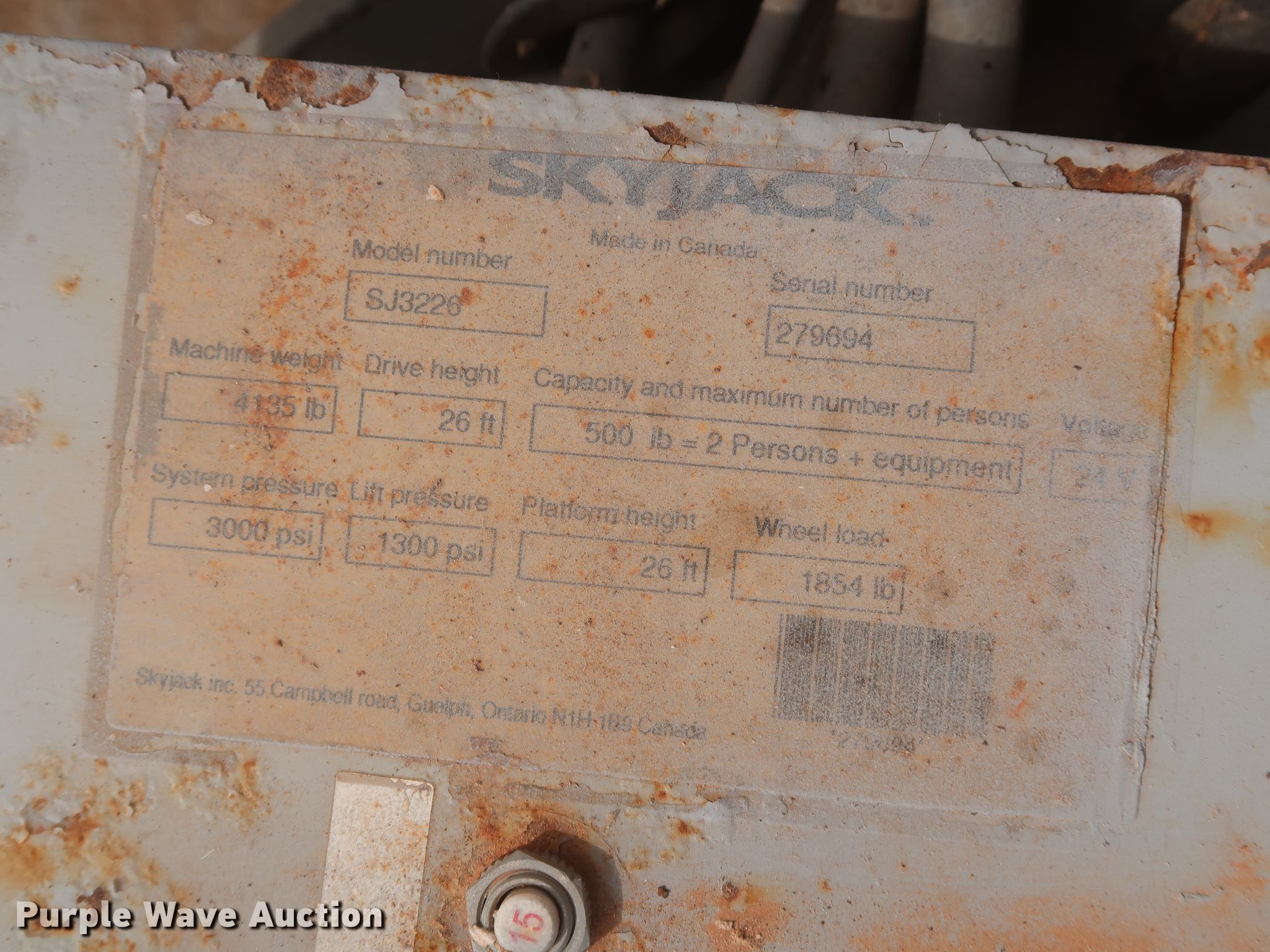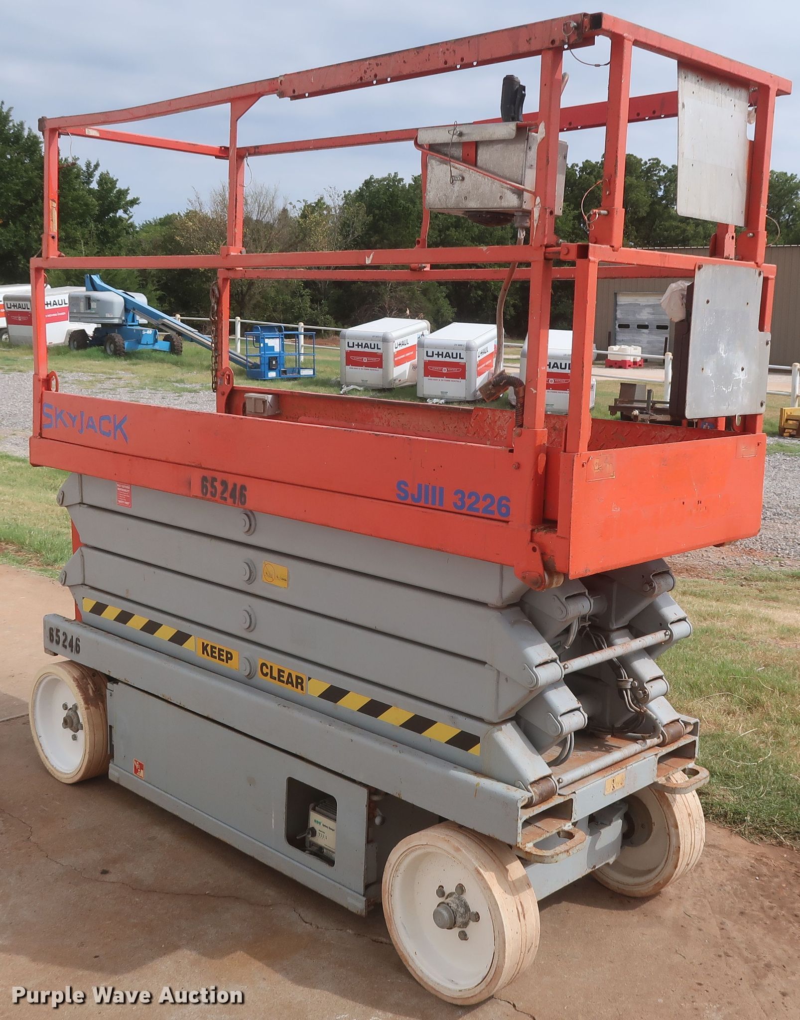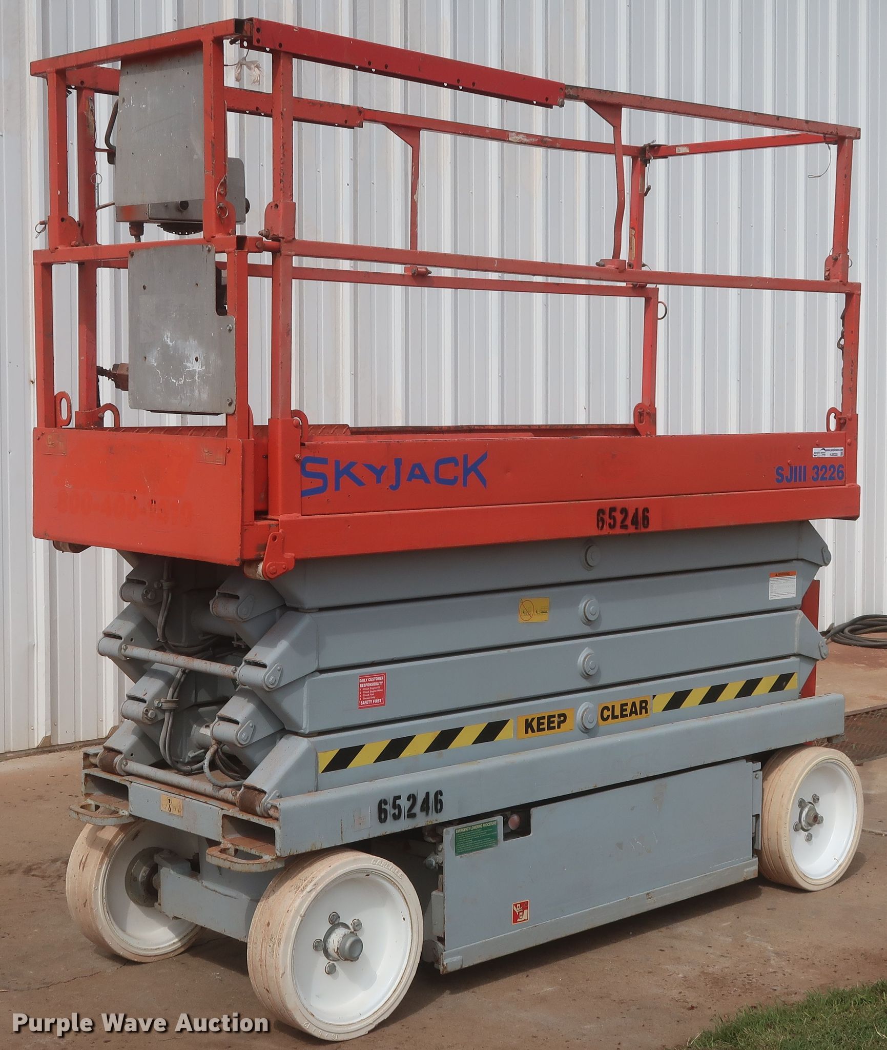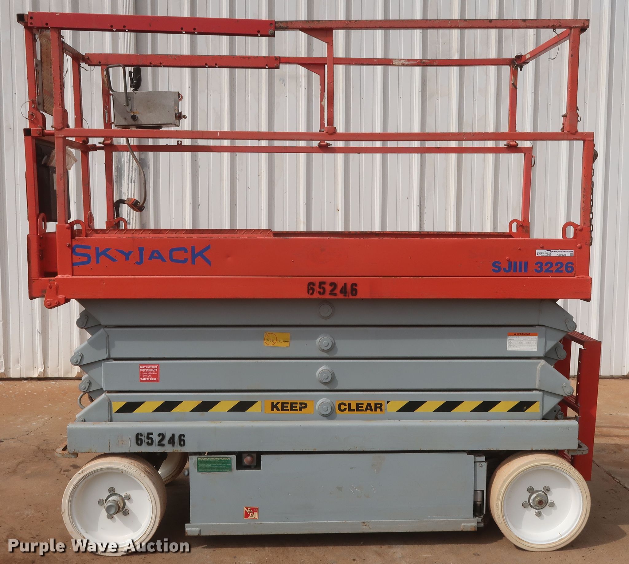 Purple Wave is selling a used Scissor or Vertical Lift in Oklahoma. This item is a Skyjack SJIII 3226 scissor lift with the following: 382 hours on meter, Serial: 279694