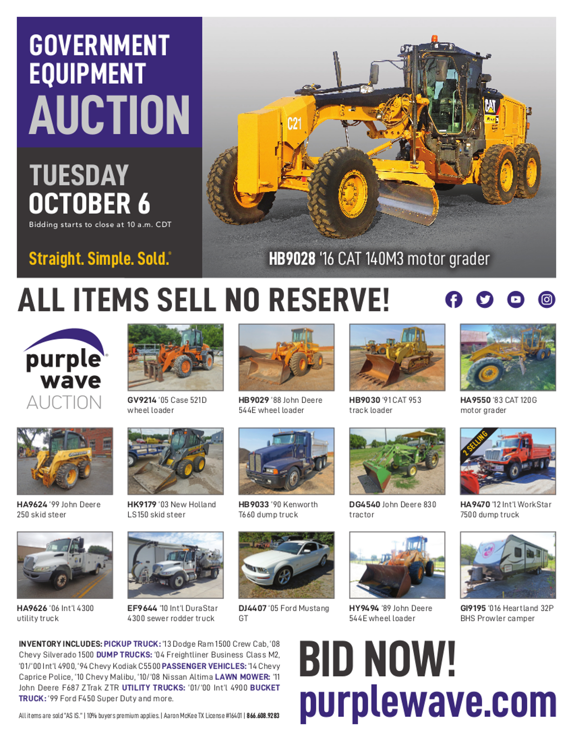 This auction is conducted by Purple Wave, Inc., whose home office is 825 Levee Drive, Manhattan, Kansas. Aaron McKee, Texas auctioneer license # 16401, operates Purple Wave, Inc. Complaints against us may be directed to the Texas Department of Licensing and Regulation, P.O. Box 12157, Austin, Texas 78711, (512) 463-6599. For additional required information, see the attached document.