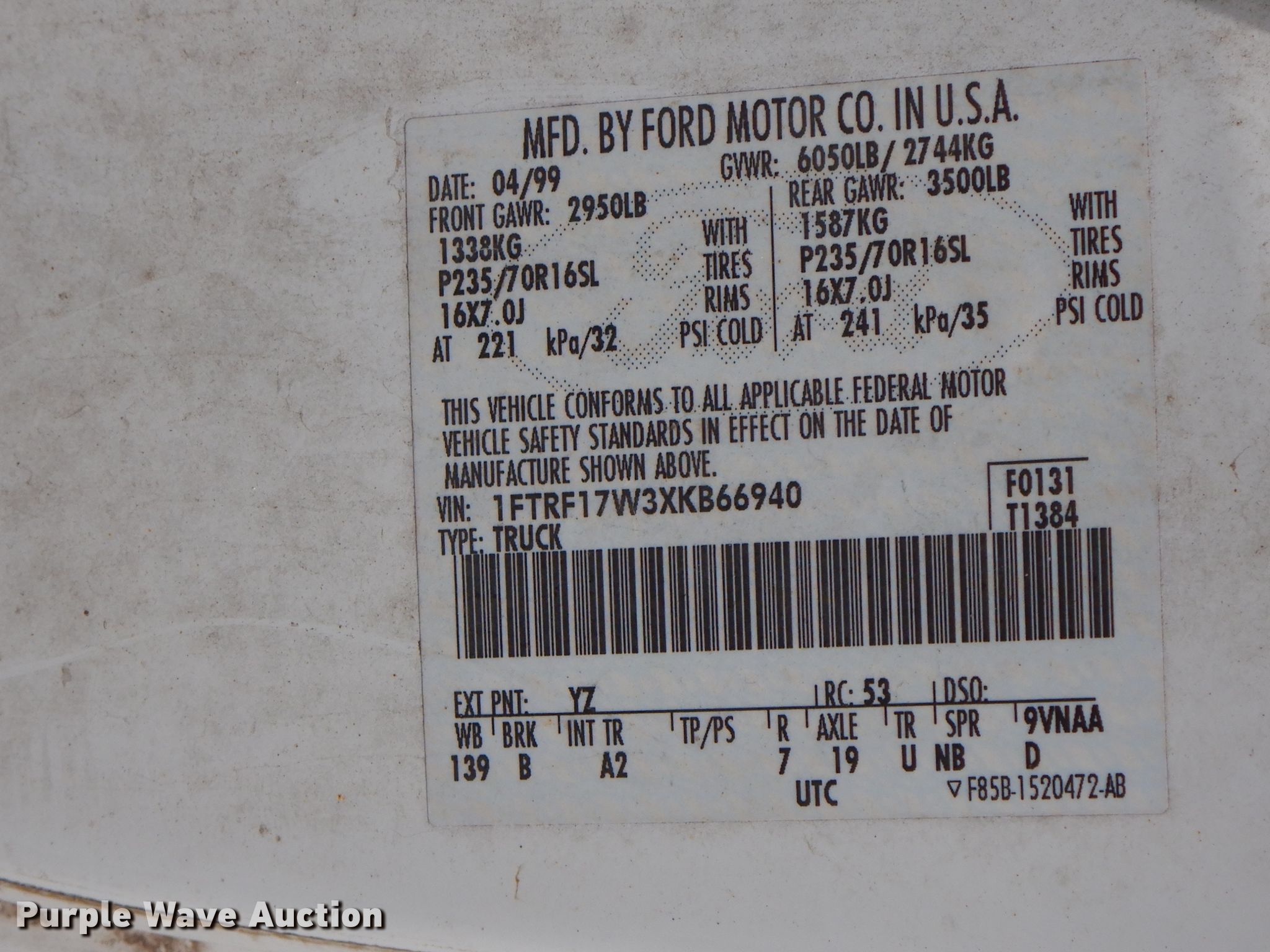 1999 Ford F150 pickup truck. 107,817 miles on odometer. Engine Displacement: 4.6L V8 SOHC 16V, Cylinders: 8, Fuel type: Gas. Transmission Automatic. Interior AC, Heat, Cruise control. Tires Size: 235/70R16. Kansas title. Title distribution may be delayed up to 14 days from verification of funds. 1FTRF17W3XKB66940. City of Chanute. 1002 E 14th St. Chanute, KS 66720