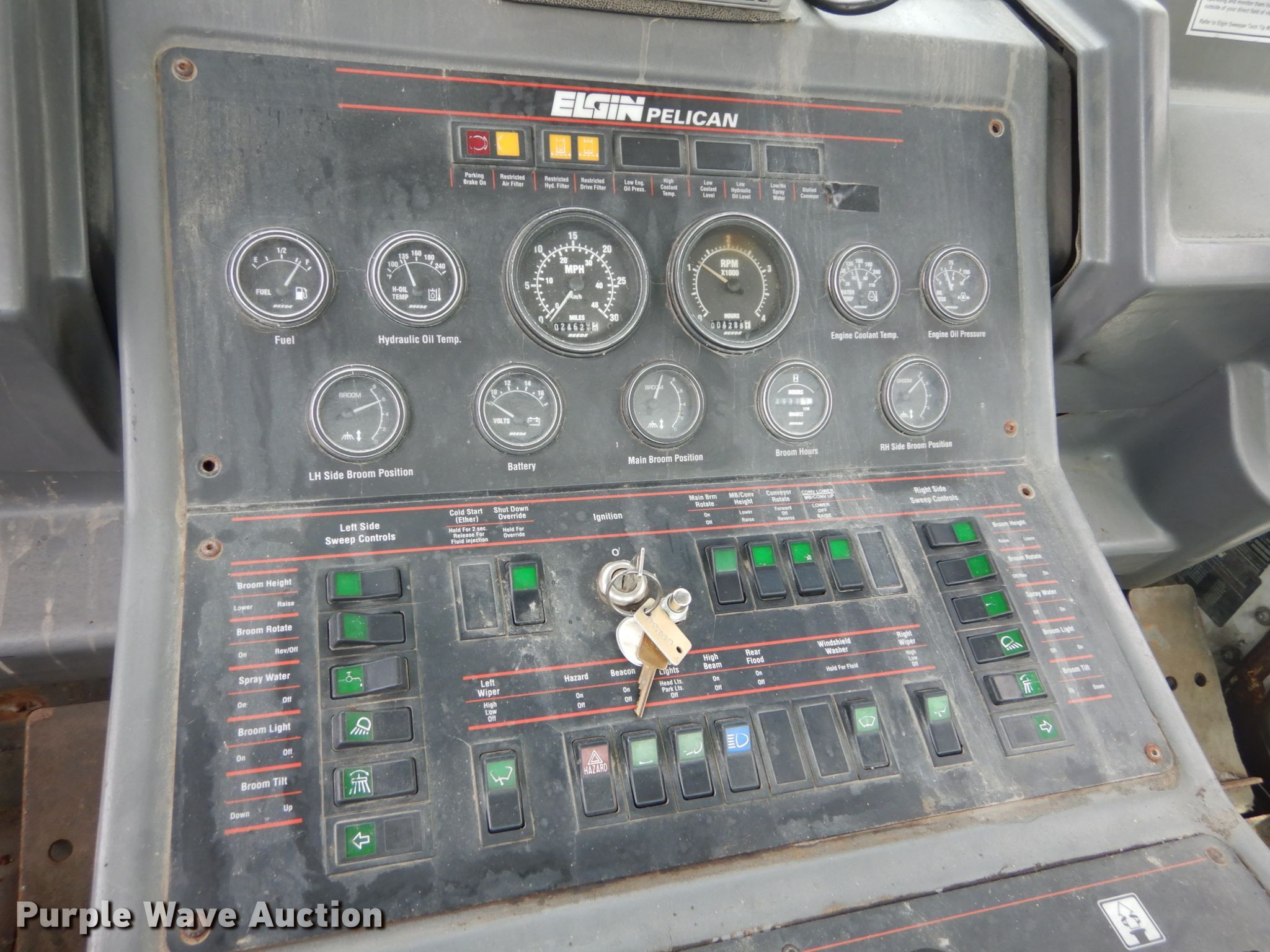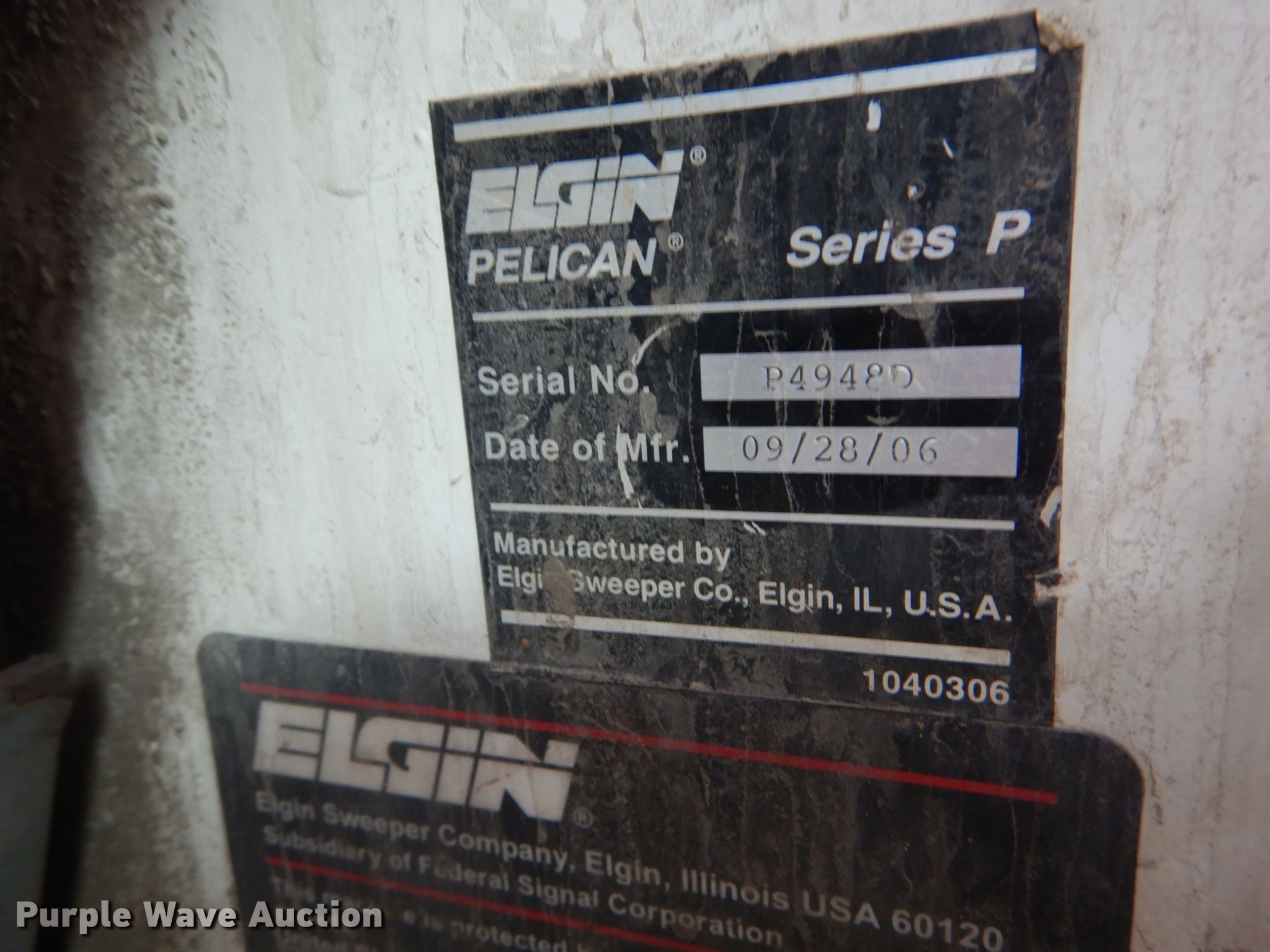 Purple Wave is selling a used Street Sweeper Truck in Missouri. This item is a 2006 Elgin Pelican P street sweeper with the following: 24,621 miles on odometer, Engine hours on meter: 4,288, Sweeper hours on meter: 2,097, Serial: P4948D, Unit #: G9238