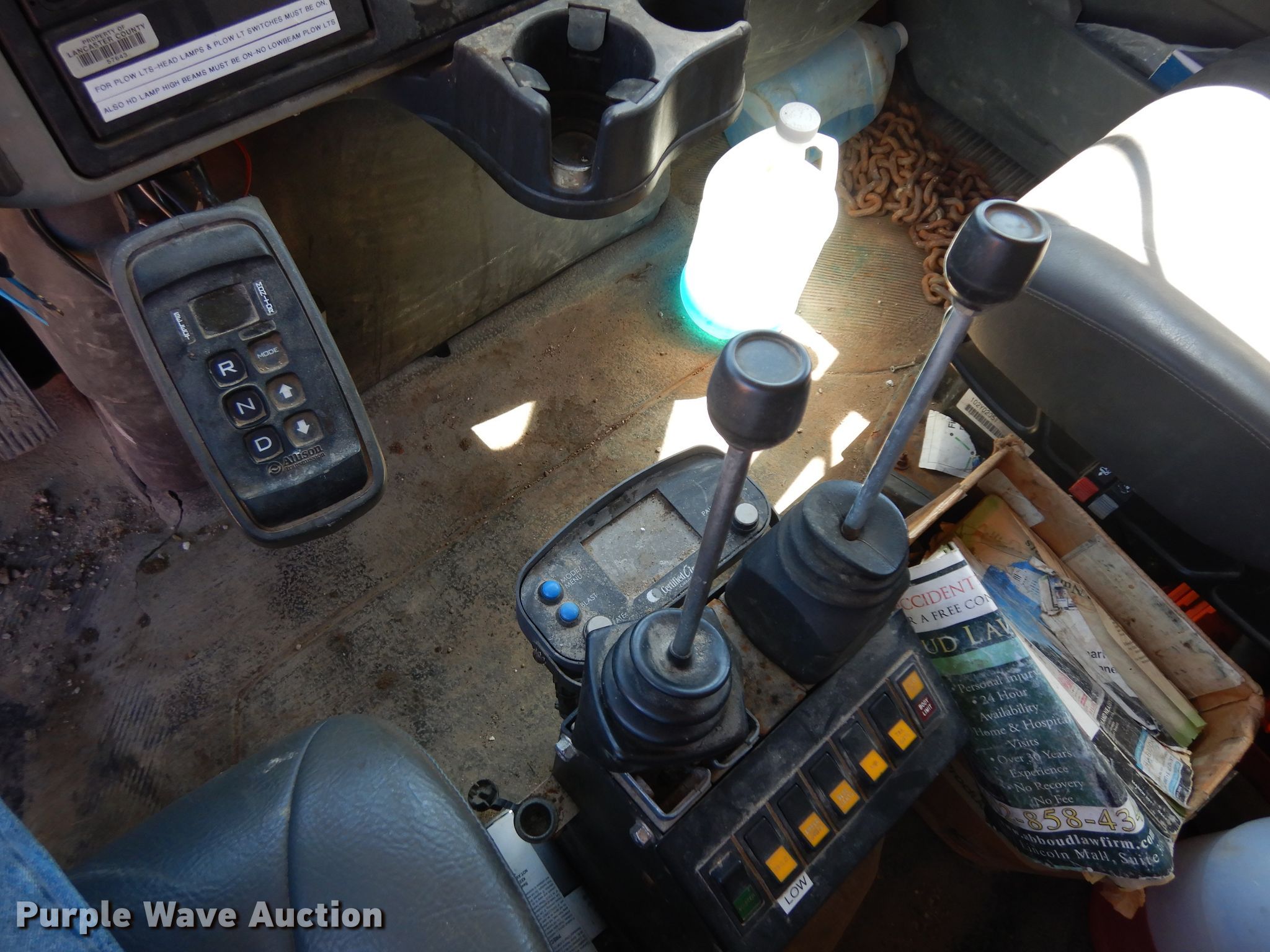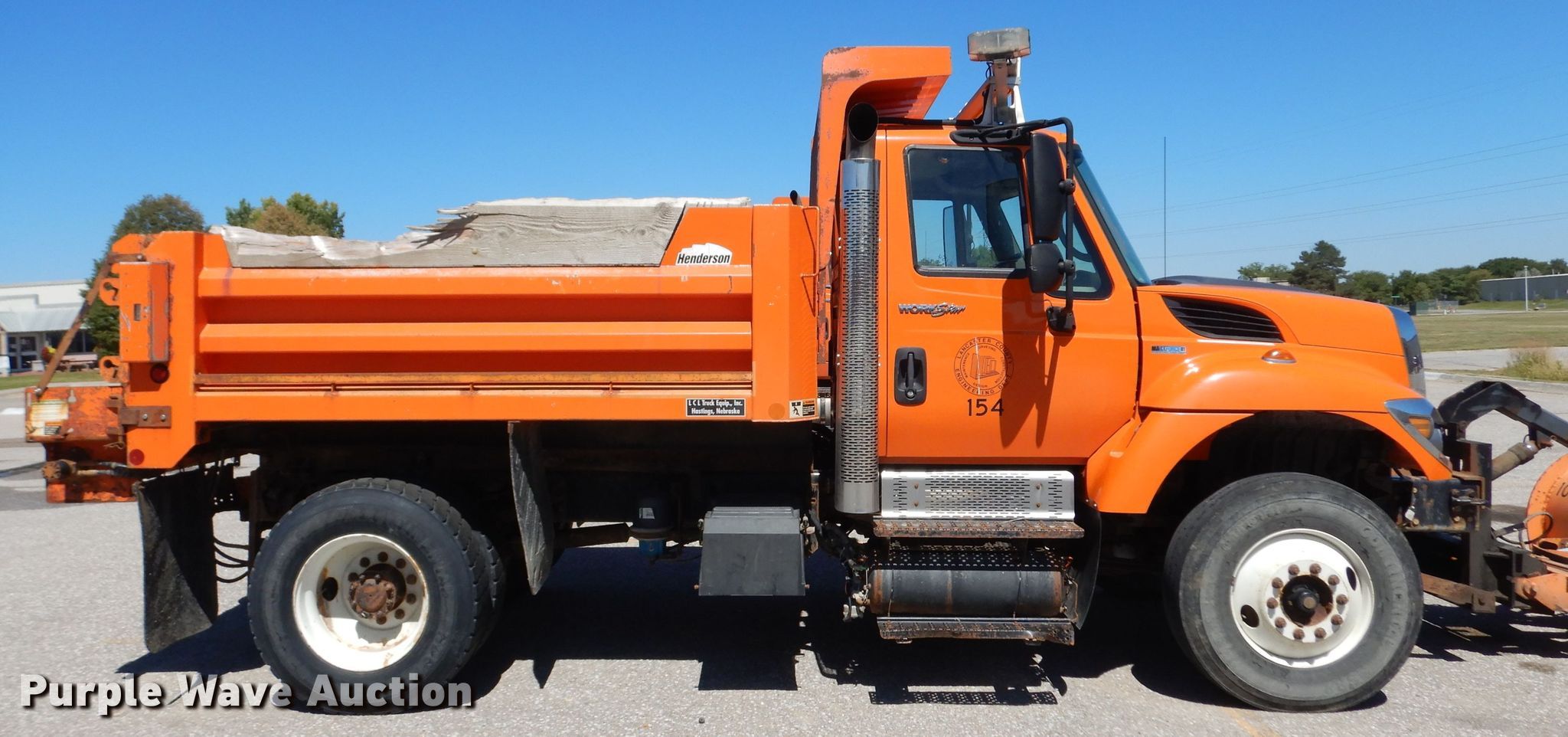 2010 International WorkStar 7300 dump truck. 135,070 miles on odometer, Engine hours: 7,145, Unit #: 154. Engine International MaxxForce DT, Displacement: 7.6L, Cylinders: 6, Fuel type: Diesel. Transmission Allison, Automatic. Chassis Axles: Single, Differential lock: Full, Suspension: Spring, Brakes: Air, PTO, GVWR: 36,220 lbs FAWR: 13,220 lbs, RAWR: 23,000 lbs. Interior AC, Heat, Heated mirrors, Cruise control. Operational Dump bed Henderson , 10' L x 96" W, Side height: 26", Side board height: 10", Bed type: Steel, Ram: Single , End gate: Air operated, Plow Henke, Width: 132". Tires Size: 11R22.5. Notes Engine fan broken, Radiator damaged, Non-operational unit. Nebraska title. 1HTWAAAR2AJ222886. Lancaster County Engineering Dept. 444 Cherrycreek Road Bldg. B. Lincoln, NE 68528