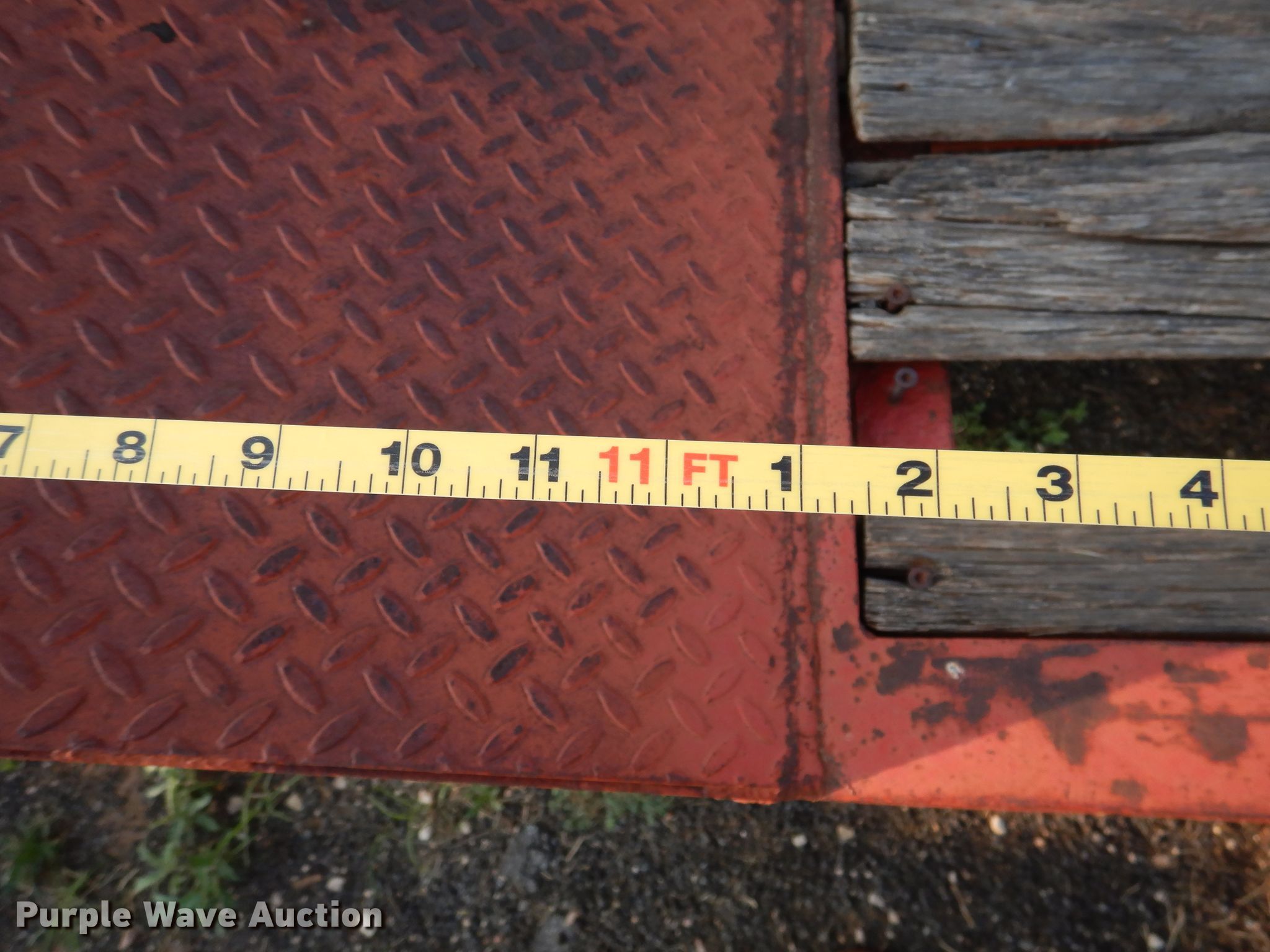 Purple Wave is selling a used Equip. Trailer in Texas. This item is a 1981 Vulcan equipment trailer with the following: 42'L x 8'W overall, 25'L x 8'W wood deck, 6' tail length, 3'L ramps, Dual leg landing gear, Spring suspension, Air brakes, Tandem axle, Steel wheels, 10.00R15 tires