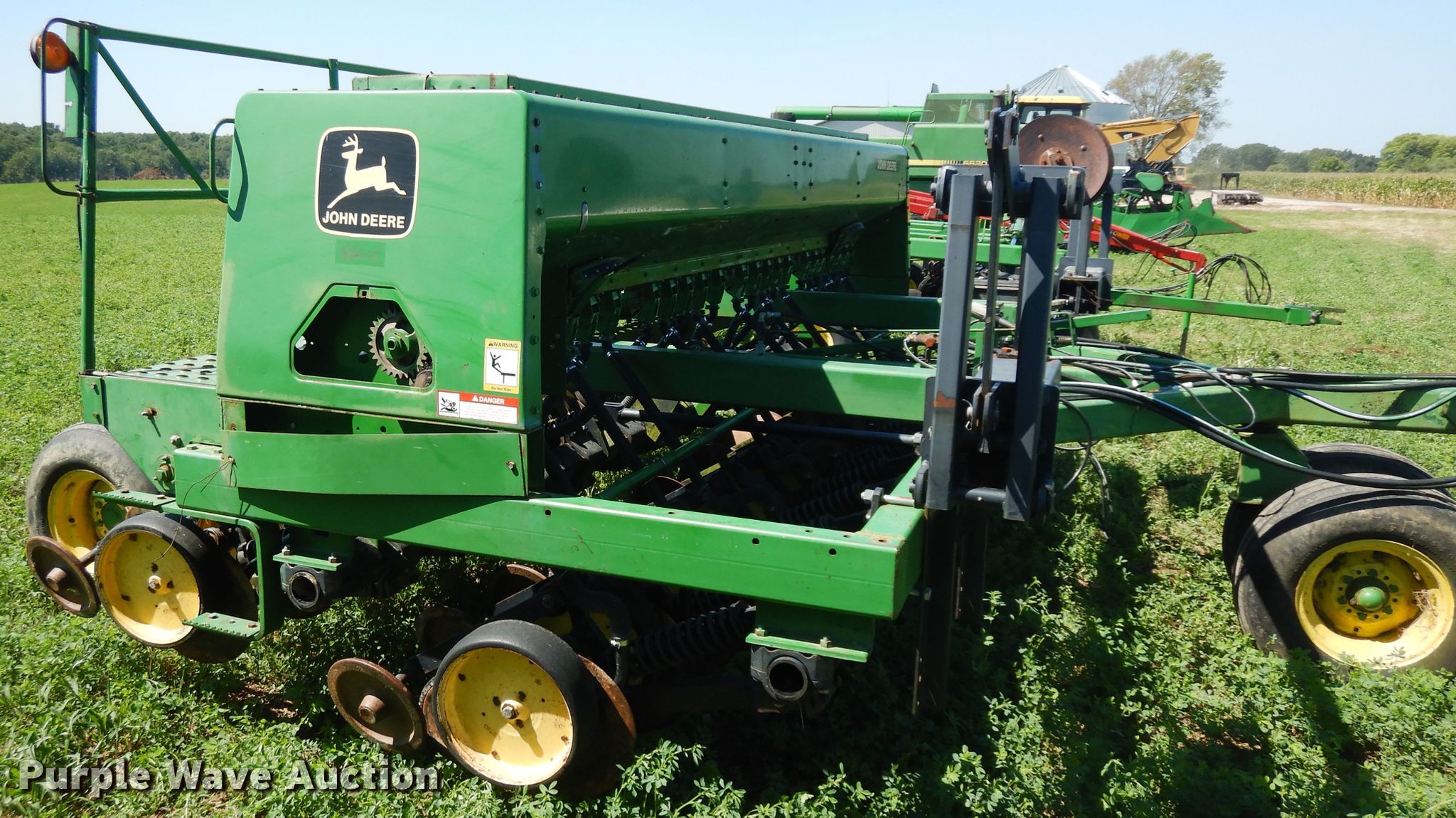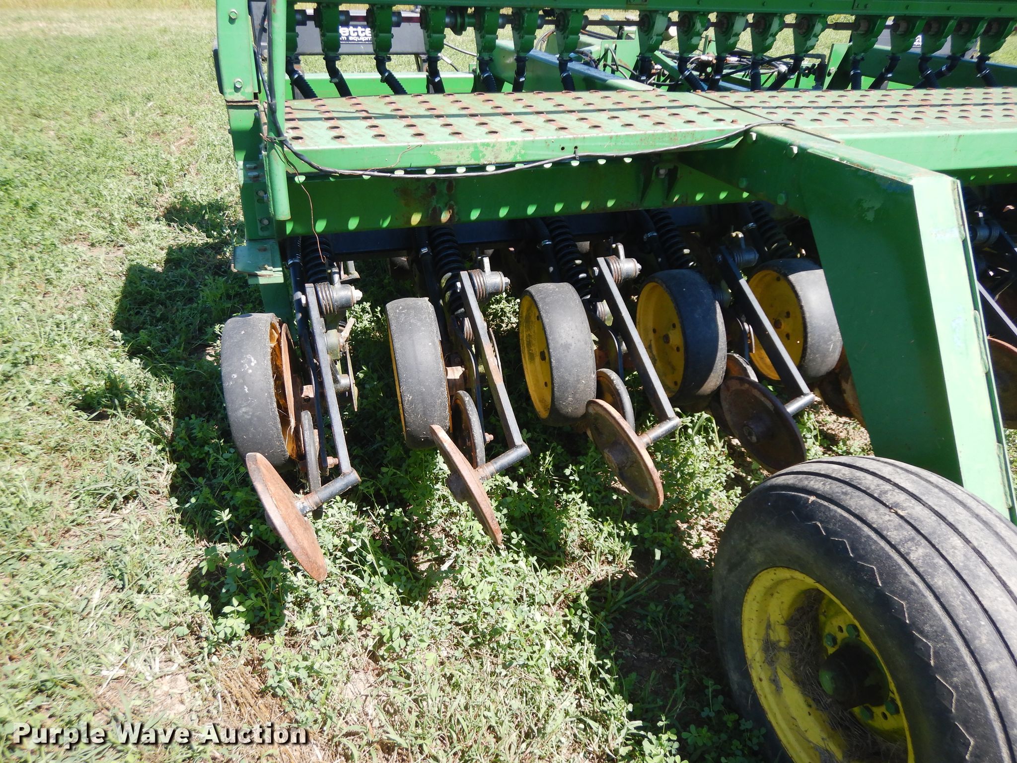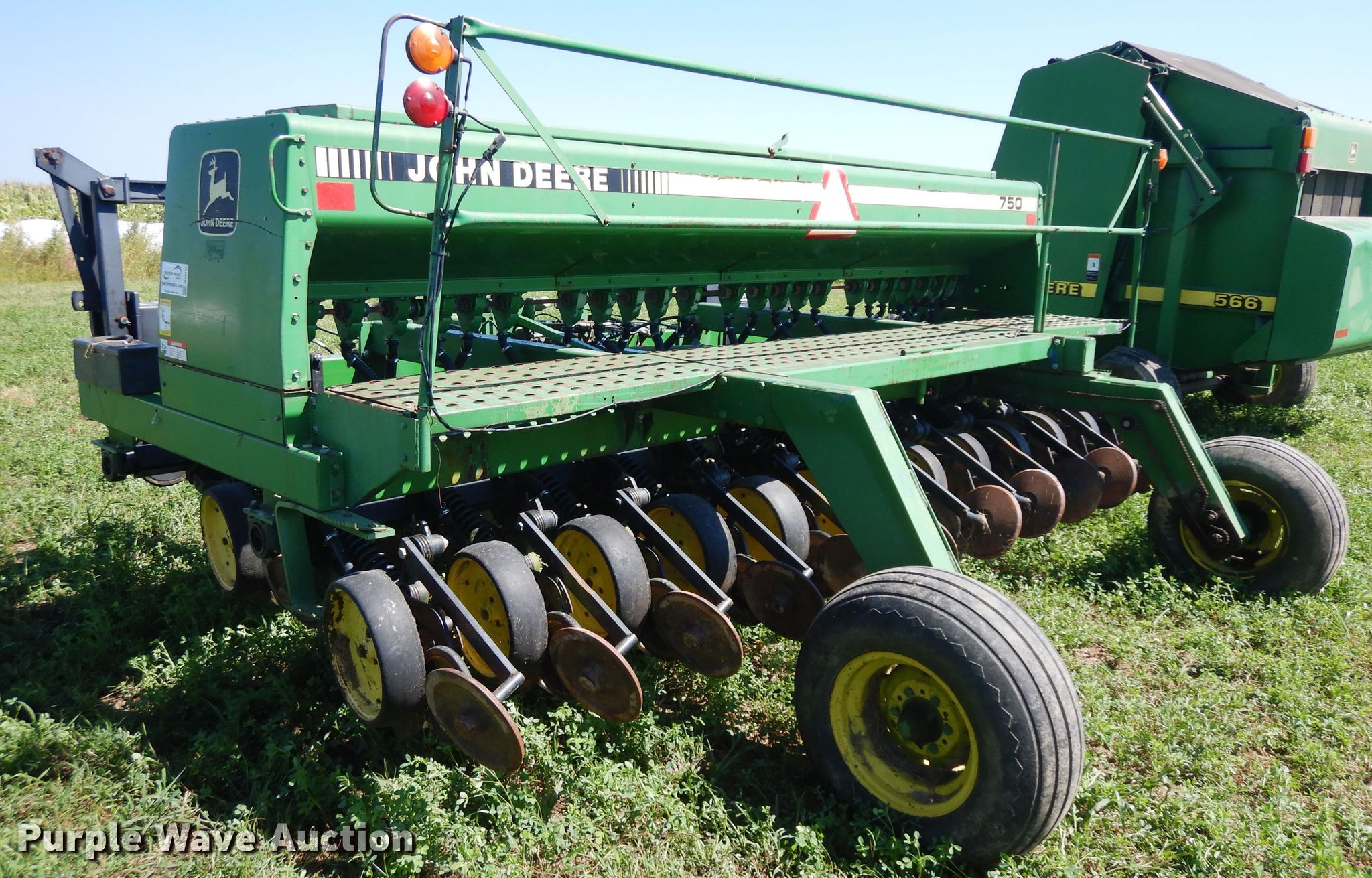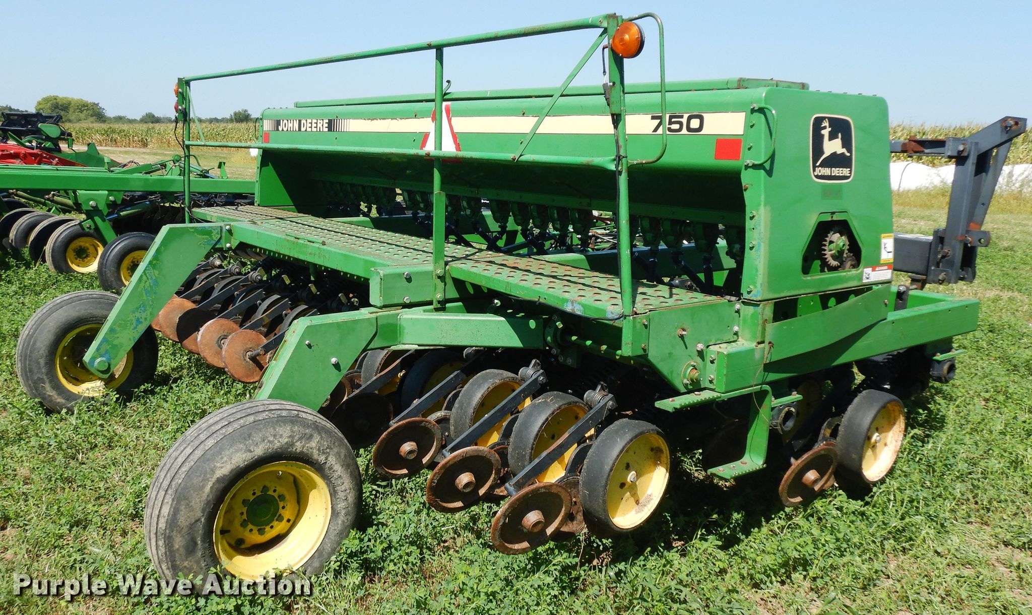 Purple Wave is selling a used Grain Drill or Seeder in Illinois. This item is a 2007 John Deere 750 split row grain drill with the following: 15'W, 12 row units, 7.5" row spacing, Marker arms, Front fold, Bulk fill system, Spring down pressure, Single disk openers, Single gauge wheels, Single rubber closing system, (2) 11L-15 transport tires, Serial 00750X008017