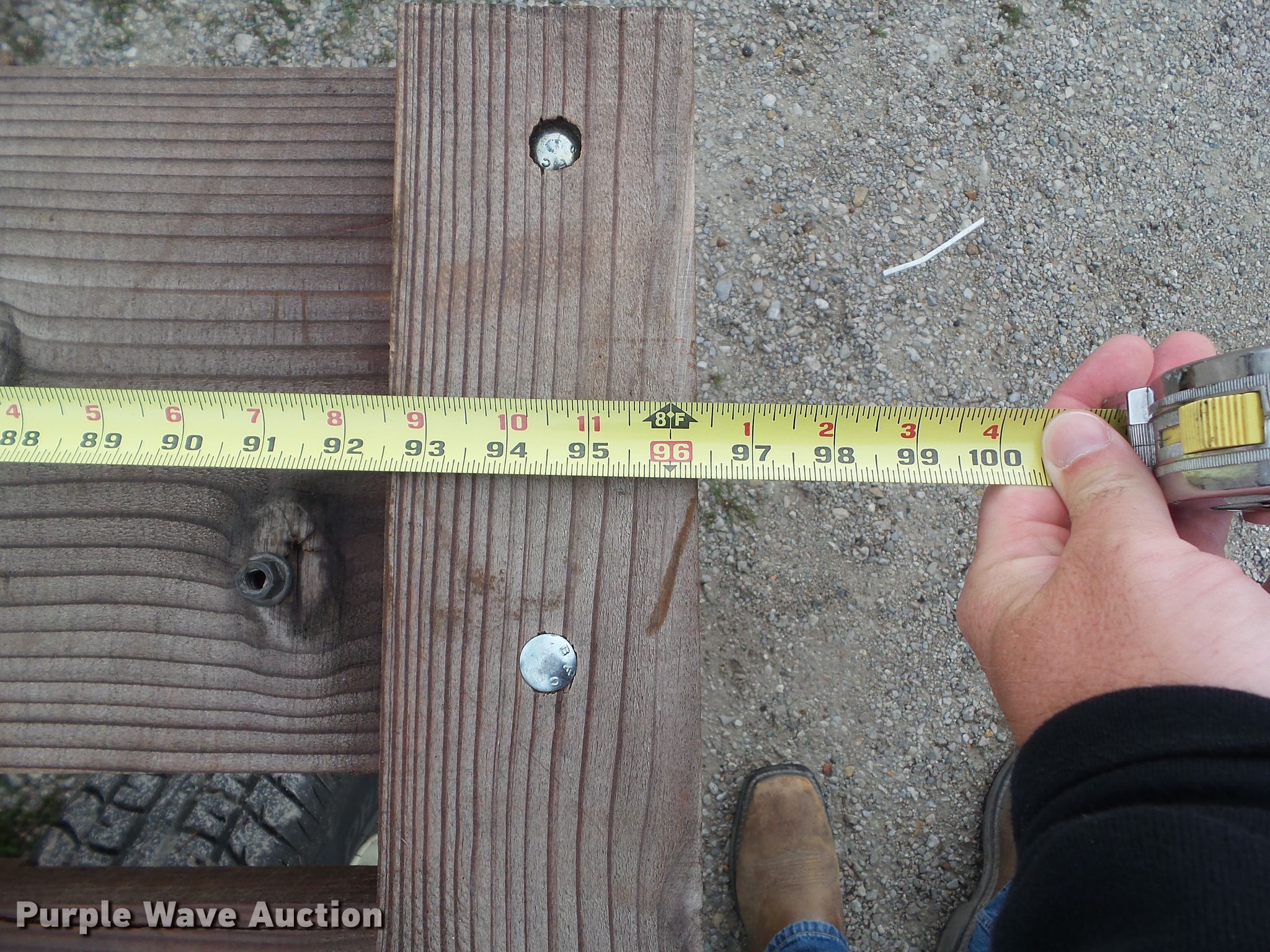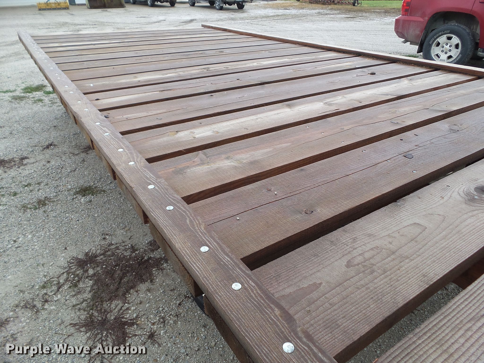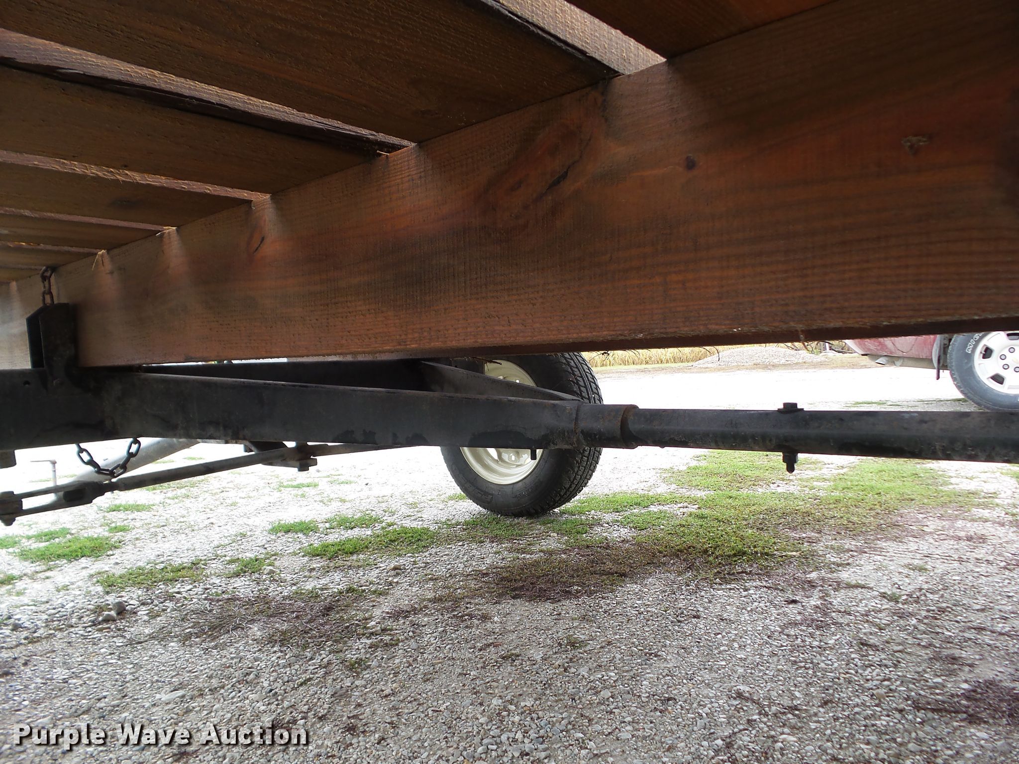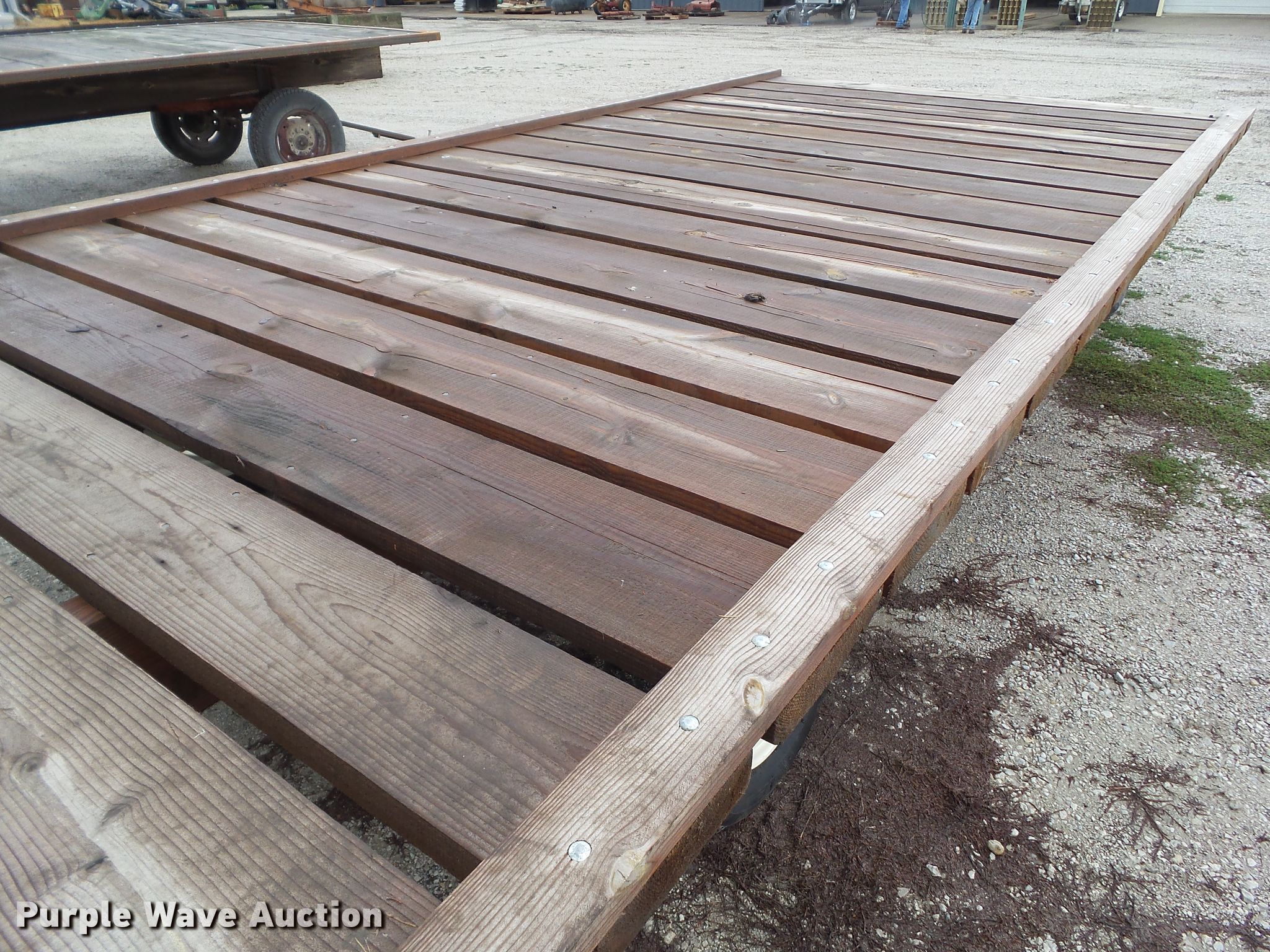 Hay wagon. 16.5'L x 8'W, 2" x 10" wood deck, 5' adjustable tongue, Rear hitch, 205/70R15 tires. Hick Concrete. 20738 H Ave. Perry, IA 50220