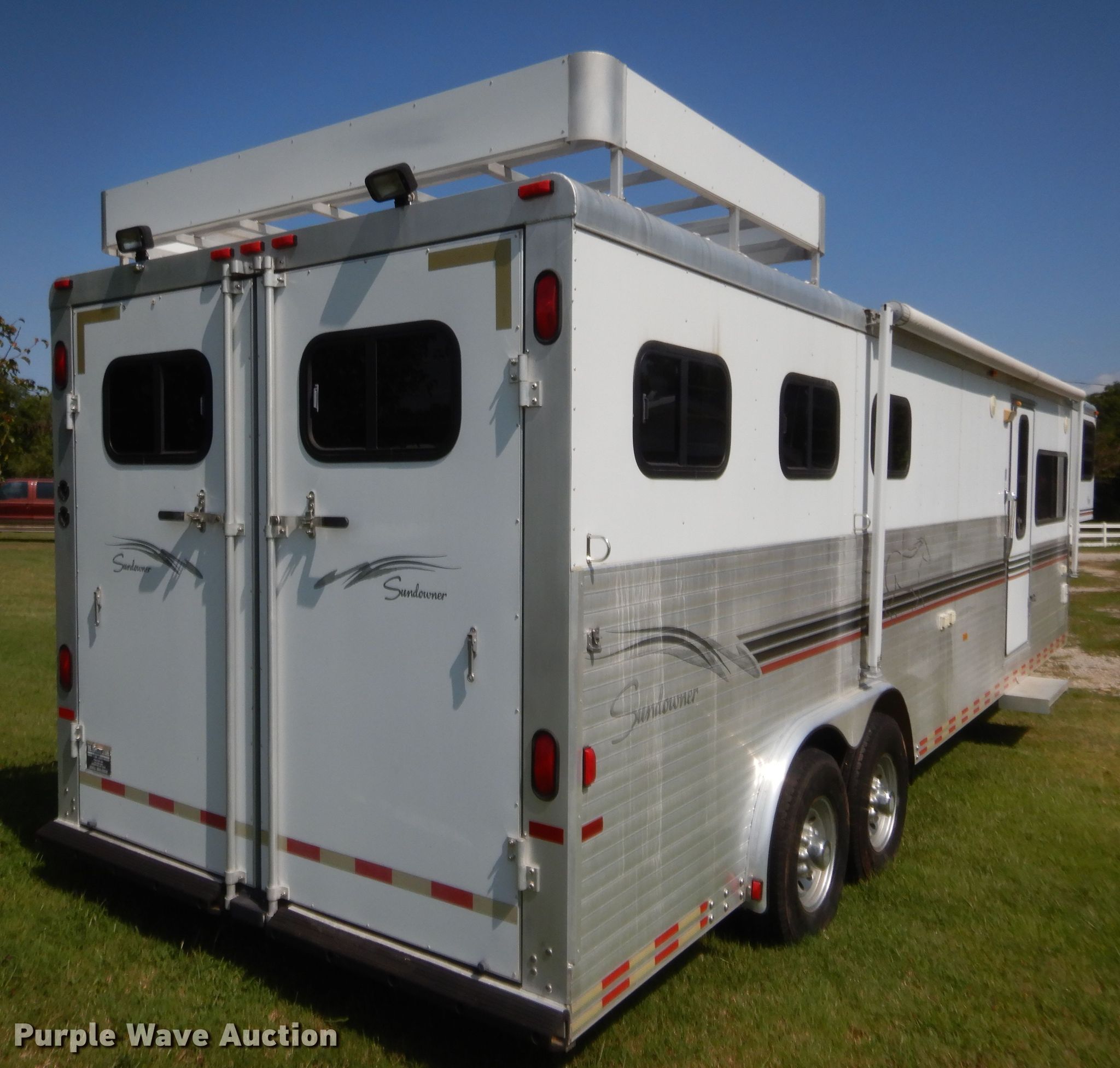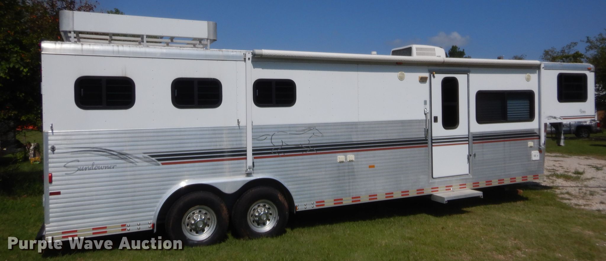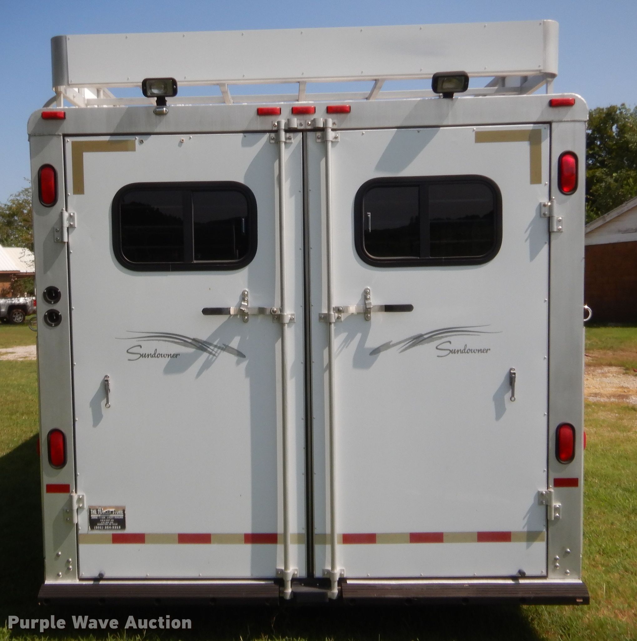Purple Wave is selling a used Livestock Trailer in Oklahoma. This item is a 2000 Sundowner livestock trailer with the following: 35'L x 96"W overall, 27'L x 91"W body, Three horse capacity, (2) center gates, Spring suspension, Electric brakes, Tandem axle, 7.50R16 tires, GVWR 17,500 lbs