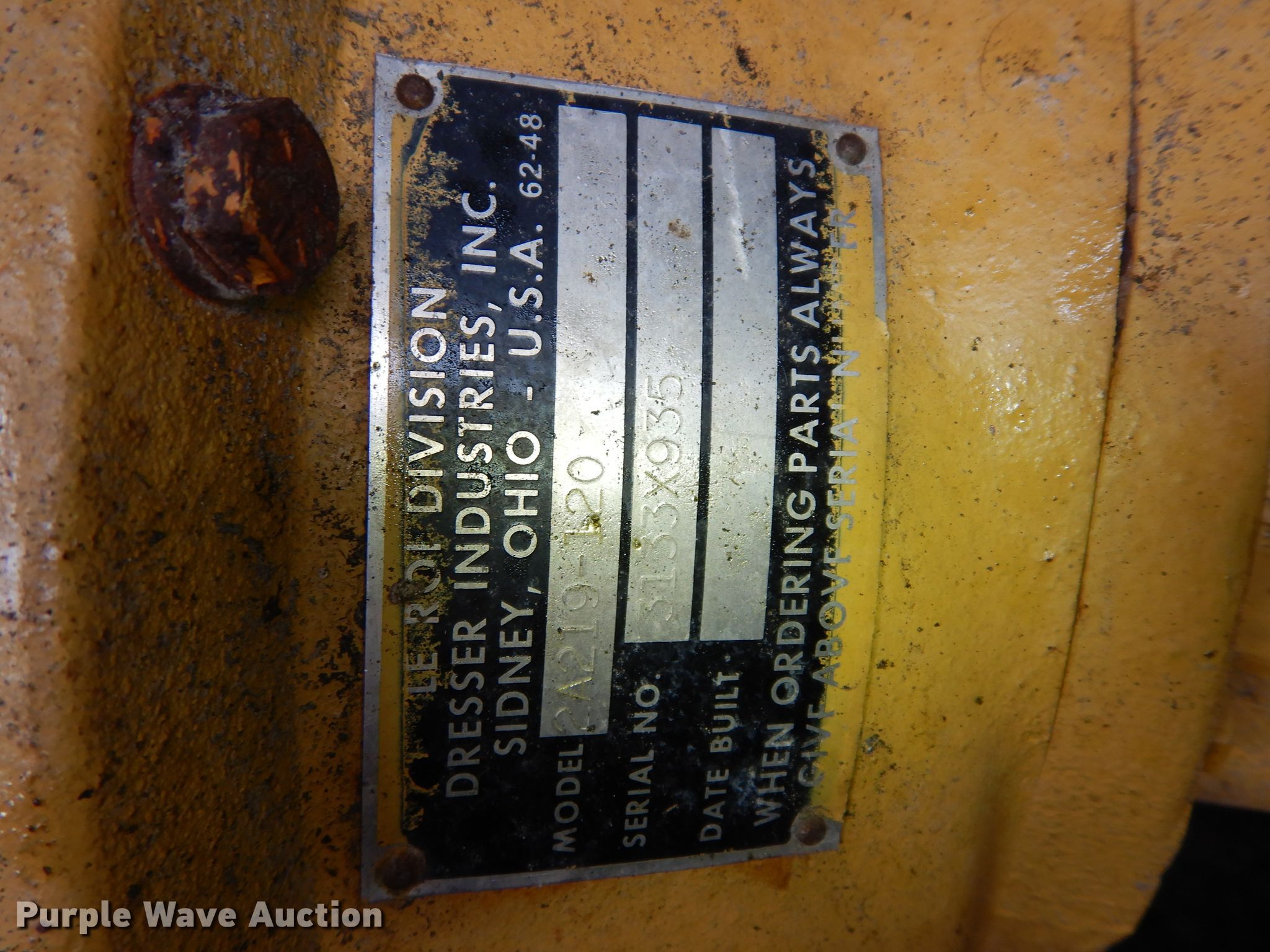 Purple Wave is selling a used Air Compressor in Kansas. This item is a 1988 Leroy Dresser 185 air compressor with the following: 2,432 hours on meter, Serial: 3133X935, Unit #: 3220