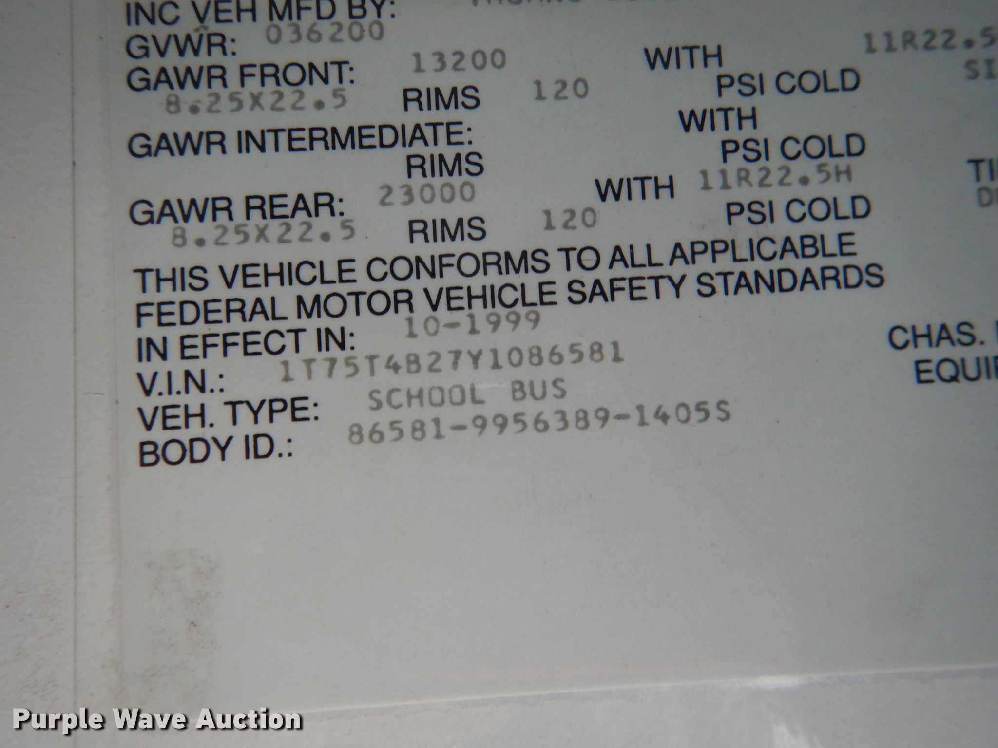 Take a look at this used 2000 Thomas 1405S school bus being sold on October 14th, 2020 in the SOLD! October 14 Vehicles and Equipment Auction made by Thomas. Take a look at all of the item information below or take a look at similar auctions for Transit Vehicles.