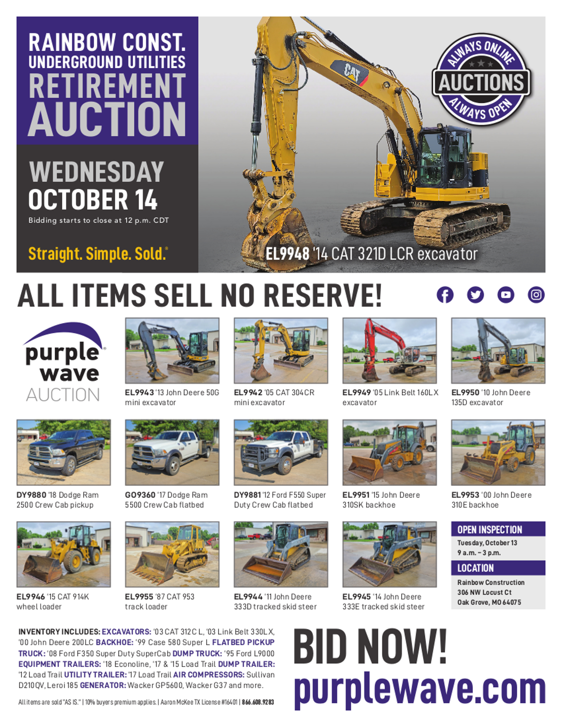 SOLD! October 14 Rainbow Construction Underground Utilities Retirement Auction